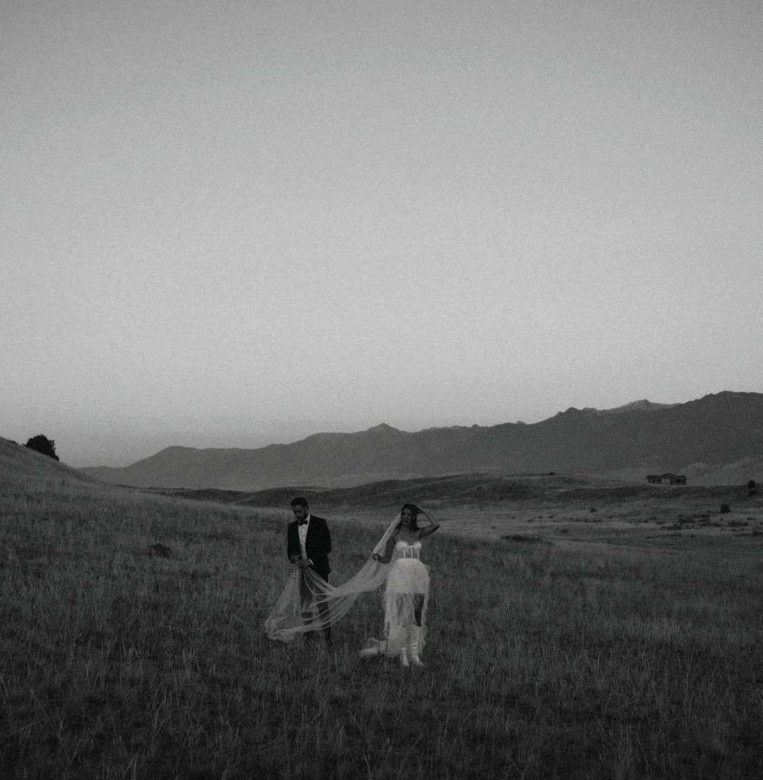 “I was so excited as I walked outside in a simple dress, bare feet and wavy lake hair, and saw Eli standing there. It was all so surreal grabbing his hand and walking through the tall grass to the highest point in the field. The sun was just setting, the mountains were vibrant and pink and I was about to marry the love of my life,” Kayla reminisces. With the sun quickly setting over the horizon, Kayla and Eli naturally hopped on their motorcycle and raced off to chase it down in the distance.