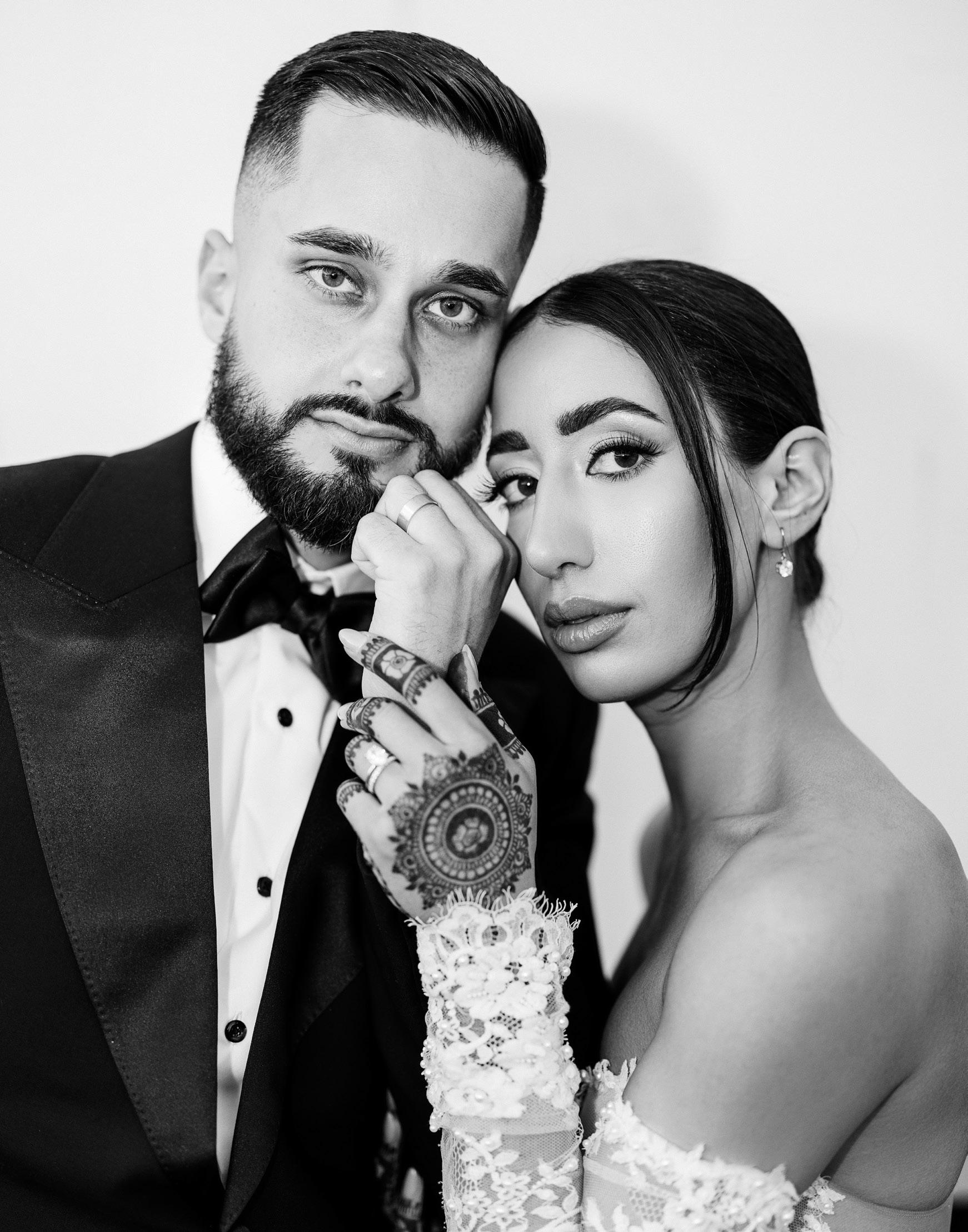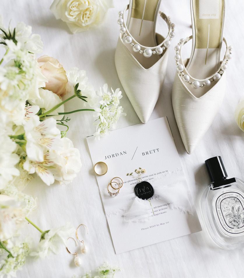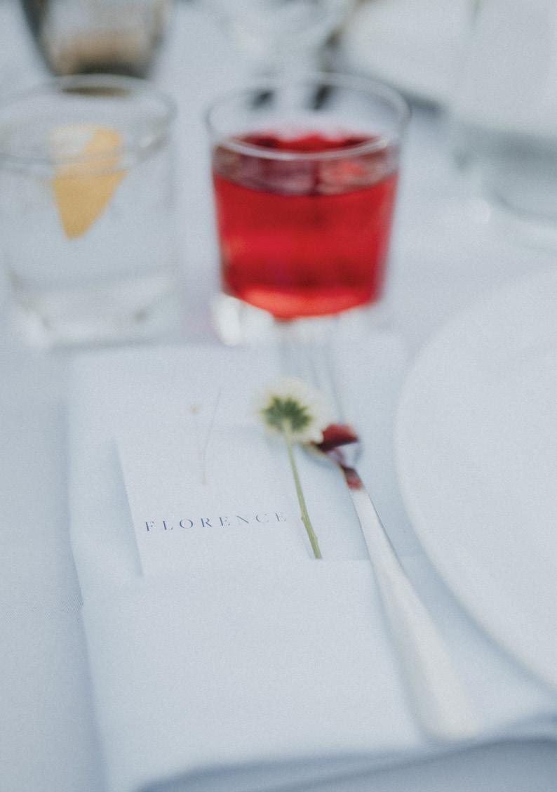 In keeping with the monochromatic nature of Simone’s designs, Our Little Flower Company created a white arrangement of roses, chrysanthemum and baby’s breath to effortlessly complement hand-cut floral appliqué and delicate lace on the bridal gowns from Everly Fine Bridal. Simone styled the gowns with her Augustina line, that feature hand-dipped wax florals to create a modern, minimalist twist on the french tradition of wearing wax flowers on your wedding day. The Zinnia Hair Pins, which are hand beaded with precision cut glass beads mimic baby’s breath add an elegant, subtle detail to the hair.