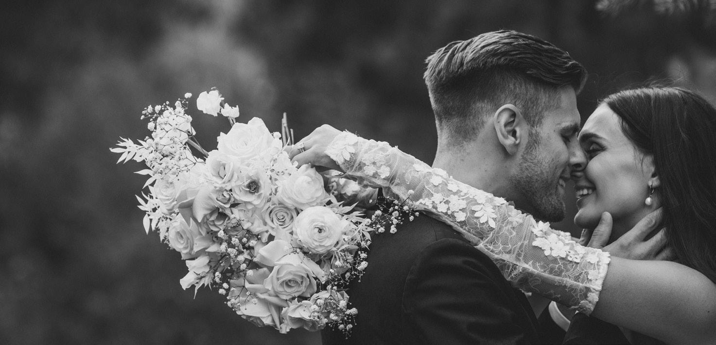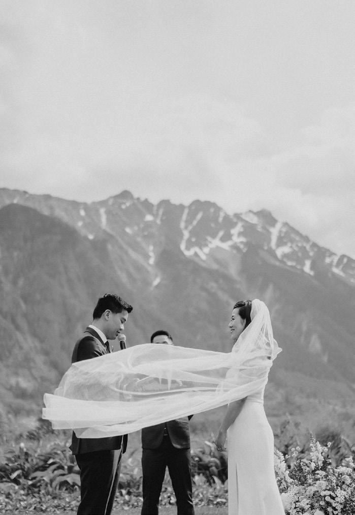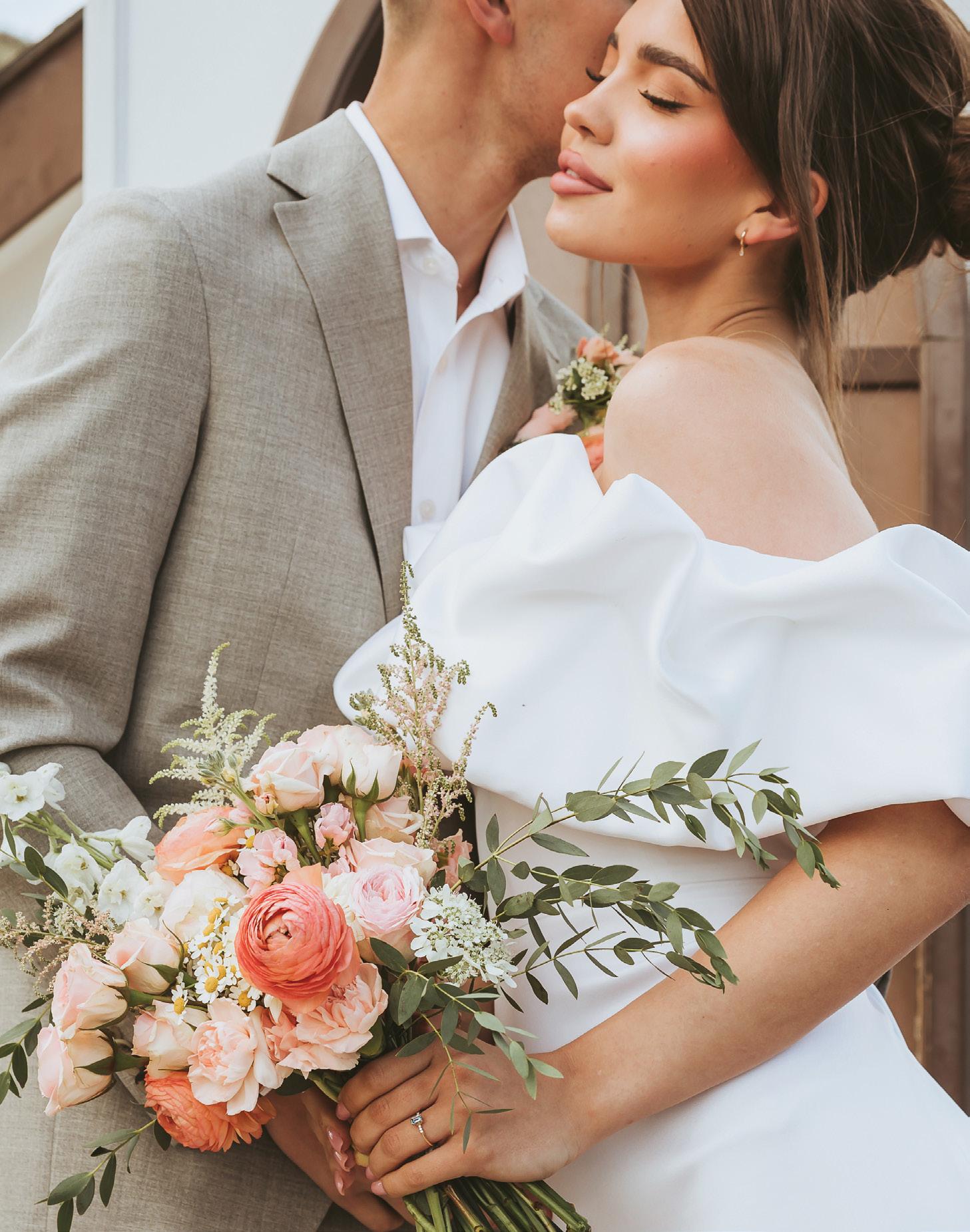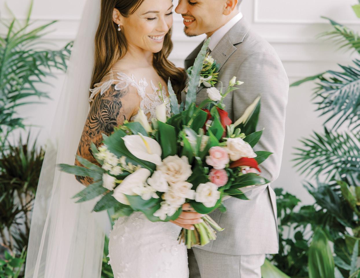 Revel Photography captured the ceremony set amid an abundance of tropical flora and fauna inside the Studios at Vic Park. Located in Calgary’s Victoria Park, the studio is a loft event space with floor-to-ceiling west-facing windows that are ideal for intimate and naturally lit nuptials. The bride stunned in a fairytale-like, garden gown from Calgary's Blush & Raven Bridal Boutique designed by Daalarna, with the romantic yet modern bride in mind, while the groom wore a tailored grey suit from Ed Williams Mens Wear.