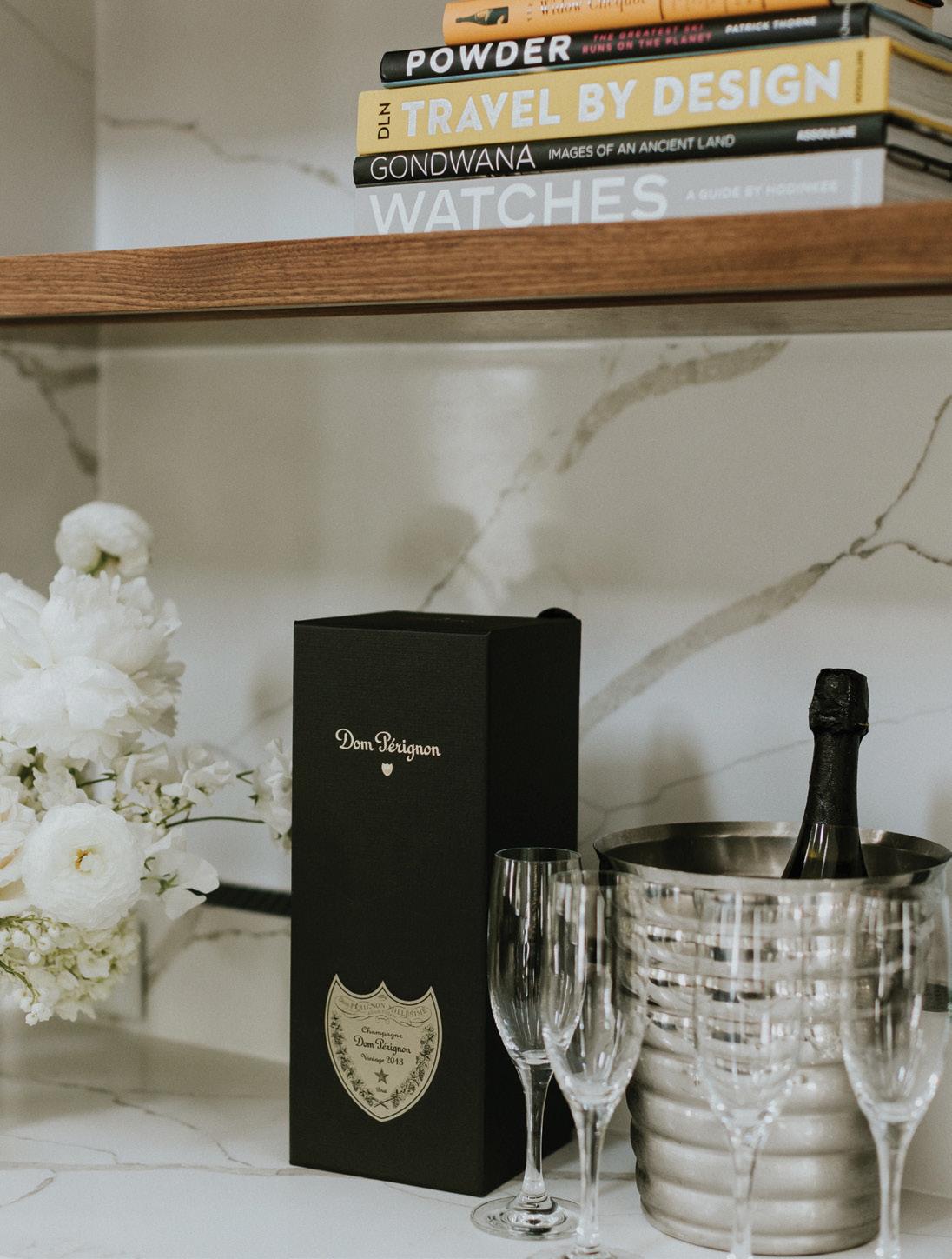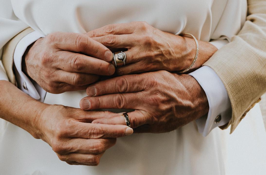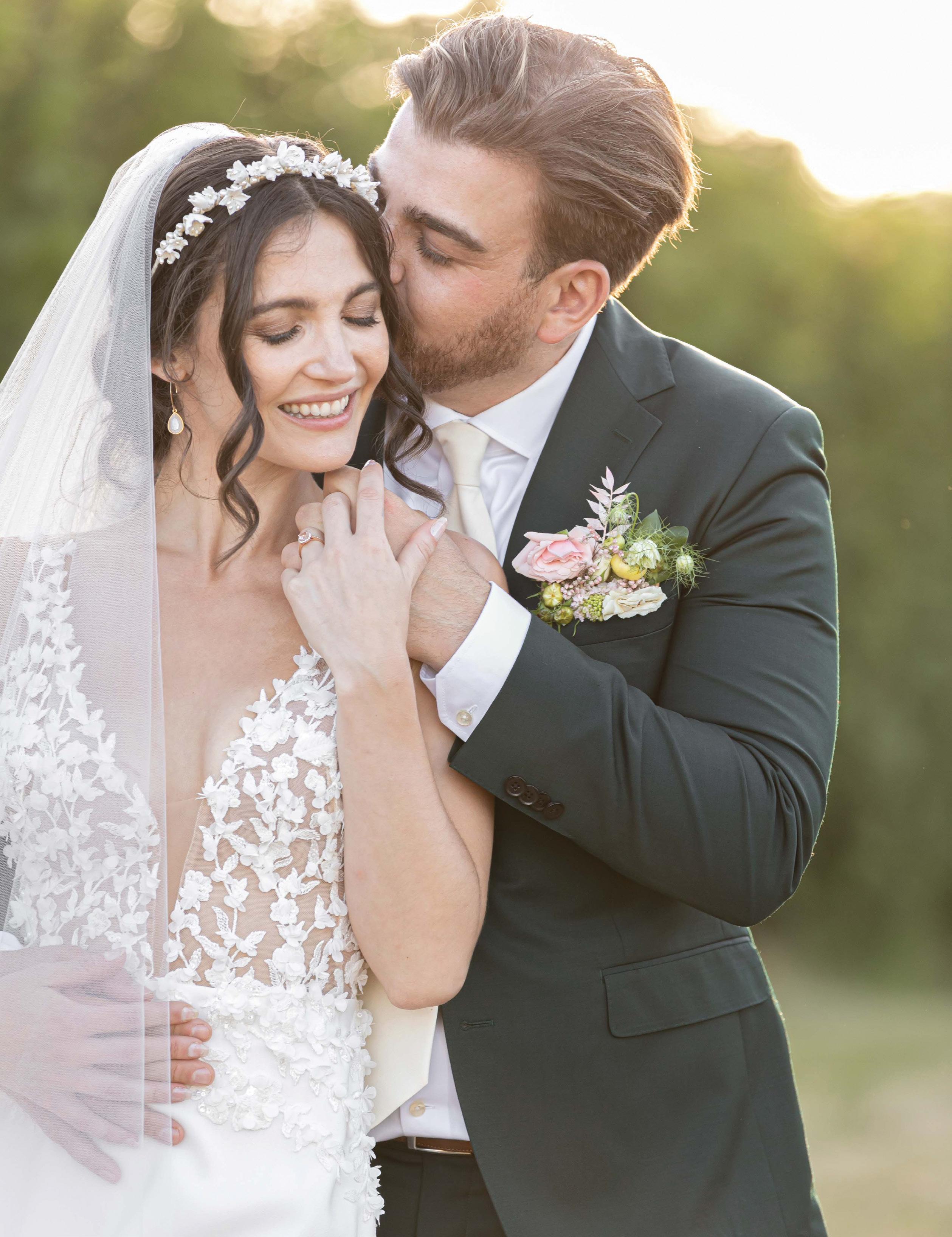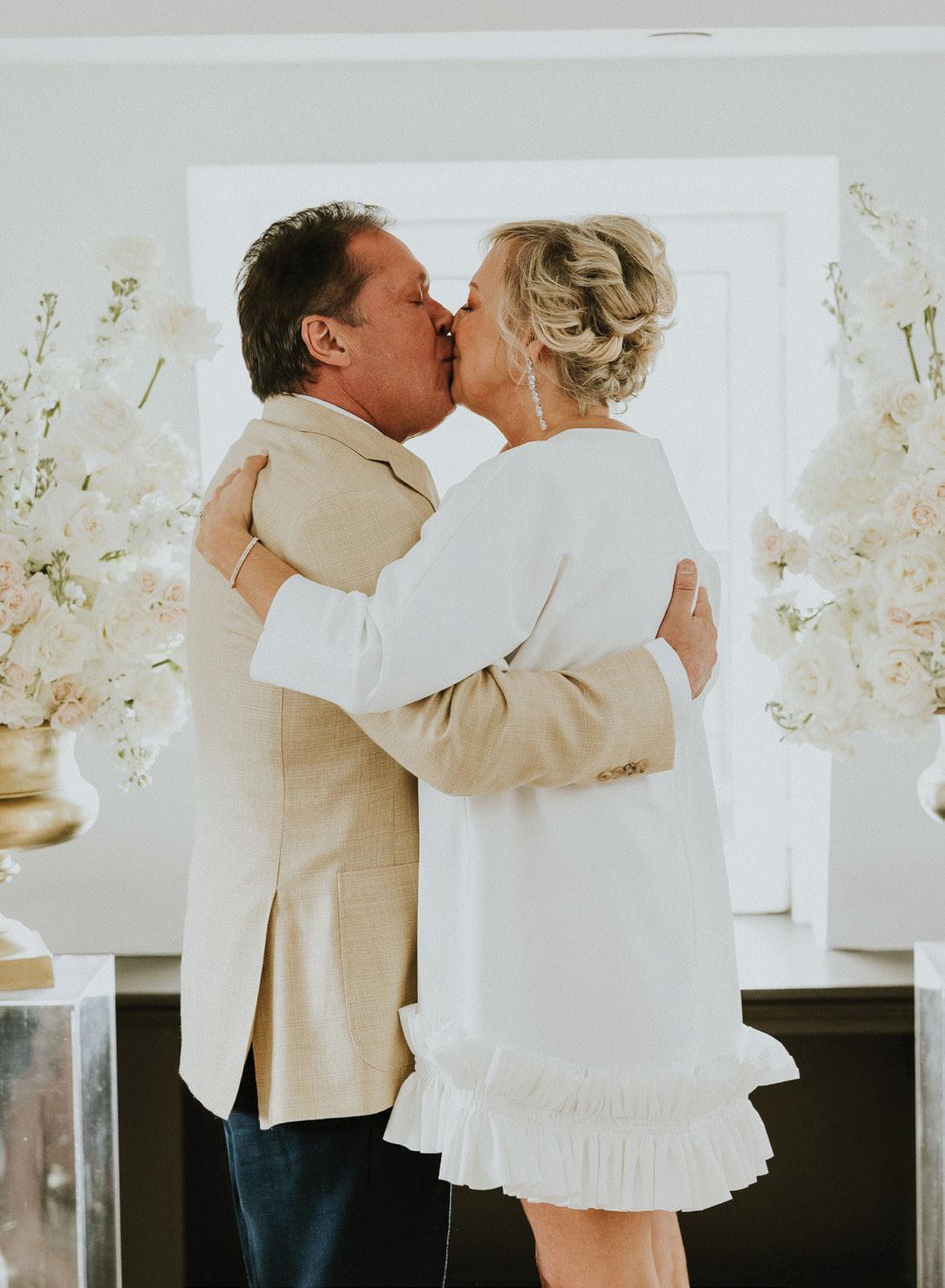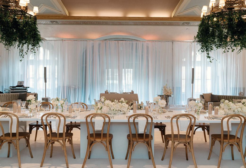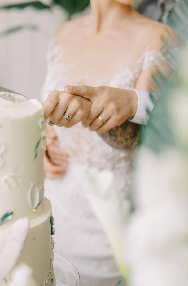 Classic yet bohemian elements were added to the island-inspired reception, such as wooden dining chairs with airy rattan detailing. The tables were adorned with a mix of low arrangements of greens in gold vases, while the glassware and linens kept a low profile, but reinforced the aloha spirit. The couple cut into a two-tiered minimalist cake featuring handpainted buttercream flowers, accented with edible gold paint and foil. The flavours inside were anything but boring, consisting of roasted strawberry and sumac and toasted coconut.