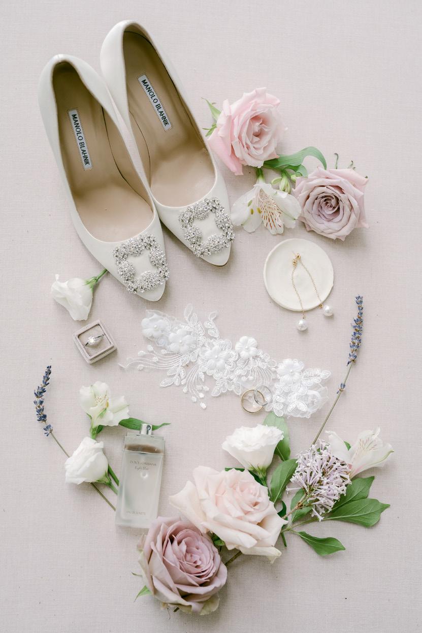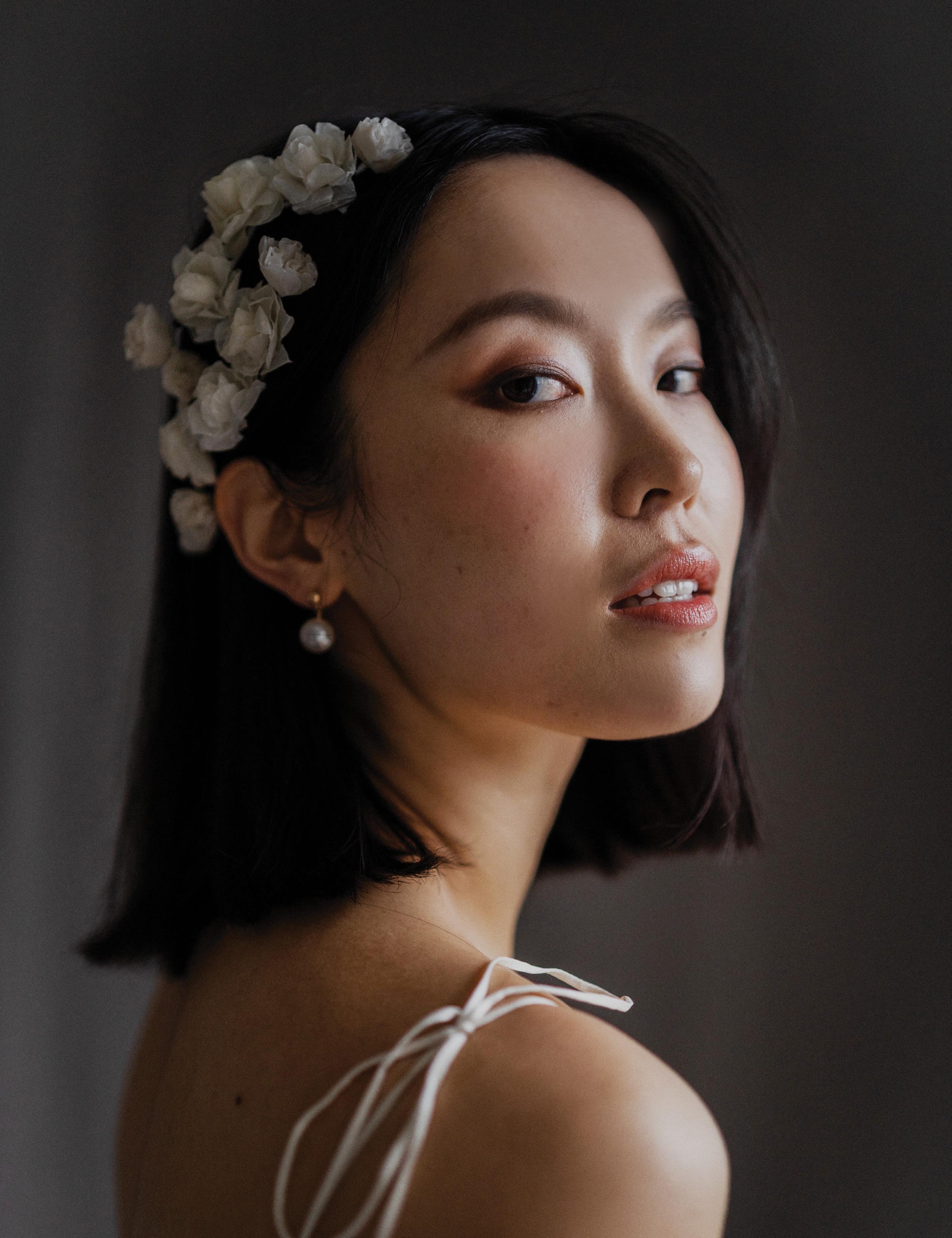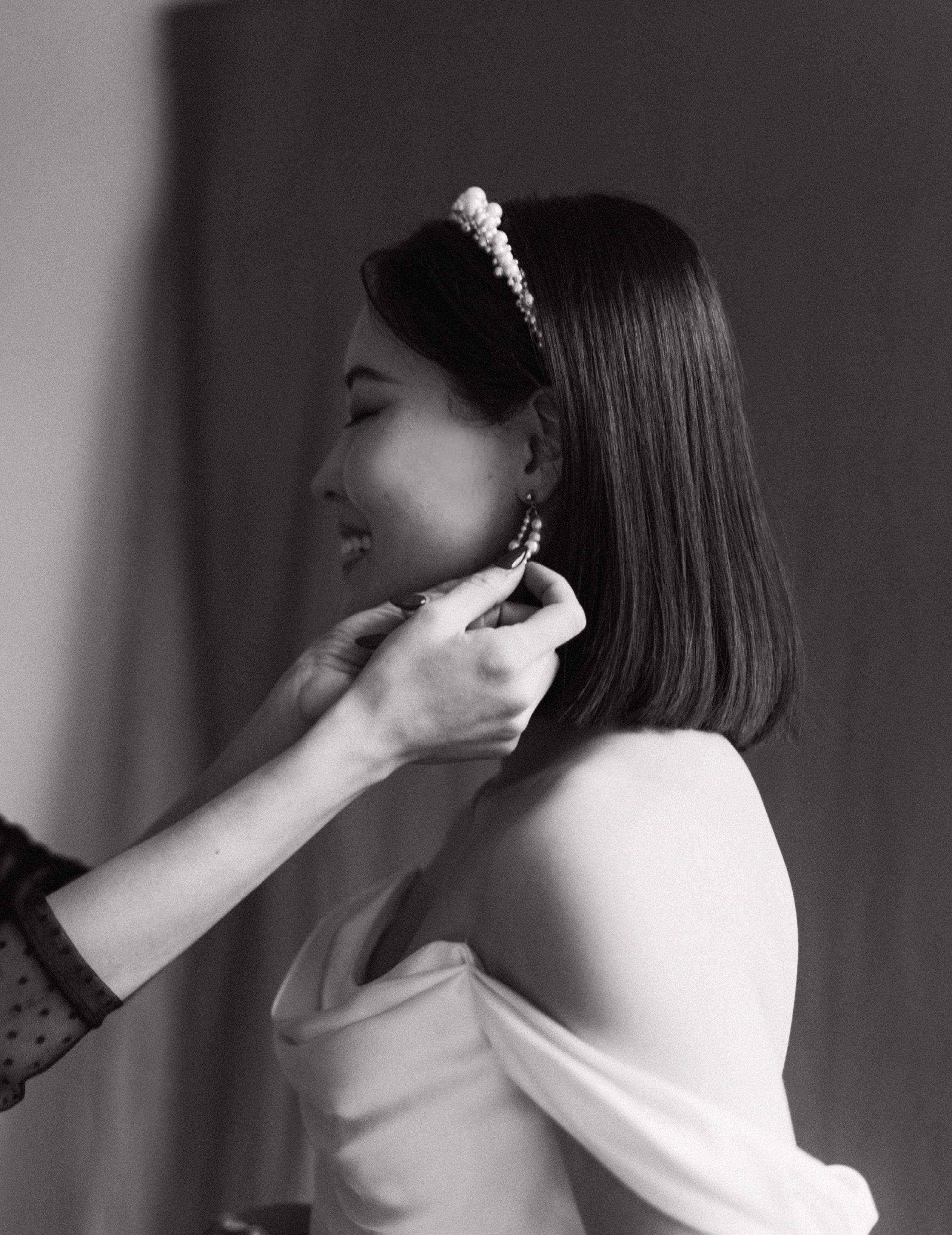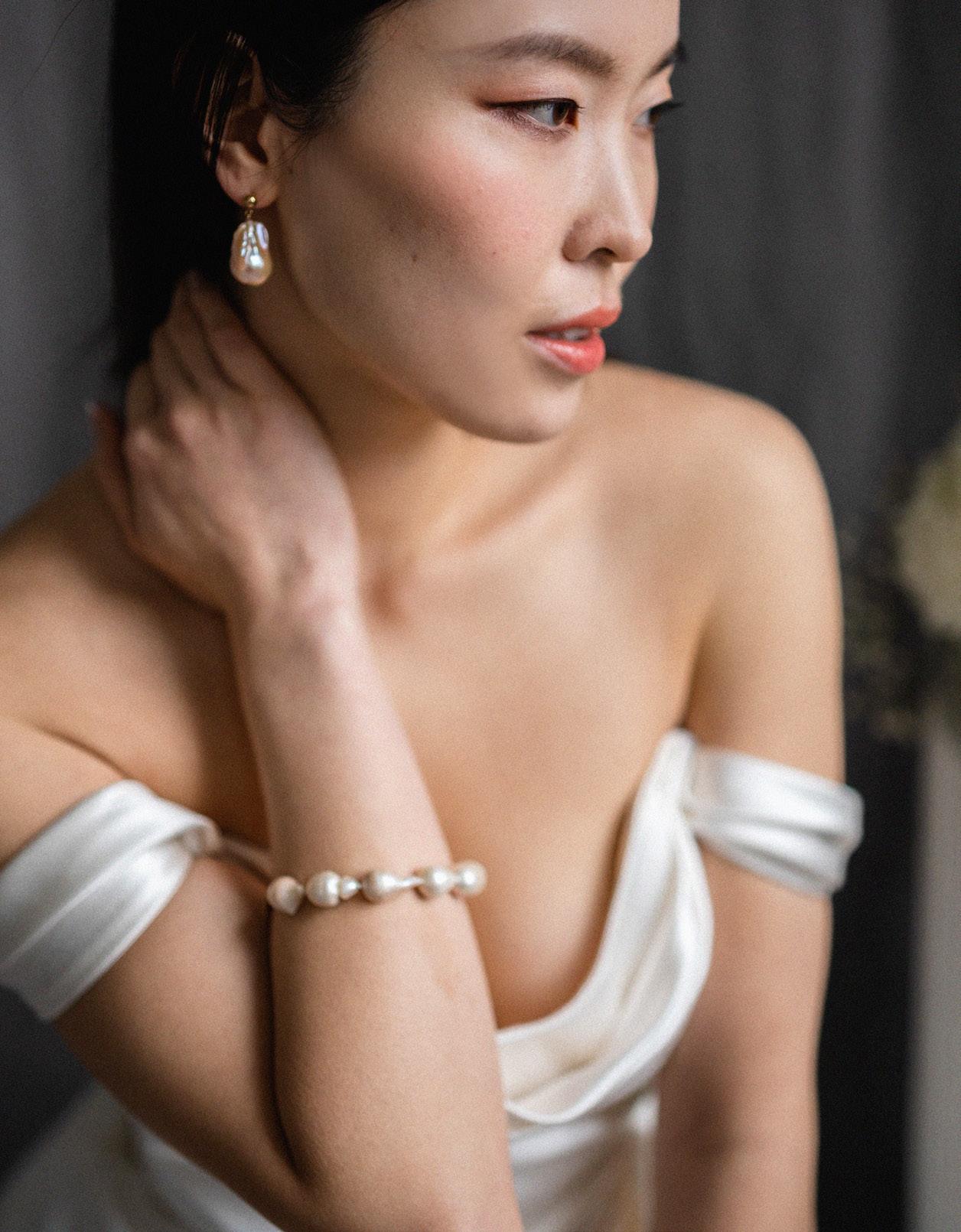 The juxtaposition of her brand is her defiance of tradition, while utilizing the most time-honoured wedding adornment - the pearl. From carefully sourced freshwater baroque in light pastels, to hand-crafted Austrian crystal, Simone’s collections are dripping in pearls. With a strong focus in honouring individuality in bridal, she chooses unique pearls that are never the same, giving brides something truly original on their wedding day. The primrose colour of her Douglas earring and lilac hue of her Lilia earring glisten against Everly’s draped silk gown.