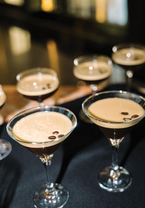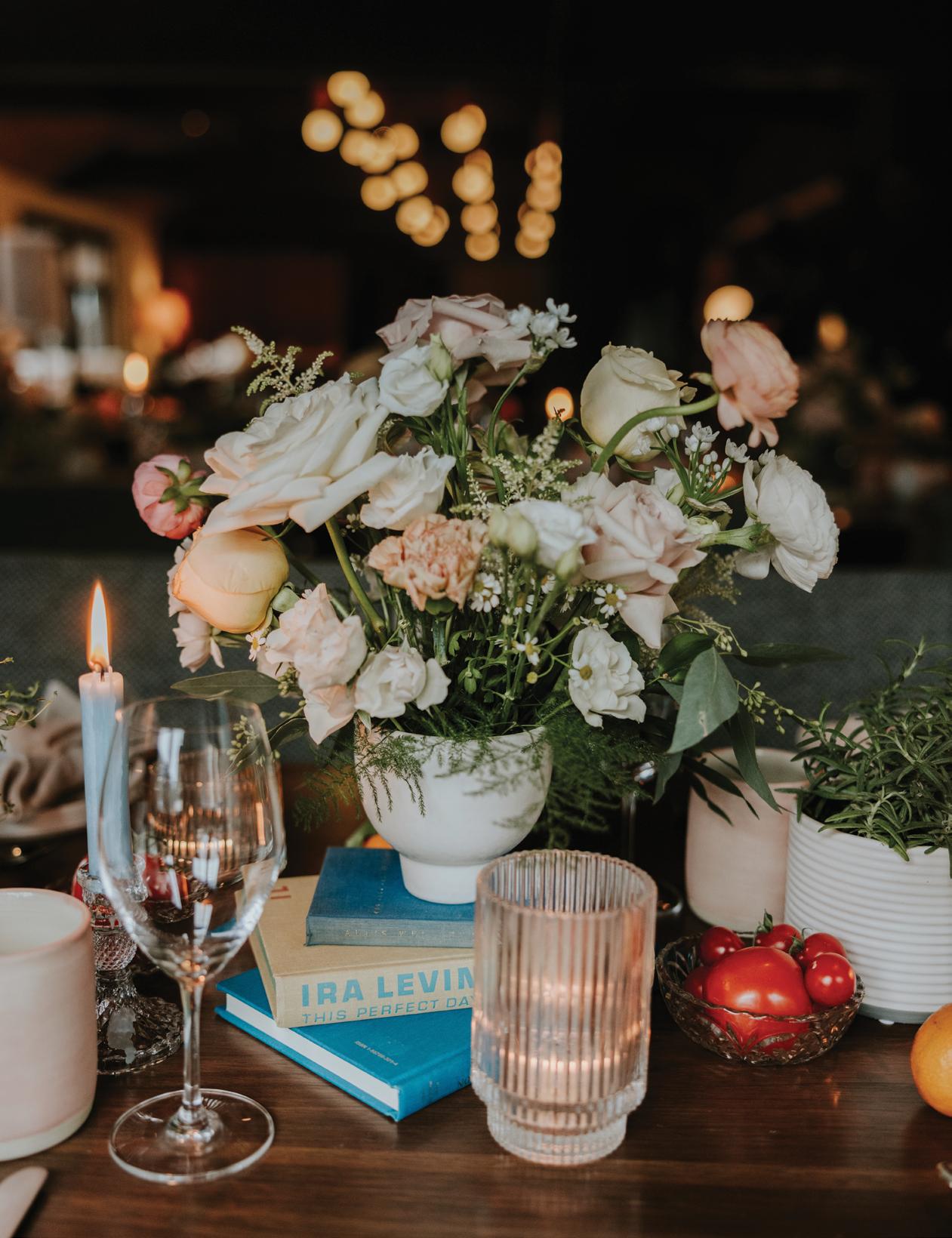At the heart of the design are colourful garden tablescapes, where a mix of marigolds, cosmos, dahlias and fresh herbs creates a striking display in hues of orange, blush pink and green. Gold tableware and layered candlelight from Mountain Event Rentals elevate the ambiance, adding warmth and depth to the evening. For dinner, guests are treated to a fire-roasted chicken entrée, perfectly paired with steakhouse potatoes, grilled broccolini and a rich mushroom jus. The meal is complemented by Bluebird’s signature Passionfruit Marg, a vibrant blend of Espolon Blanco tequila, mezcal, Park Chili vodka, passionfruit, pineapple, chili and lime, adding a bold yet refreshing kick to the evening’s festivities.