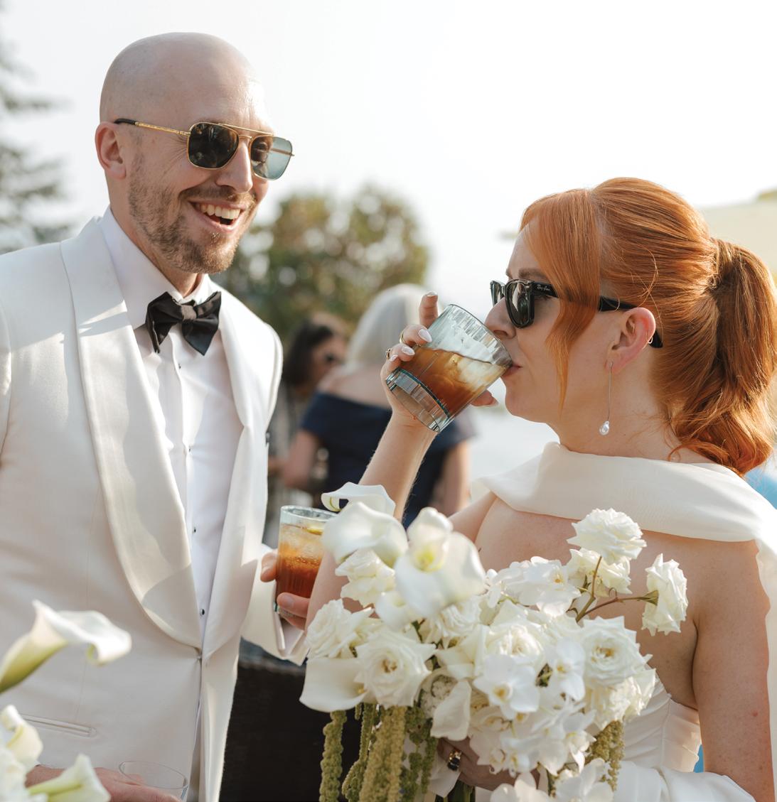 Stefanna and Scott tied the knot in a stunning ceremony in Stefanna’s parents’ backyard, fulfilling a dream she’d had since moving there at age 13. The couple’s “sexy grotto” aesthetic came to life with elegant details, such as lush, out of this world florals by Blooms by Bridgeland. Stefanna wore a striking Stephane Rolland gown from Mark Ingram Atelier, paired with a veil made by Scott’s mom using pearls from Stefanna’s mother’s wedding dress. One of the most meaningful touches of the day was the involvement of their grandparents—Stefanna’s Nonna lovingly handmade all the pasta shells for the dinner’s pasta course, while Scott’s grandmother penned the dinner menus, complete with a charming little illustration. After exchanging their heartfelt private vows, the celebration continued with a chic reception at Hotel Arts, where espresso martini carts and a family-style Italian dinner delighted their 215 guests.