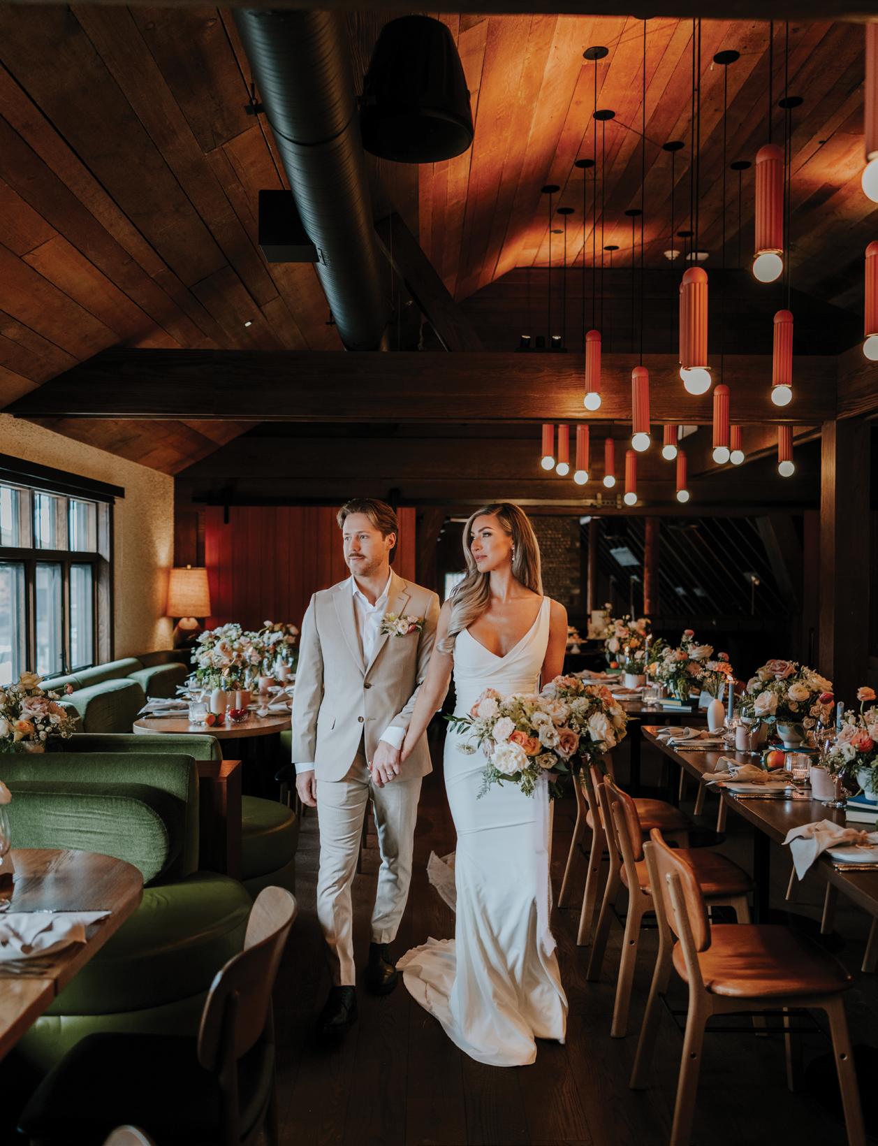 With a nod to sleek mid-century modern lines and the warmth of mountain design, this styled shoot, designed by Signature Weddings By Ashley, redefines modern wedding aesthetics. The day begins at The Malcolm Hotel, a luxurious property located in the heart of Canmore, where the couple gets ready surrounded by breathtaking mountain views. Set against the stunning backdrop of Banff, Bluebird Woodfired Steakhouse provides the perfect reception venue for a celebration infused with sophisticated Alpine charm. The bride is styled in a timeless Chosen by KYHA Studios gown with a feminine pearl veil designed by Daphne Newman and a soft spritz of Kindred Glow & Co. perfume, adding a signature scent to her bridal look. Meanwhile, the groom wears a tailored tan suit by RW&CO.