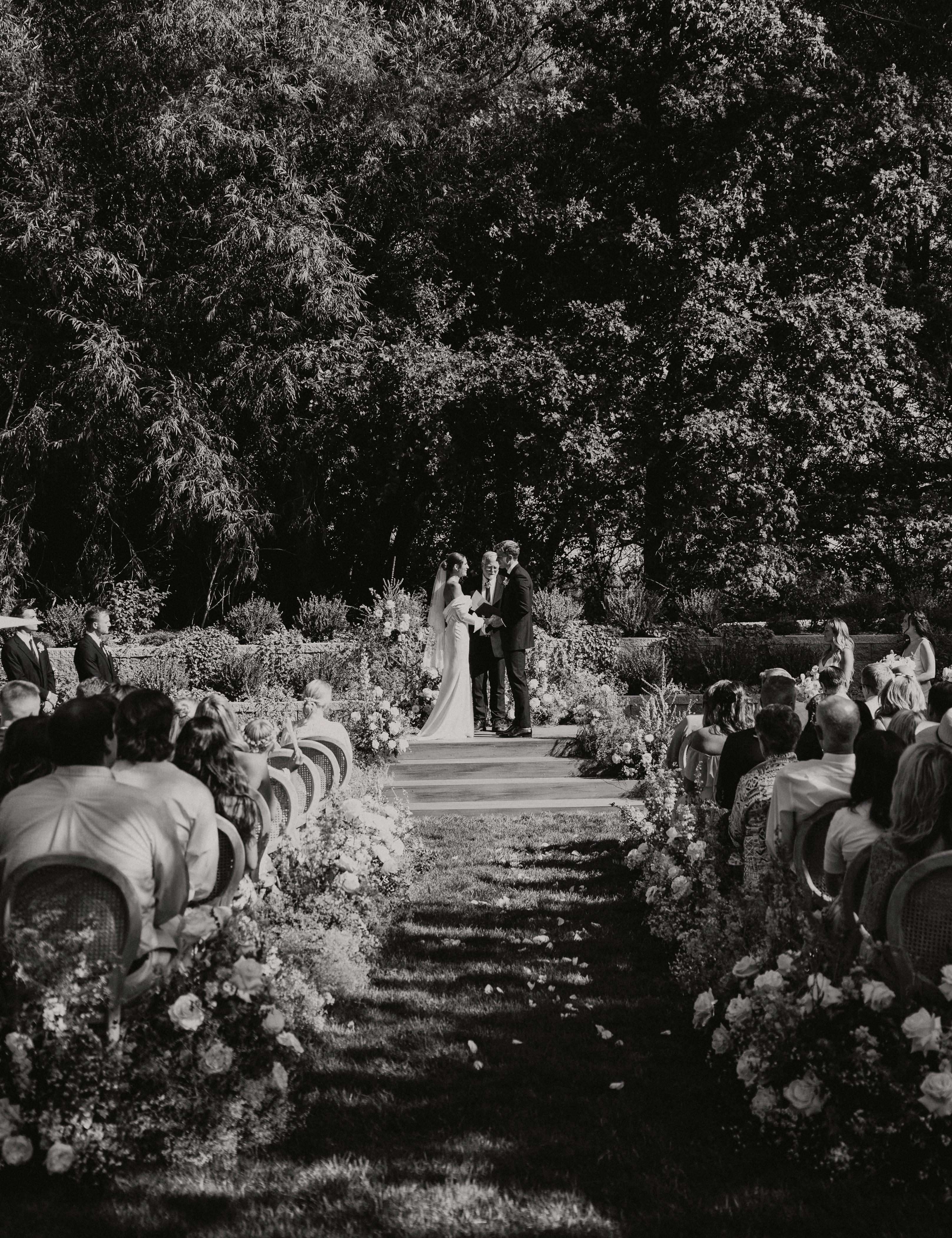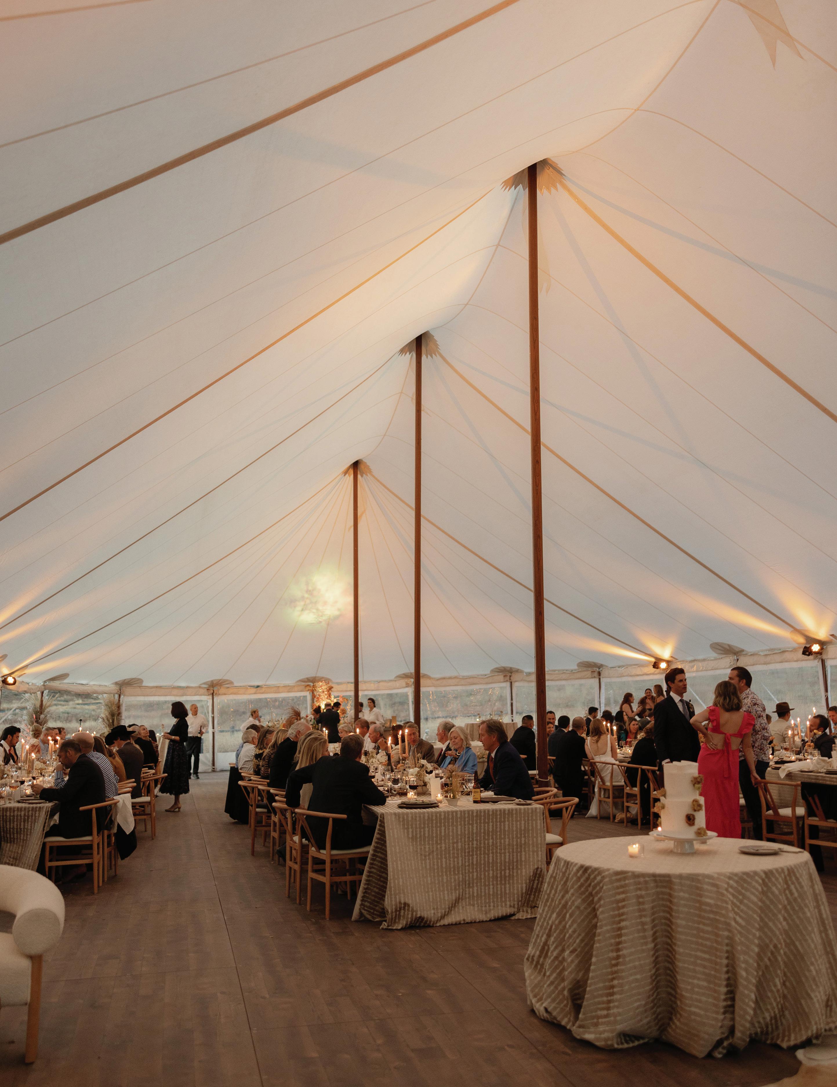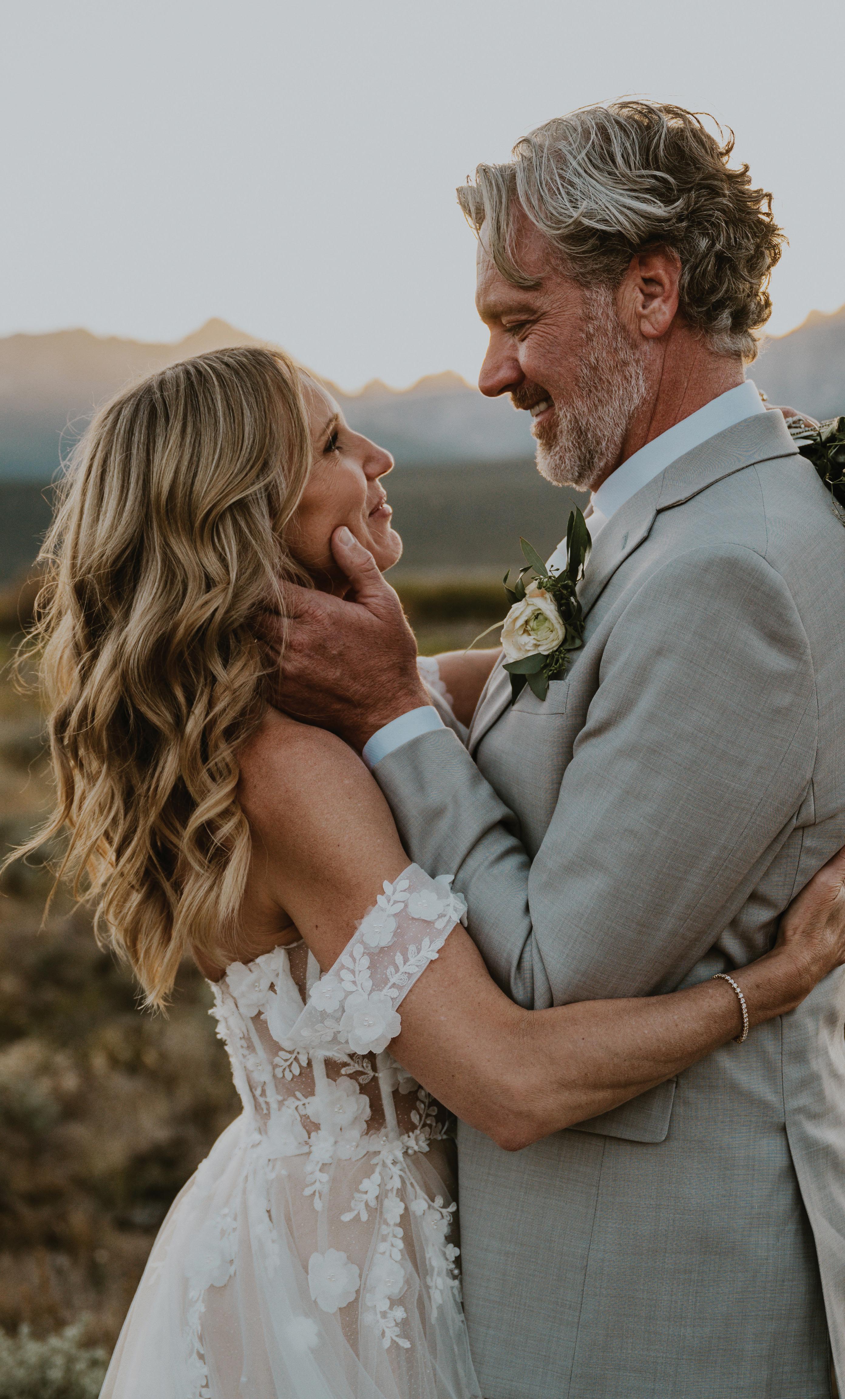 With the mountain peaks serving as a picturesque backdrop, Grace and Joe said “I do” in the same location his sister did ten years prior. And, to make the moment even more memorable, his sister officiated their wedding just as Joe did for her. Florist, Kacie of Bloom Theory, adorned the aisle with floral arrangements inspired by the rich colors of autumn while guests witnessed their vows upon natural wooden benches. Kacie shared, “Different grasses were foraged from the area to make sure it felt organic and blended with the scenery. The property was in the perfect state of seasonal transition, so we captured that palette and added pops of color with golden mustard roses, dahlias and limelight hydrangeas.” Afterward, the newlyweds celebrated with their family and friends in an open-air tent so guests could enjoy the incredible views and weather. The elongated reception tables were adorned with stunning linens, place settings and florals of creamy natural hues which allowed the couple and scenery to be the focal point of the evening.
