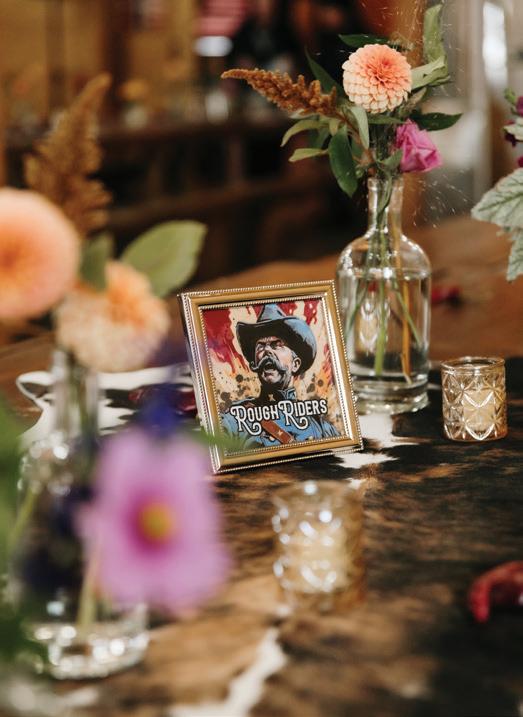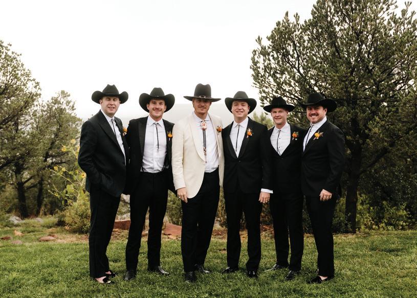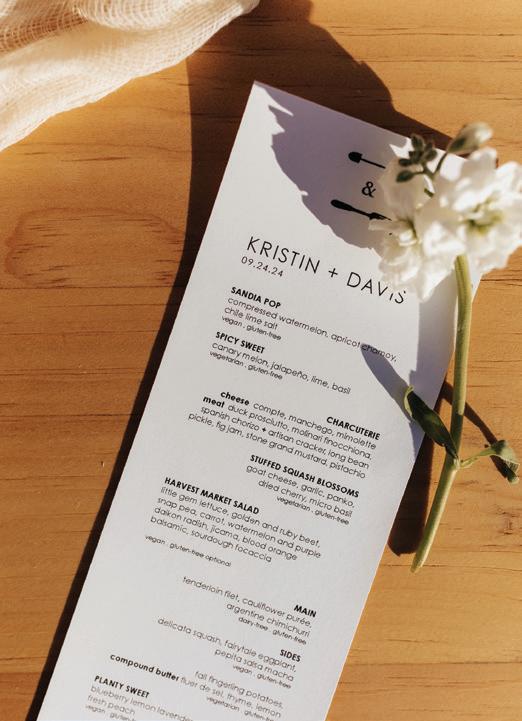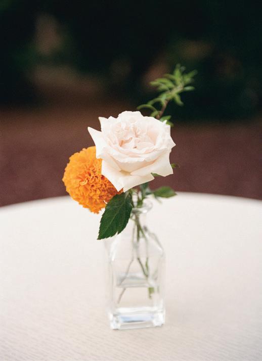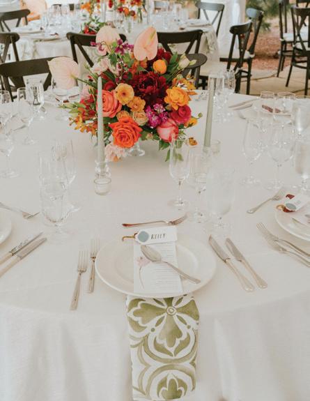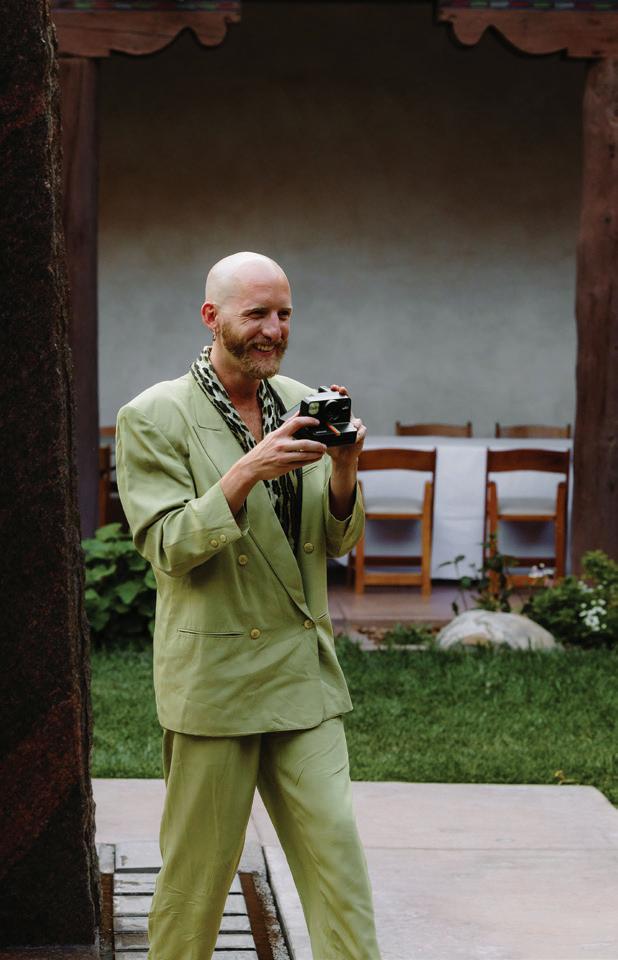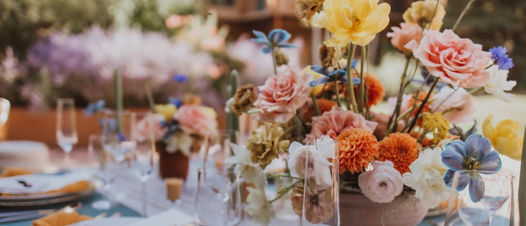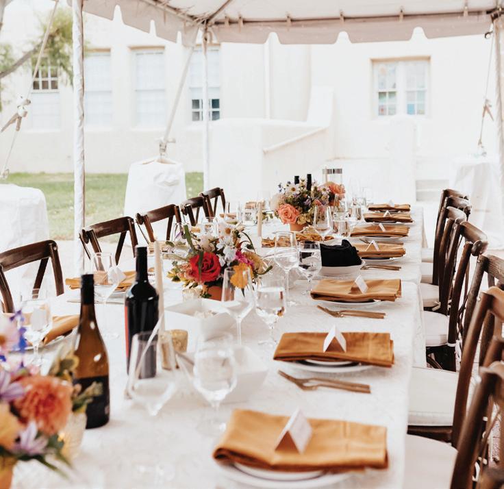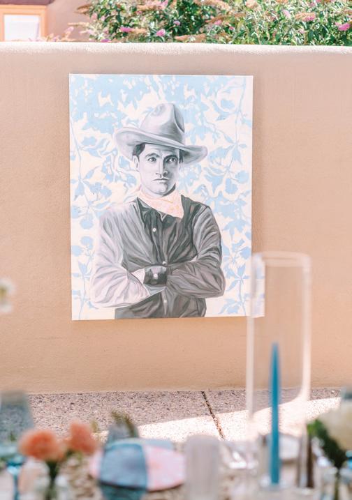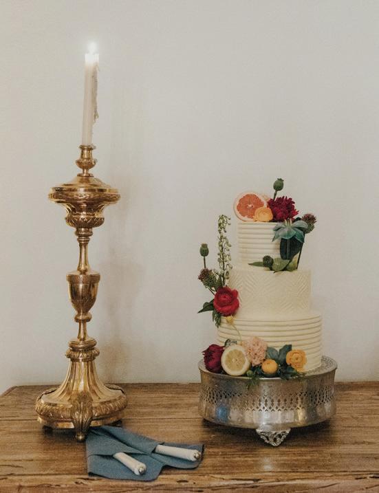 When it came time to say “I do,” Los Poblanos felt like the perfect fit. With its lavender fields, charming alpacas and peacocks, the property offered the playful, summer-campmeets-art-retreat vibe the couple was after. The design vision, executed by Floriography, was both bold and unexpected. Vibrant citrus fruits mingled with fresh florals and whimsical vintage details, bringing a sense of humor and imagination to the entire event. The tablescapes were a true visual feast: yellow patterned linens, sculptural arrangements bursting with poppies and peonies, fruit place cards, and vintage-style oilcloth elements paired with blue napkins and delicate menus. Their fashion choices echoed the playful spirit of the design. Alice wore a jaw-dropping 1970s sequin gown from Happy Isles for the ceremony and later changed into a vintage fringe dress and ballet slippers for dancing. Meanwhile, Jeff scooped up some looks in Denver, Colorado, on their drive down from Wyoming just days before the wedding weekend. To end the evening on a sweet note, guests indulged in a cake adorned with bright slices of lemon, lime and ruby red grapefruit.