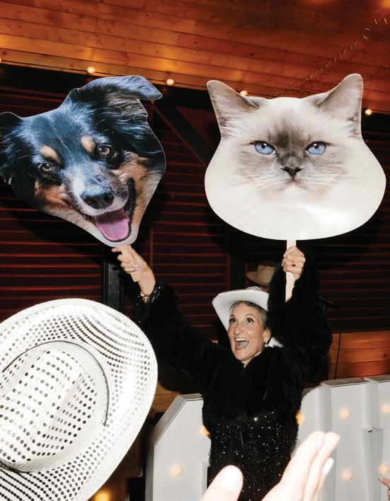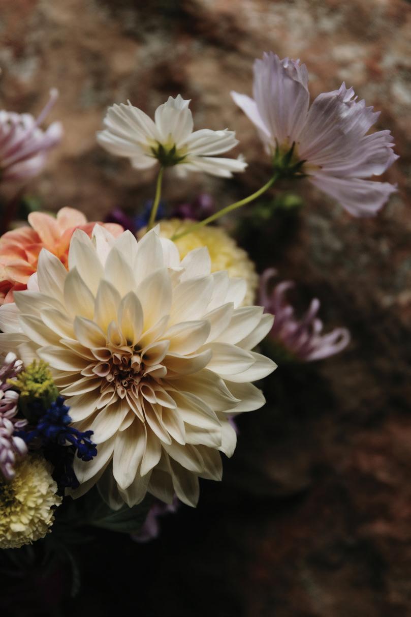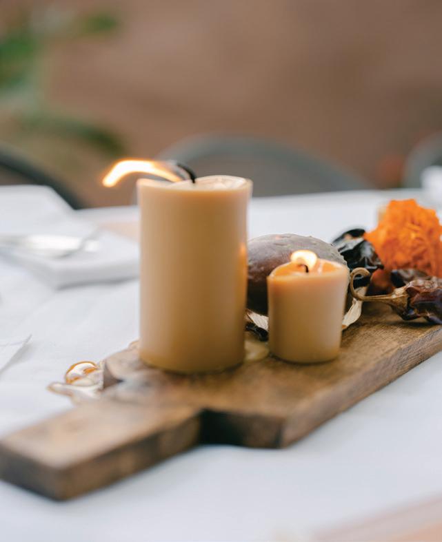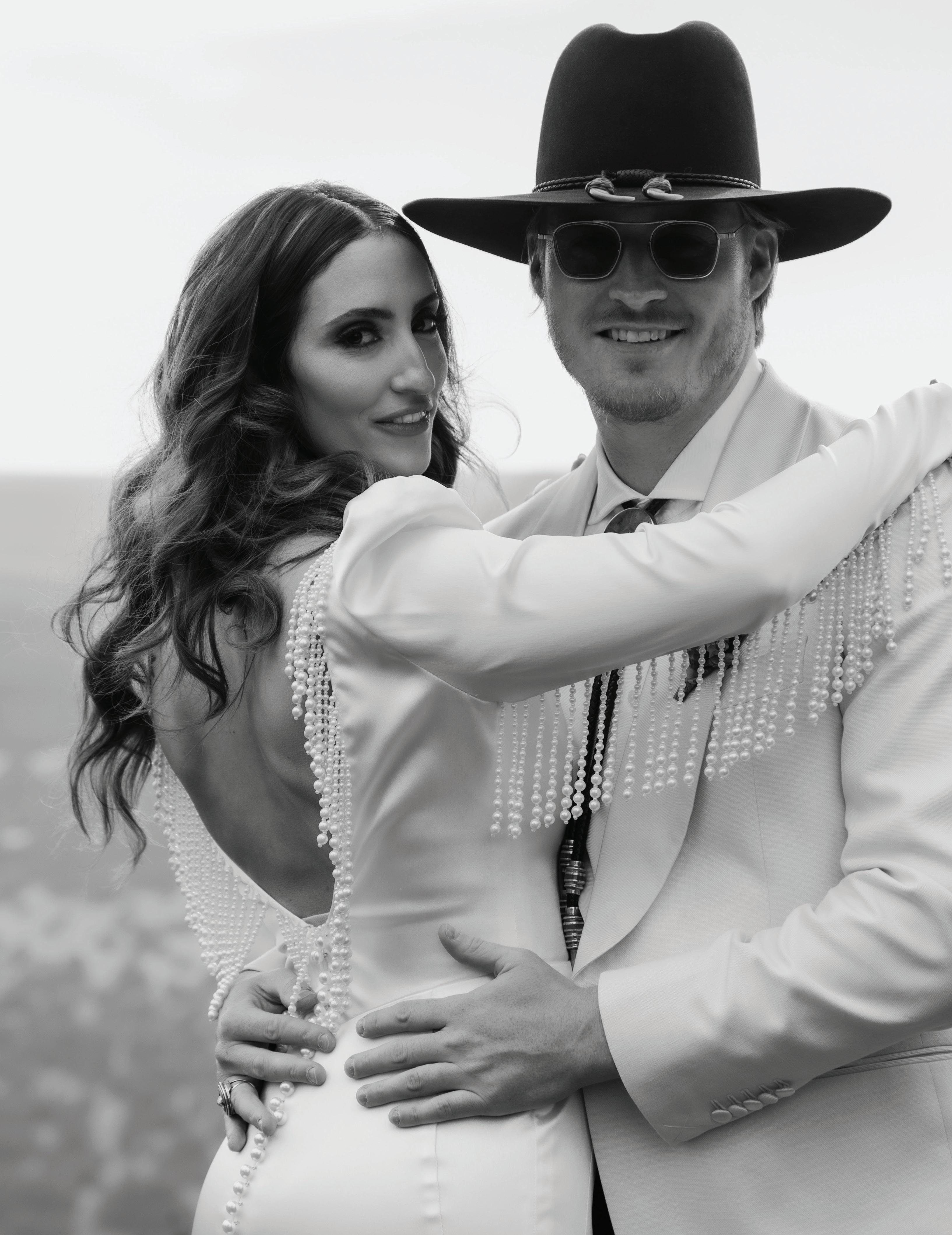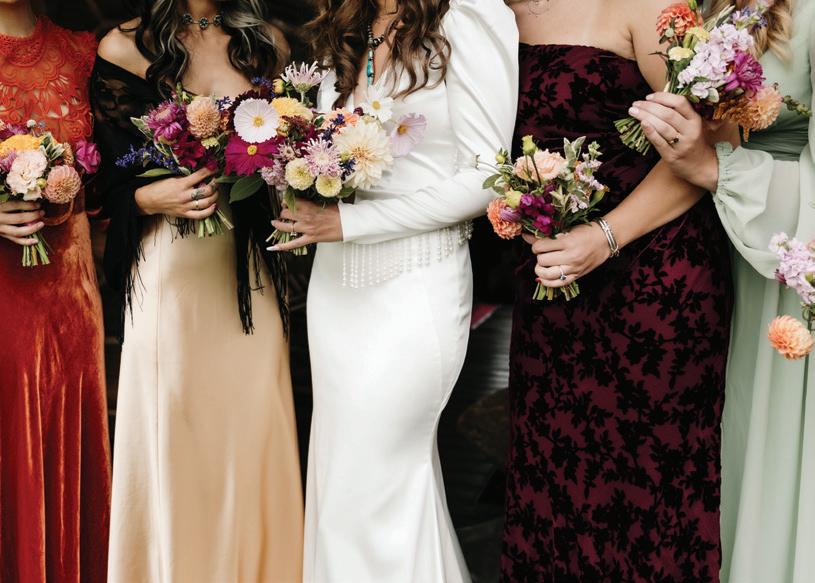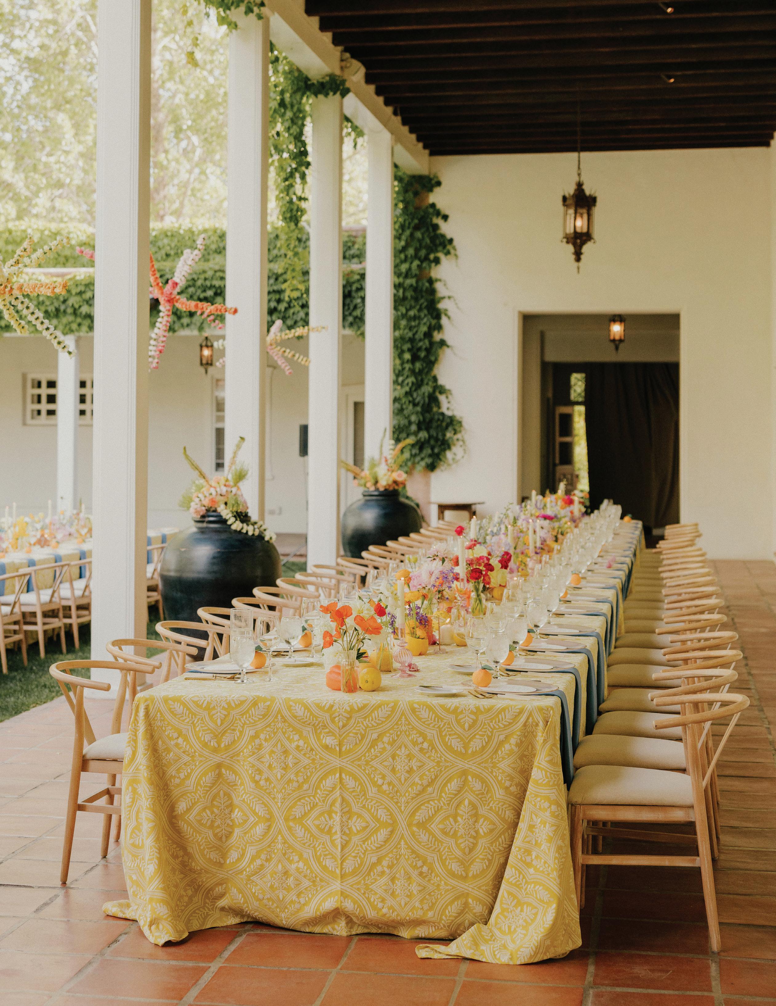 When it came time to say “I do,” Los Poblanos felt like the perfect fit. With its lavender fields, charming alpacas and peacocks, the property offered the playful, summer-campmeets-art-retreat vibe the couple was after. The design vision, executed by Floriography, was both bold and unexpected. Vibrant citrus fruits mingled with fresh florals and whimsical vintage details, bringing a sense of humor and imagination to the entire event. The tablescapes were a true visual feast: yellow patterned linens, sculptural arrangements bursting with poppies and peonies, fruit place cards, and vintage-style oilcloth elements paired with blue napkins and delicate menus. Their fashion choices echoed the playful spirit of the design. Alice wore a jaw-dropping 1970s sequin gown from Happy Isles for the ceremony and later changed into a vintage fringe dress and ballet slippers for dancing. Meanwhile, Jeff scooped up some looks in Denver, Colorado, on their drive down from Wyoming just days before the wedding weekend. To end the evening on a sweet note, guests indulged in a cake adorned with bright slices of lemon, lime and ruby red grapefruit.