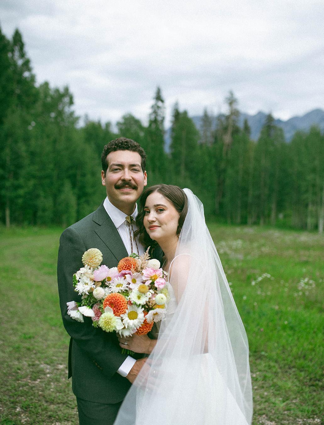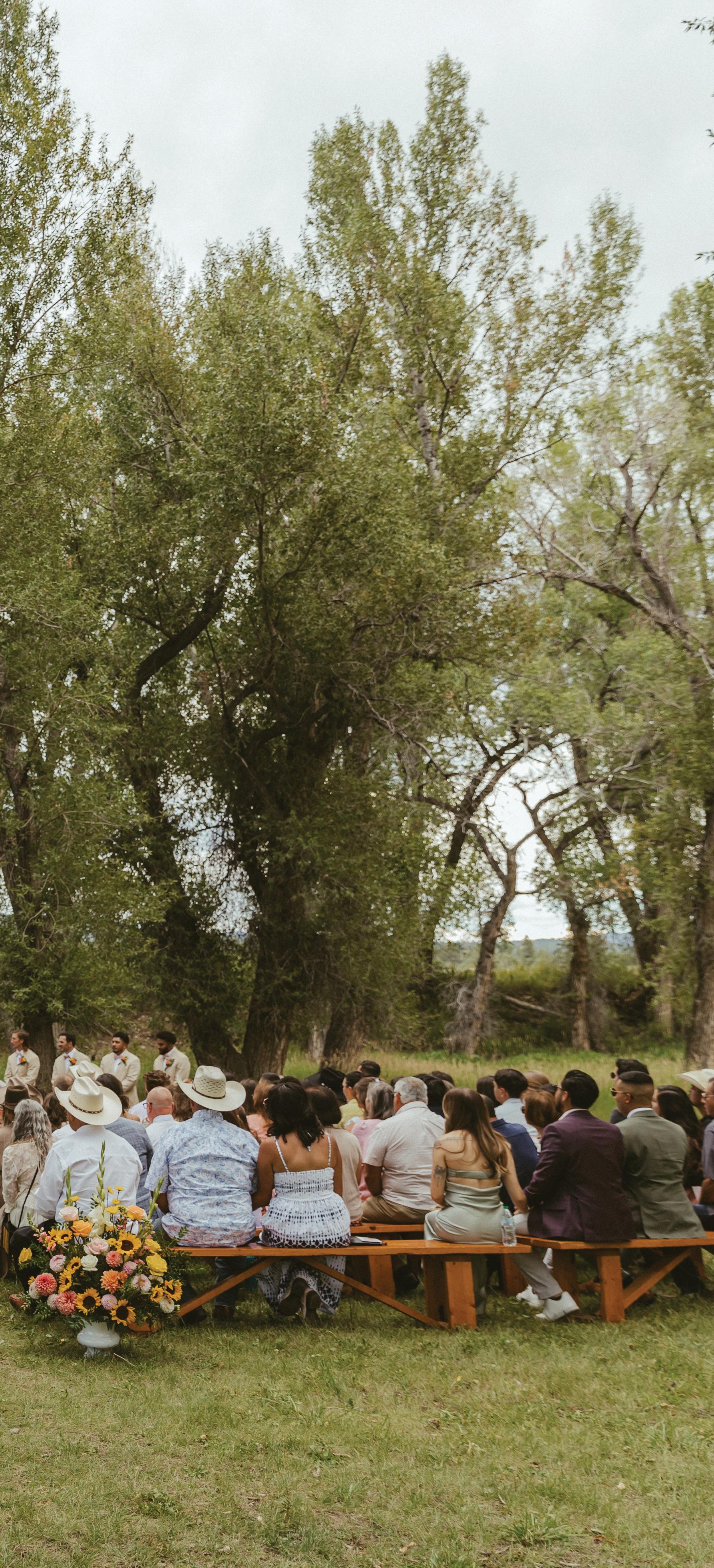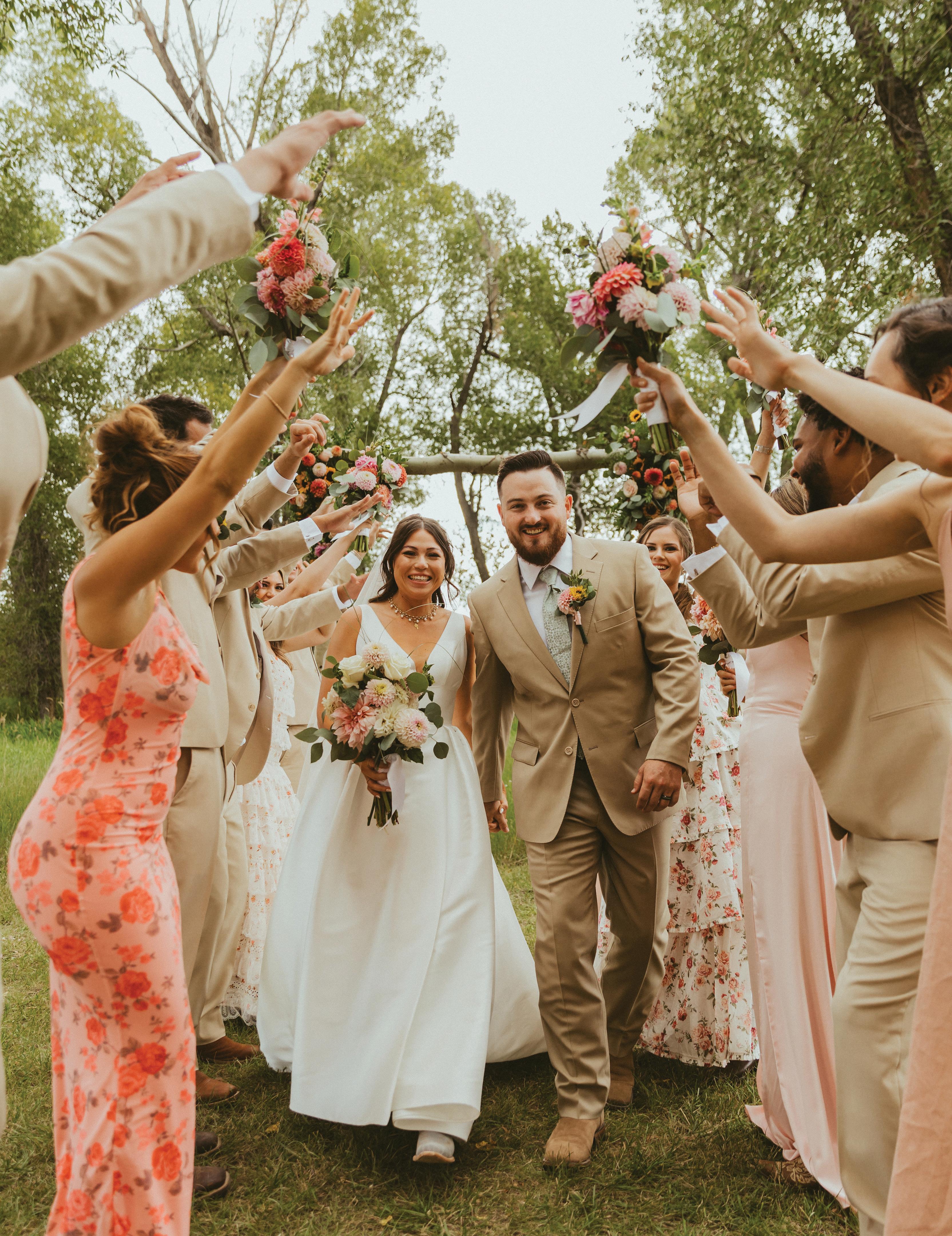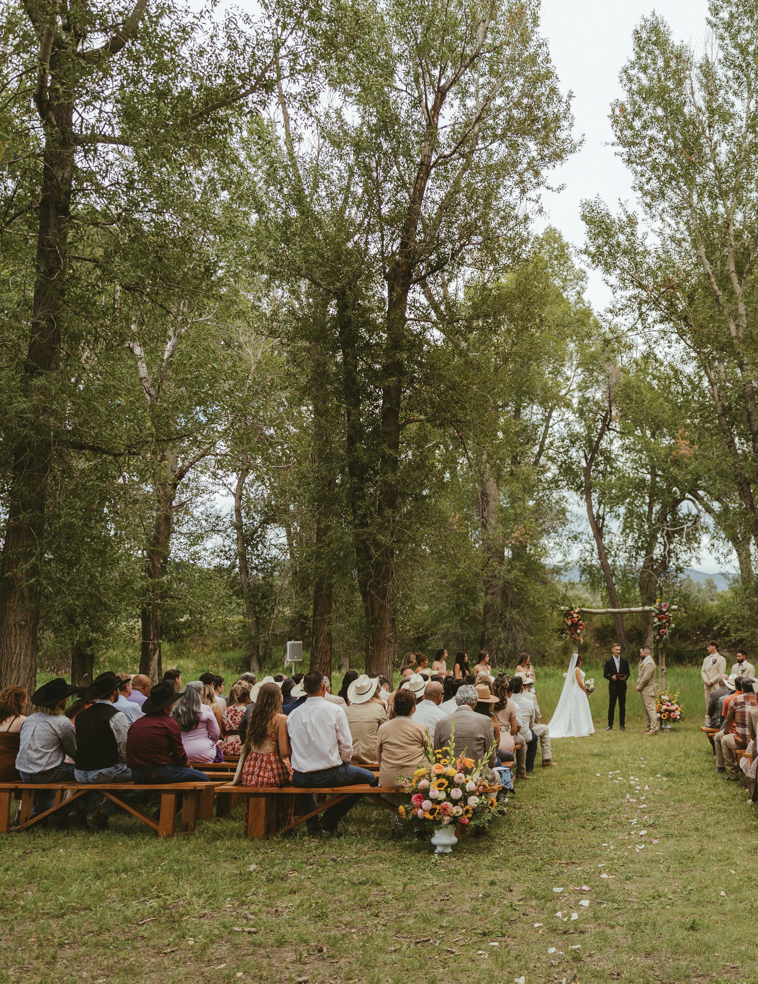 Magda and Kyle planned a rustic-whimsical celebration at Log River Ranch, a riverside property that reflected their shared love of the outdoors. With cottonwood trees lining the ceremony space and the Chama River flowing nearby, it was the perfect setting for their vows. Sunflowers added cheerful pops of yellow throughout the celebration, while the bride’s white Lucchese boots added a fun Western flair to her look. During cocktail hour, guests sipped signature drinks named after their dogs: “The Izzy” a Vanilla Crown & Coke, “The Bea Margarita” and “The Valle Elderflower Gin & Tonic.” As the sun set behind the trees, Magda changed into a short reception dress to show off her boots and twirl on the dance floor as the DJ and country band kept the party going well into the night.