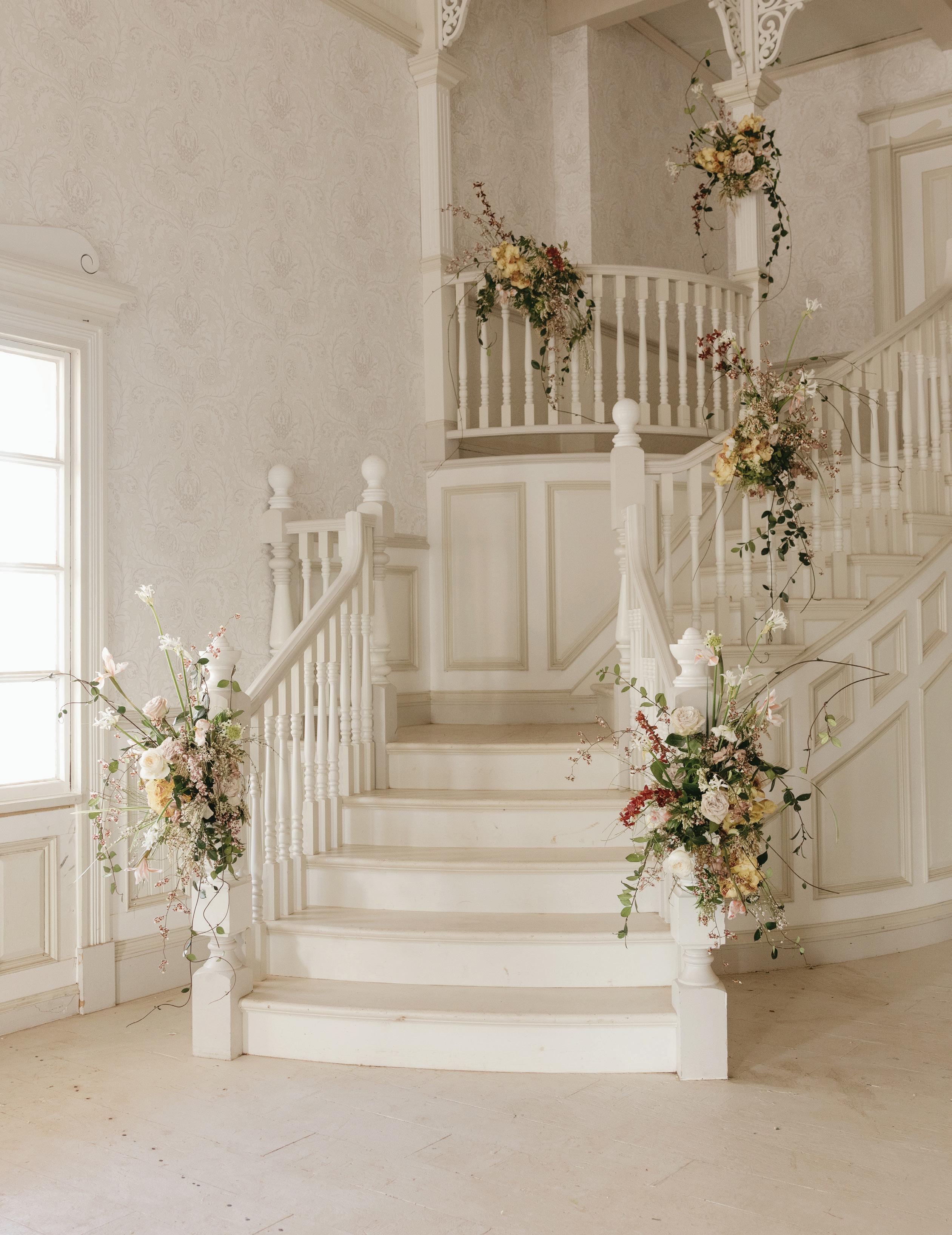 Florals climbed the grand staircase inside Eaves Movie Ranch like they were always meant to be there; cascading arrangements of orchids, lilies,