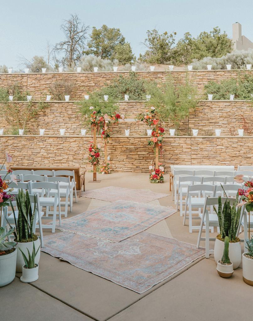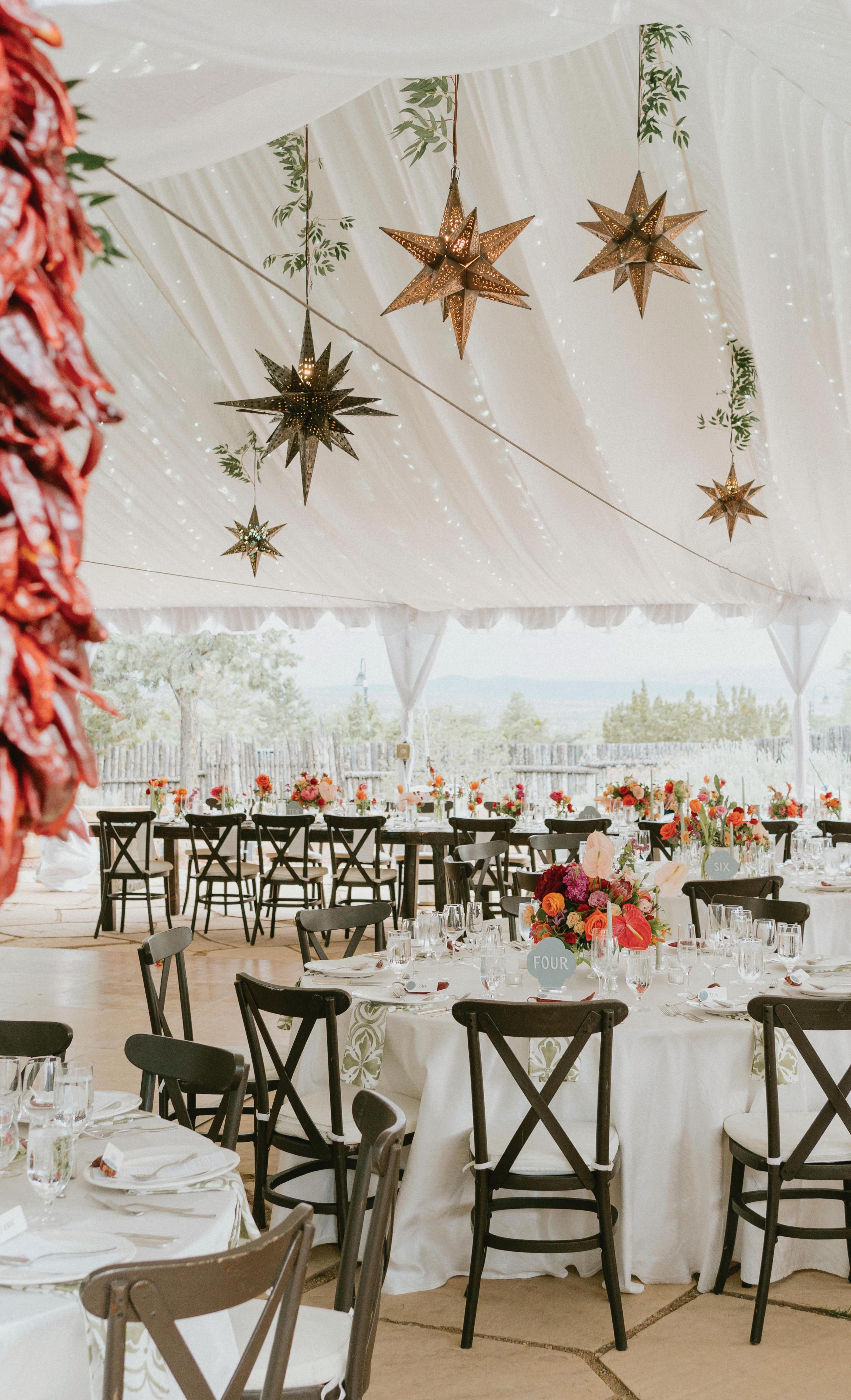There’s something refreshing about spring in New Mexico. Wildflowers begin to bloom, the air feels crisp and the desert slowly comes back to life. That said, spring is also known for keeping couples on their toes. Wind, rain and cooler temperatures are all possible, making a solid weather backup plan a must. Whether you opt for an indoor venue or a tent with sidewalls, having coverage will protect both your guests and the carefully styled details of your day. For outdoor celebrations, consider design elements that can withstand the breeze, like tile name cards or weighted table decor. Cleartop tents are not recommended later in the season, as they can trap heat even on mild days. With a little flexibility, spring weddings in New Mexico can feel fresh, intimate and incredibly charming.
