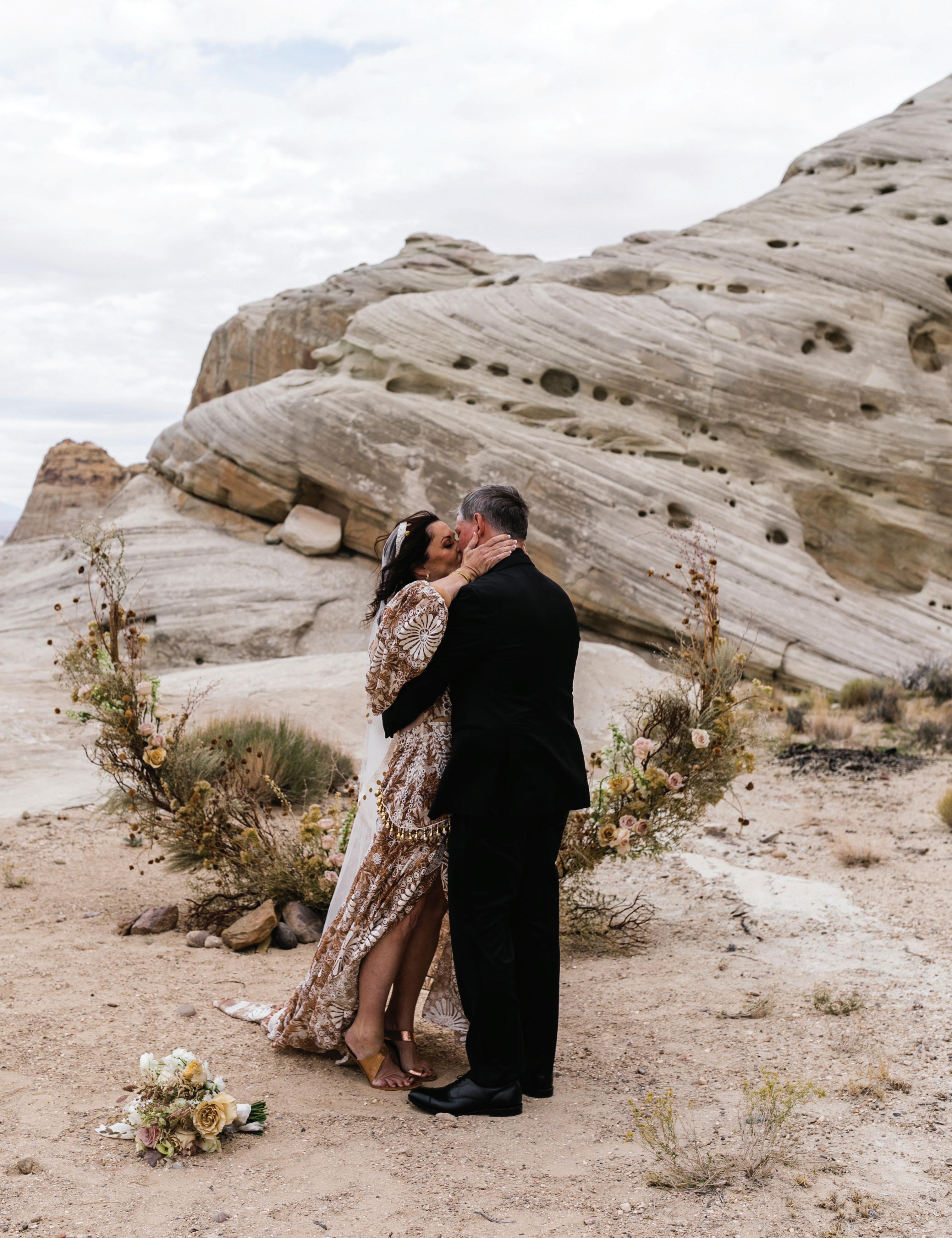 Prior to the ceremony, Debi and Scott shared an unforgettable first look moment with a stunningly romantic backdrop. “Scott waited in the private patio area just outside our room at Amangiri. His back was to me and I walked out through the trees as he turned around. It was a really special and intimate moment,” Debi shares.