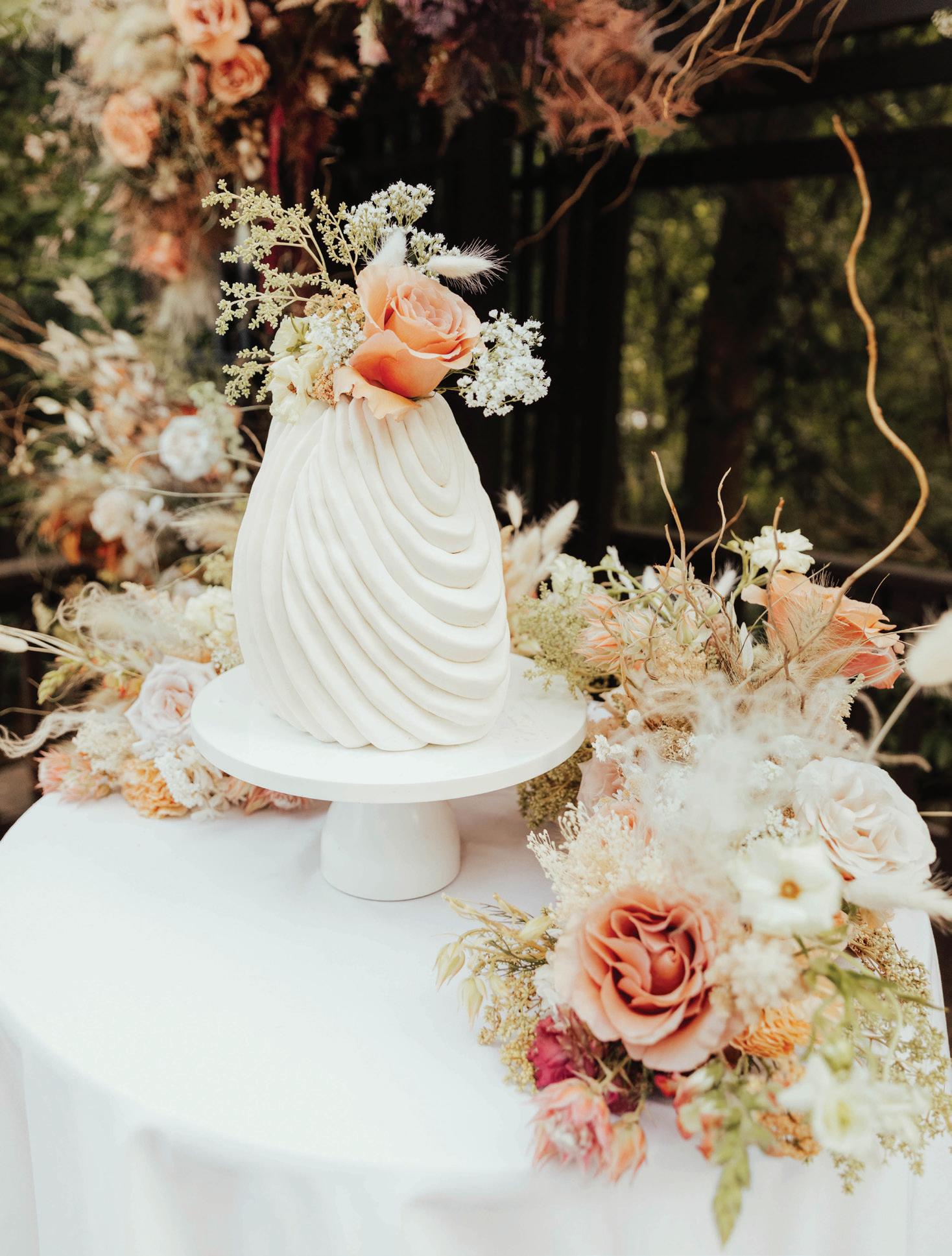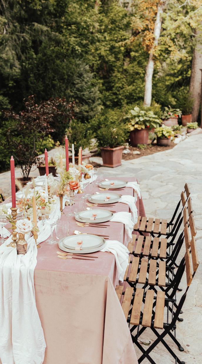 Treat your loved ones to a secluded portion of Salt Lake City and dine al fresco for your reception. The dusty rose velvet linen adds a luxe touch to the elegant tablescape designed by Copper River + Co.. A flowy, ecru gauze runner, scattered bud vases, and vintage taper candles tie into the romantic ambiance. Leave guests speechless with a drop dead gorgeous dessert by Maile Cake Design. From the organic textures resembling the oceanic corals in clay to the ripples that look like waves crashing against the beach, this sculptural cake is a sweet end to a perfect celebration.
