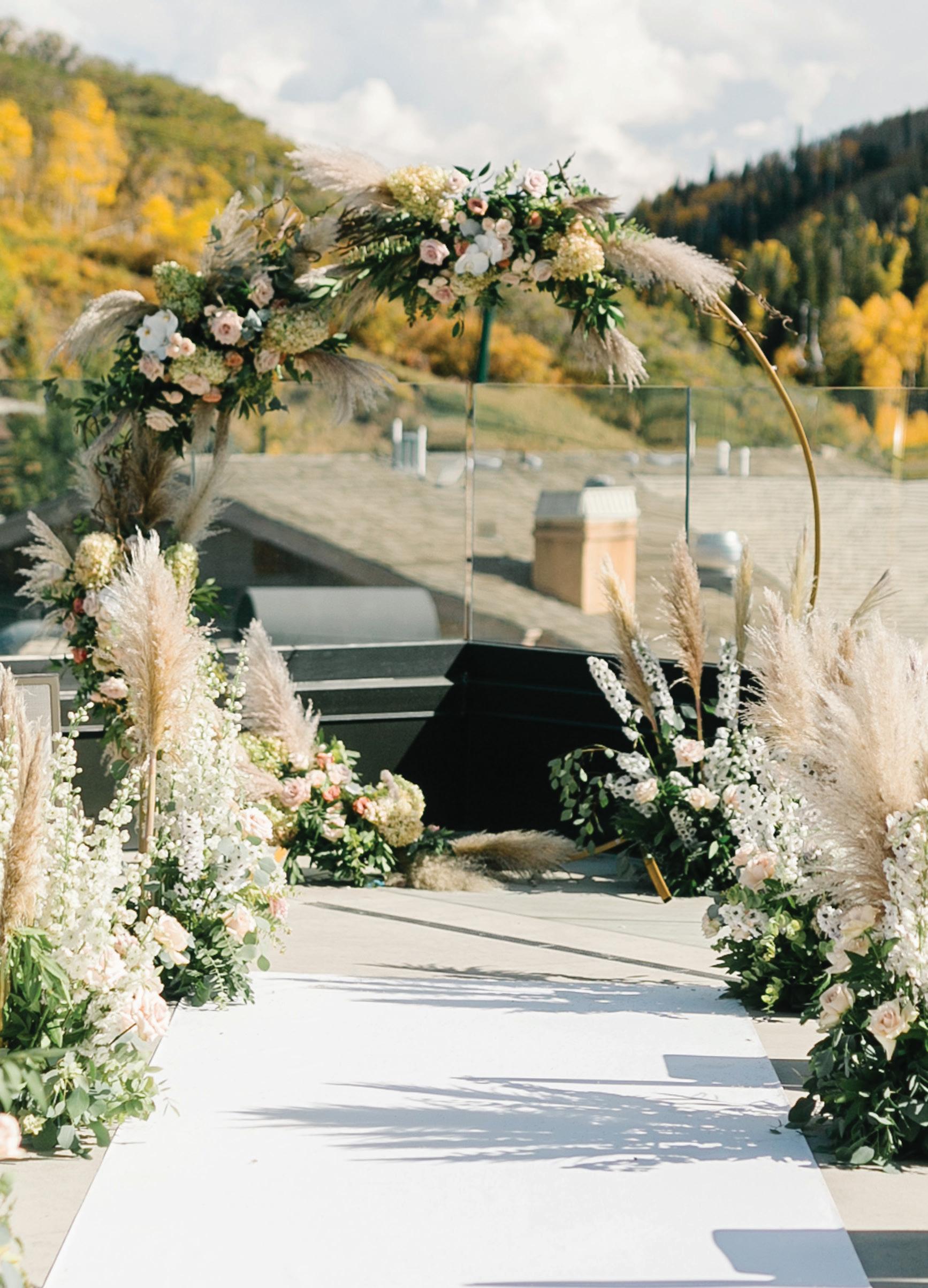 Nestled within the rustic setting of pines and canyon vistas, Millcreek Inn offers a serene outdoor atmosphere with flagstone pathways, manicured gardens, and a wooden arbor to suit your fall nuptial needs. Olive and Sage Floral nodded to the wedding’s seasonality with an installation of cappuccino and taupe roses, baby’s breath, dried greenery, and pampas grass, making for an ethereal arrangement that expands beyond the coppery, rust hues we so often see.