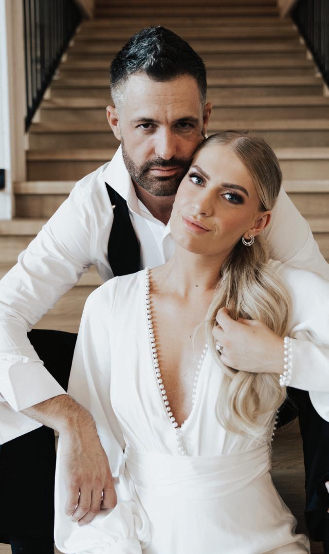 The reception dress often referred to as a second look serves as a dramatic mid-party entrance into the reception where the bride can let loose and dance the night away after the ceremony. While most options tend to lean toward shorter, sexier, and sparklier, our bride opted for an unexpected evening look, but spectacular nonetheless. A fiercely feminine jumpsuit made of soft crepe satin with pearl details at the neckline as well as at the open back and wrists is guaranteed to wow guests and make a social media splash. The groom appears ready to party himself by removing his jacket, undoing his bow tie, and slightly unbuttoning his shirt.