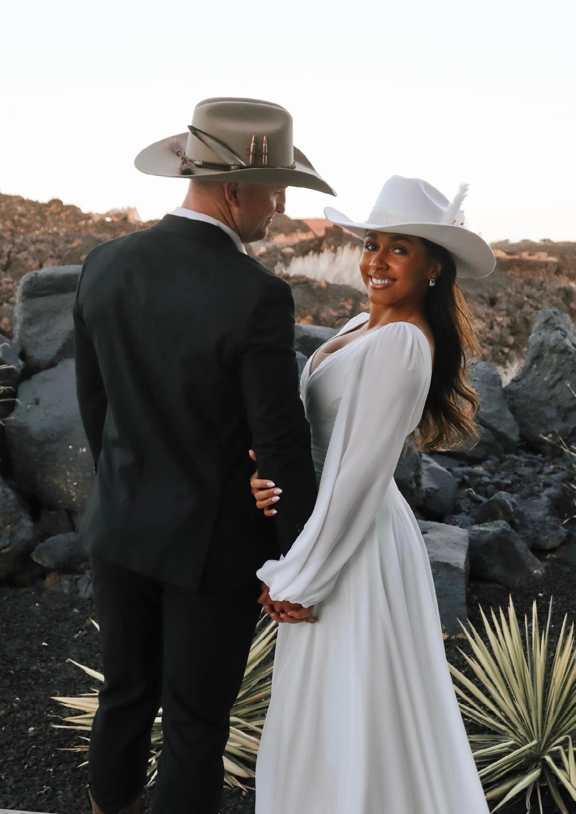 For their anniversary shoot, Jenna and Chaz wore cowboy hats from Burns in Park City, Utah, each branded with the name of the ranch they built together, Triple H Ranch. Their hats added a personal touch to the session, symbolizing the life they’ve built together.