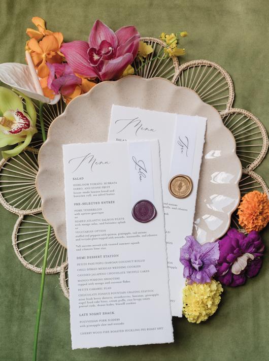 An invitation suite is more than just the main card, it’s a carefully curated ensemble of details. Traditional suites often include the invitation, RSVP card and details card, but modern couples are embracing creative additions like illustrated maps, weekend itineraries and personalized monograms. Whether you opt for a timeless letterpress or a contemporary flat print, layering these elements with thoughtful touches like vellum wraps, silk ribbons or a wax seal create drama and intrigue for your day. And don’t forget the envelope! From calligraphy-adorned addresses to personalized liners, it’s all in the details.