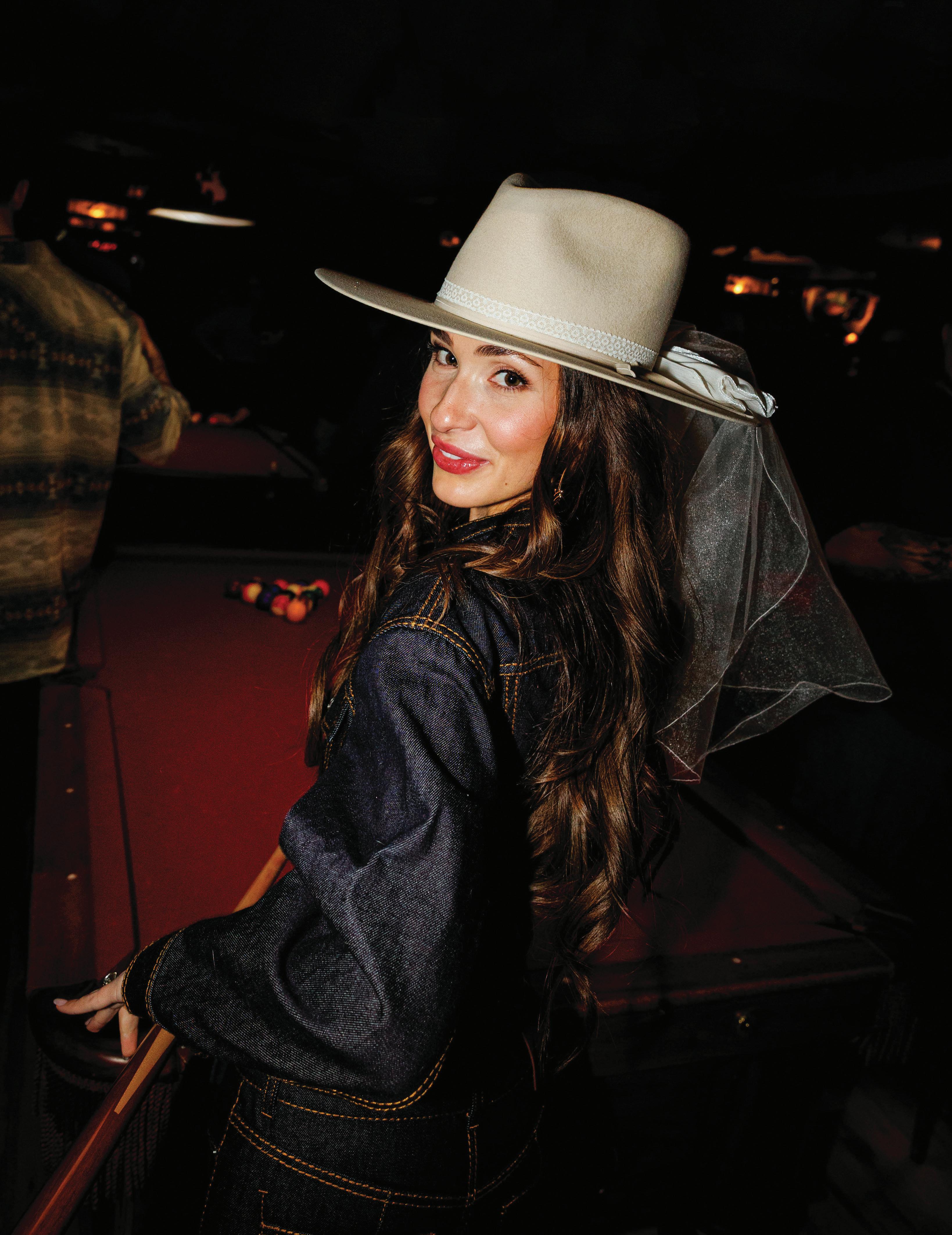 The bridal shower at the family home was a Western dream. The bride wore a flowy Costarellos gown paired with custom Miron Crosby boots, a bow-trimmed Sing Hat and a veil by Annette Anderson. Following the shower, everyone changed into denim looks for one final hoorah: a night out at the iconic Cowboy Bar. The bride’s Alexander Wang jumpsuit, Amina Muaddi boots and mini Chanel purse brought the ultimate cool-girl energy to her “Last Rodeo.”