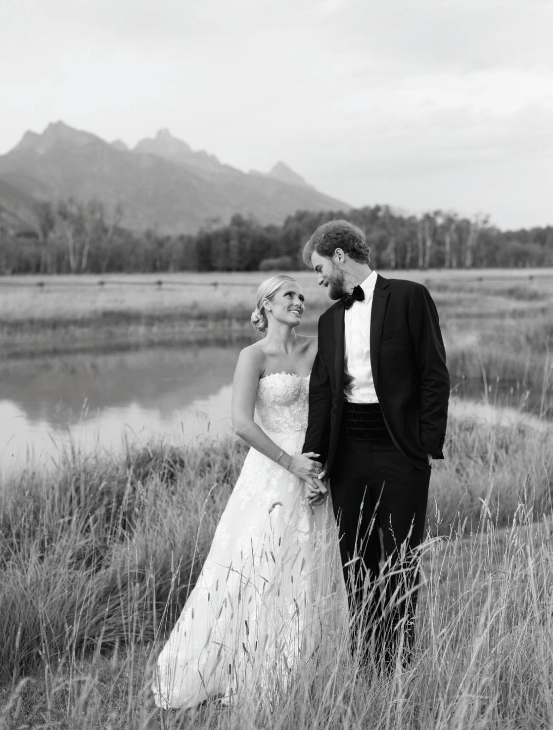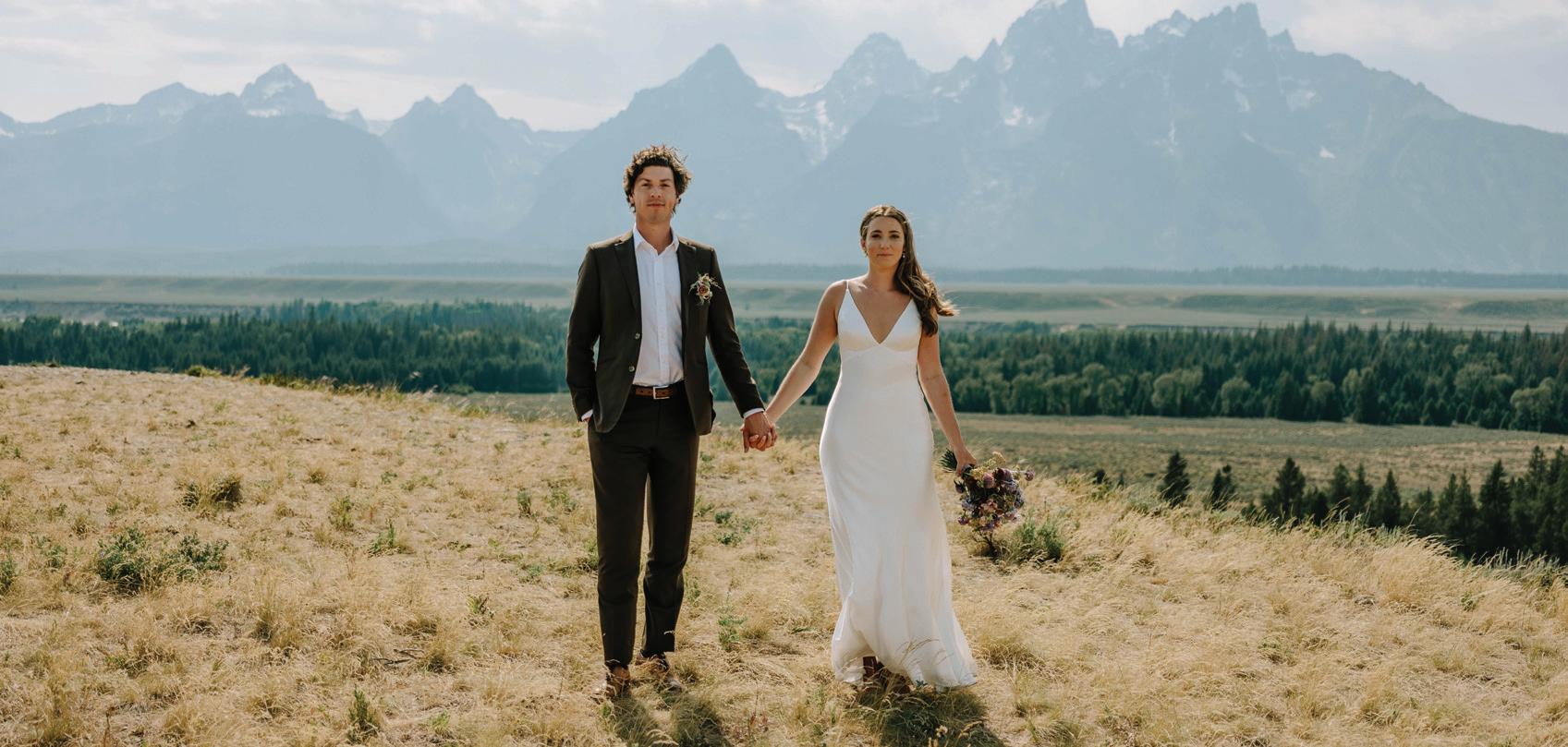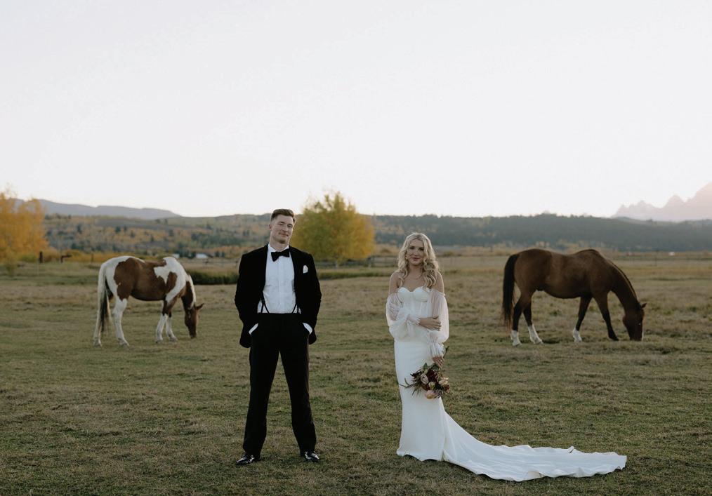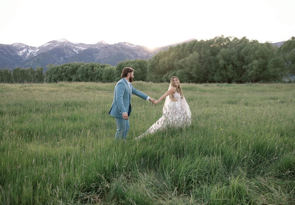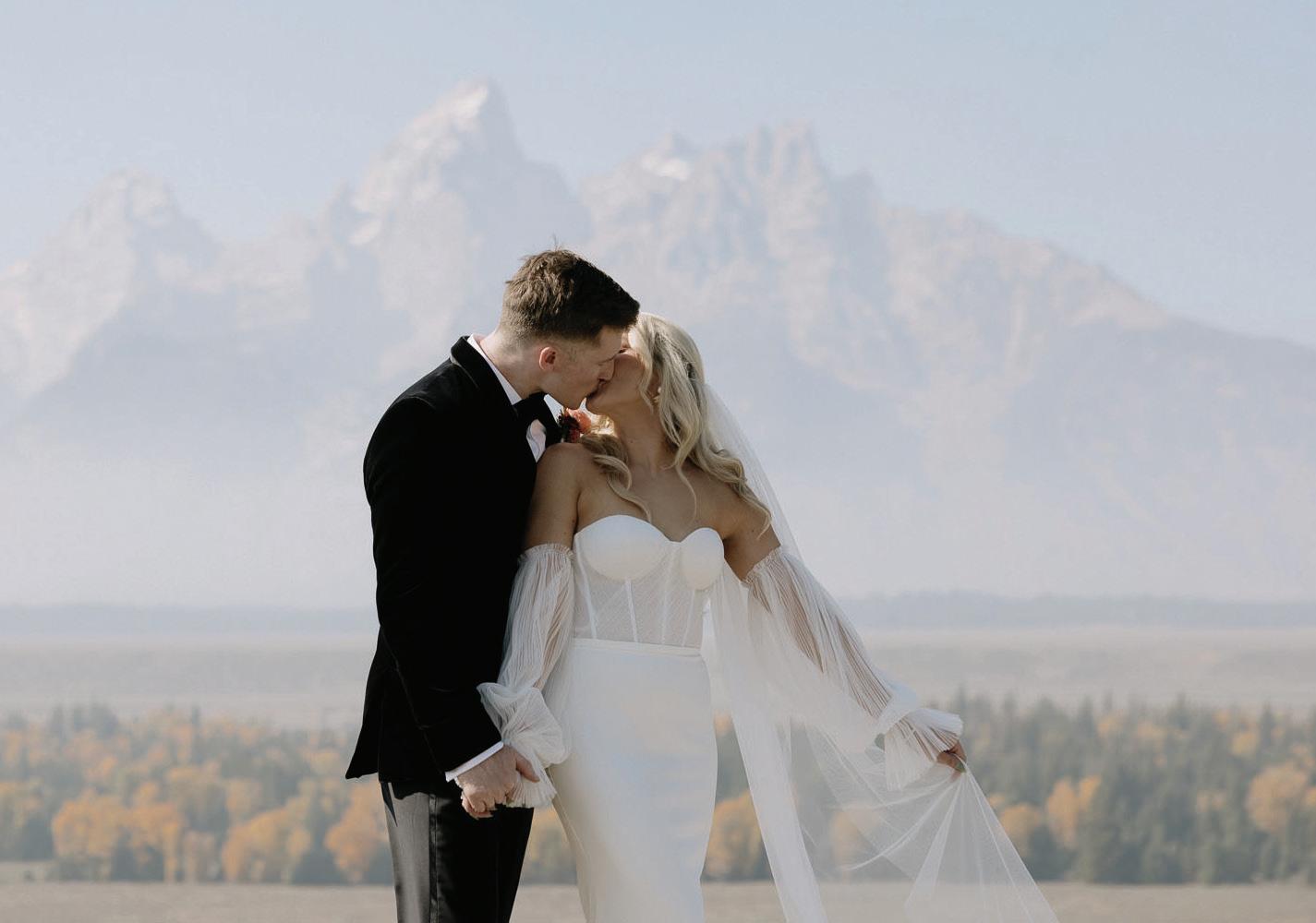 During a cross-country road trip through 22 national parks, the Tetons quickly became one of Katie and Austin’s favorite places, making it the perfect backdrop for their summer cowboy-chic wedding. Katie stunned in a feminine tulle gown from Casablanca Bridal, paired with silver rhinestone cowboy boots that made a statement as she walked down the aisle. Meanwhile, Austin looked dapper in his tan suit from Friar Tux and blue ostrichleg leather boots. For the ceremony, the couple kept the setting intentionally bare, letting the sweeping valley views create an immersive and breathtaking scene for their vows. Afterward, the newlyweds joined their guests for a reception featuring acoustic guitar melodies, a buffet-style dinner, an open bar and an unforgettable sendoff at the iconic Million Dollar Cowboy Bar, where live music and dancing carried the party well into the night.
