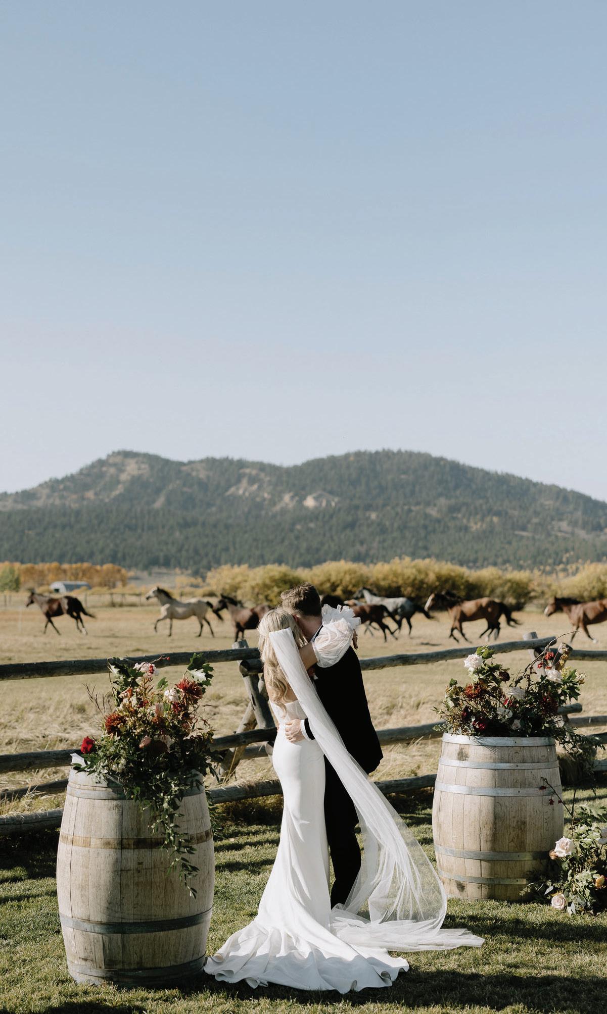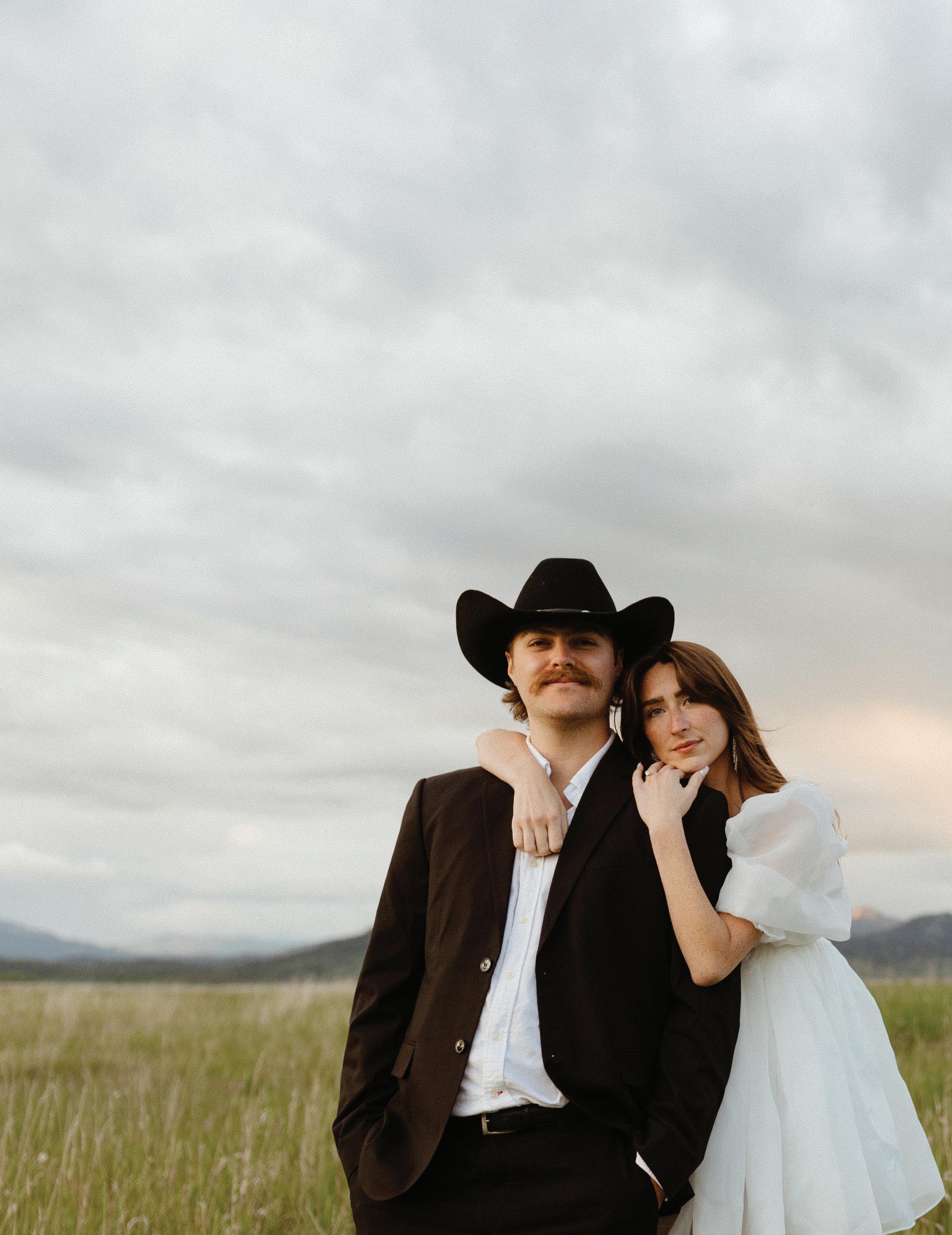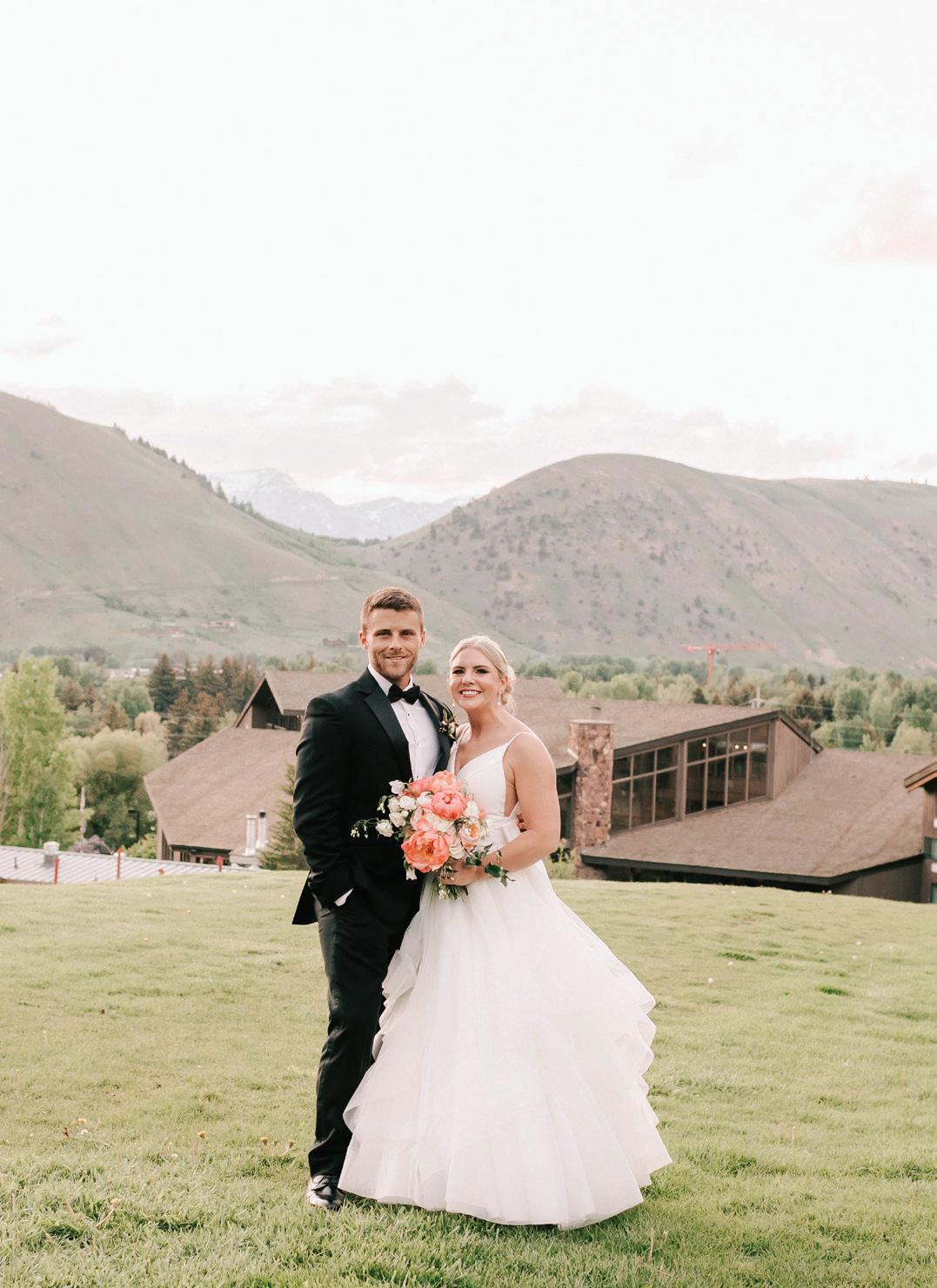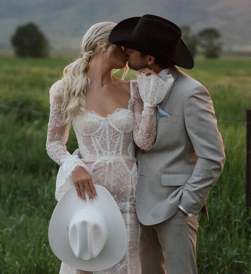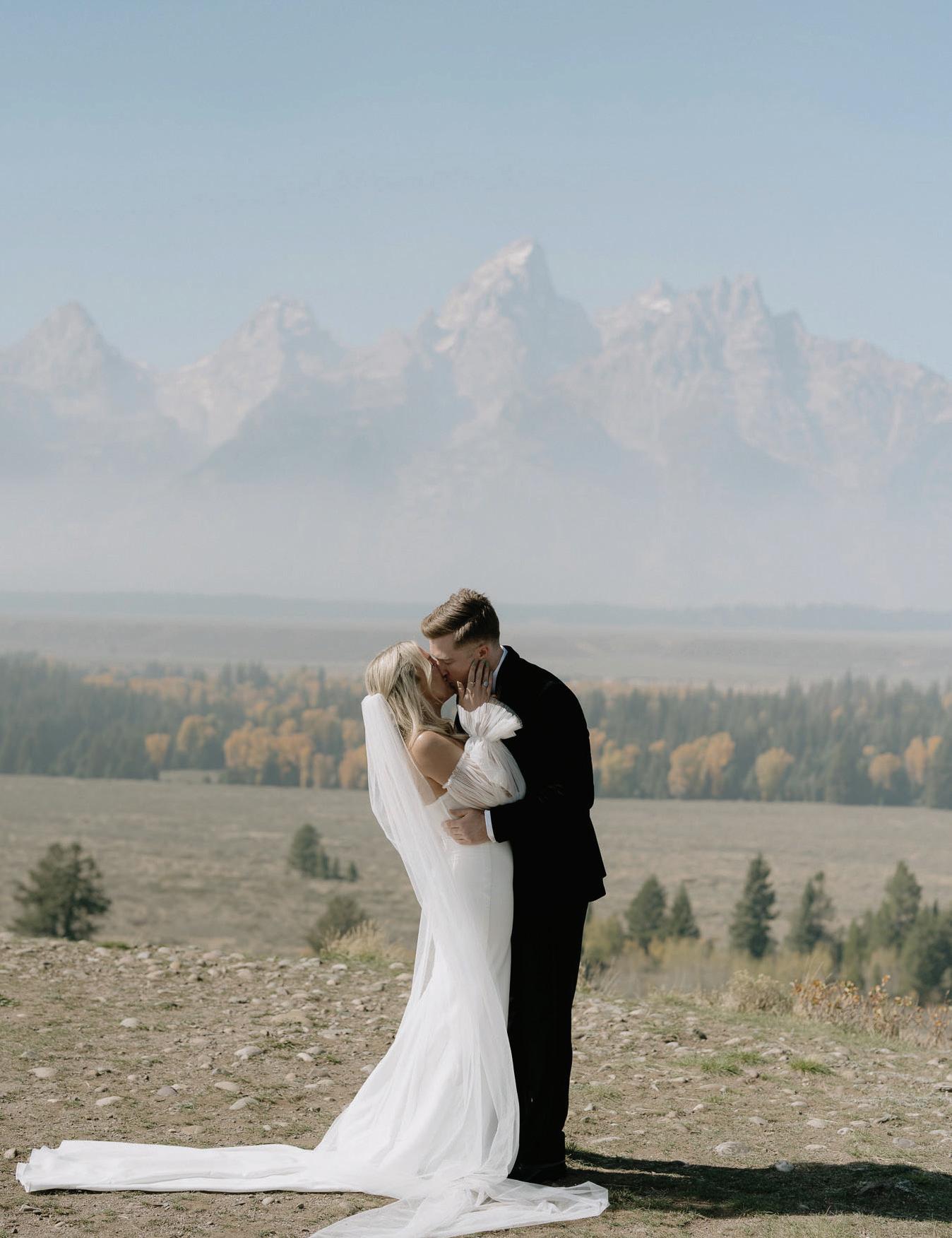 During a cross-country road trip through 22 national parks, the Tetons quickly became one of Katie and Austin’s favorite places, making it the perfect backdrop for their summer cowboy-chic wedding. Katie stunned in a feminine tulle gown from Casablanca Bridal, paired with silver rhinestone cowboy boots that made a statement as she walked down the aisle. Meanwhile, Austin looked dapper in his tan suit from Friar Tux and blue ostrichleg leather boots. For the ceremony, the couple kept the setting intentionally bare, letting the sweeping valley views create an immersive and breathtaking scene for their vows. Afterward, the newlyweds joined their guests for a reception featuring acoustic guitar melodies, a buffet-style dinner, an open bar and an unforgettable sendoff at the iconic Million Dollar Cowboy Bar, where live music and dancing carried the party well into the night.