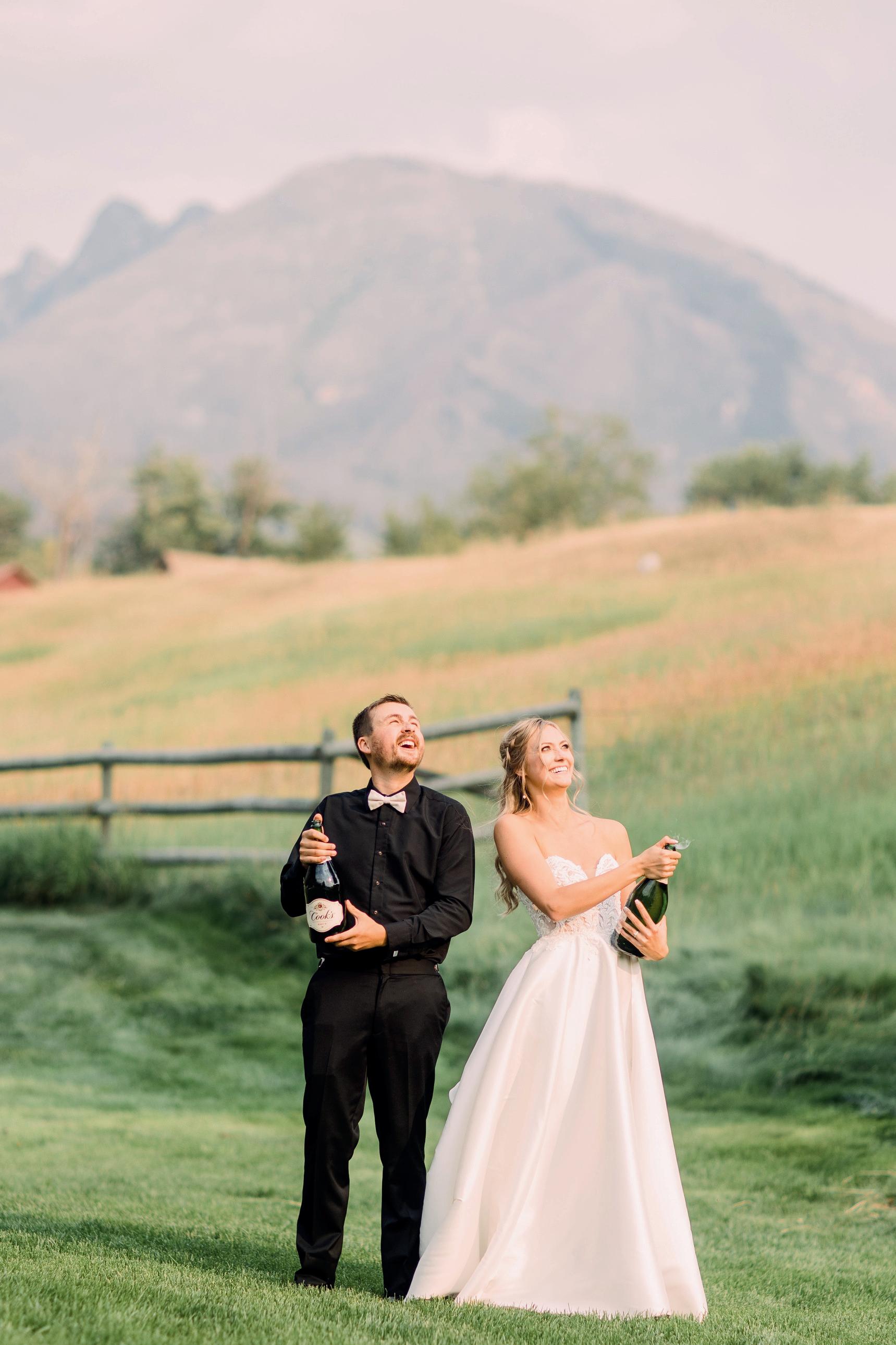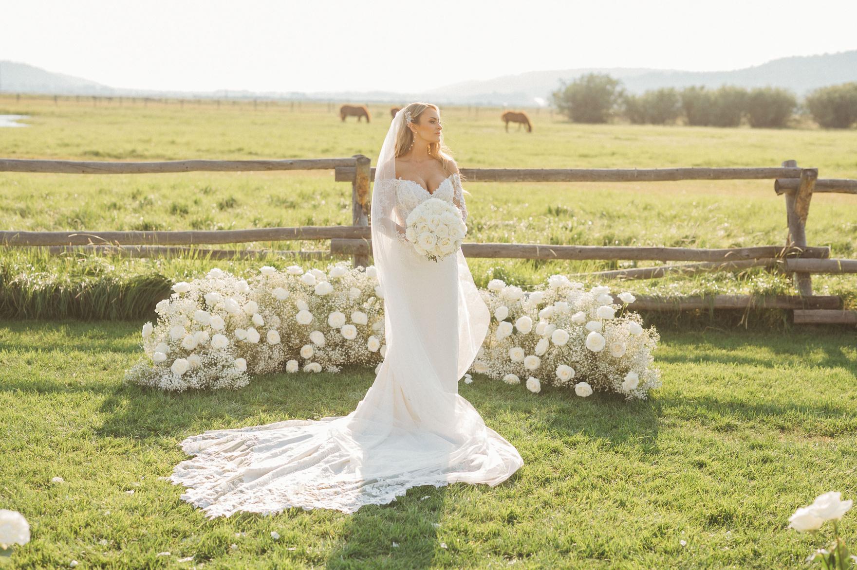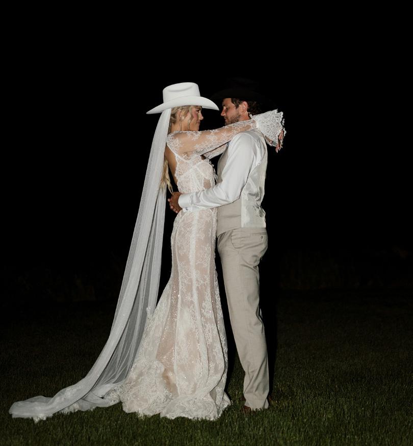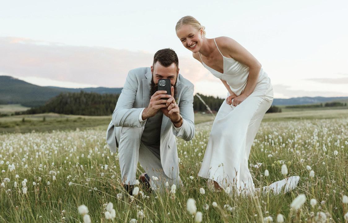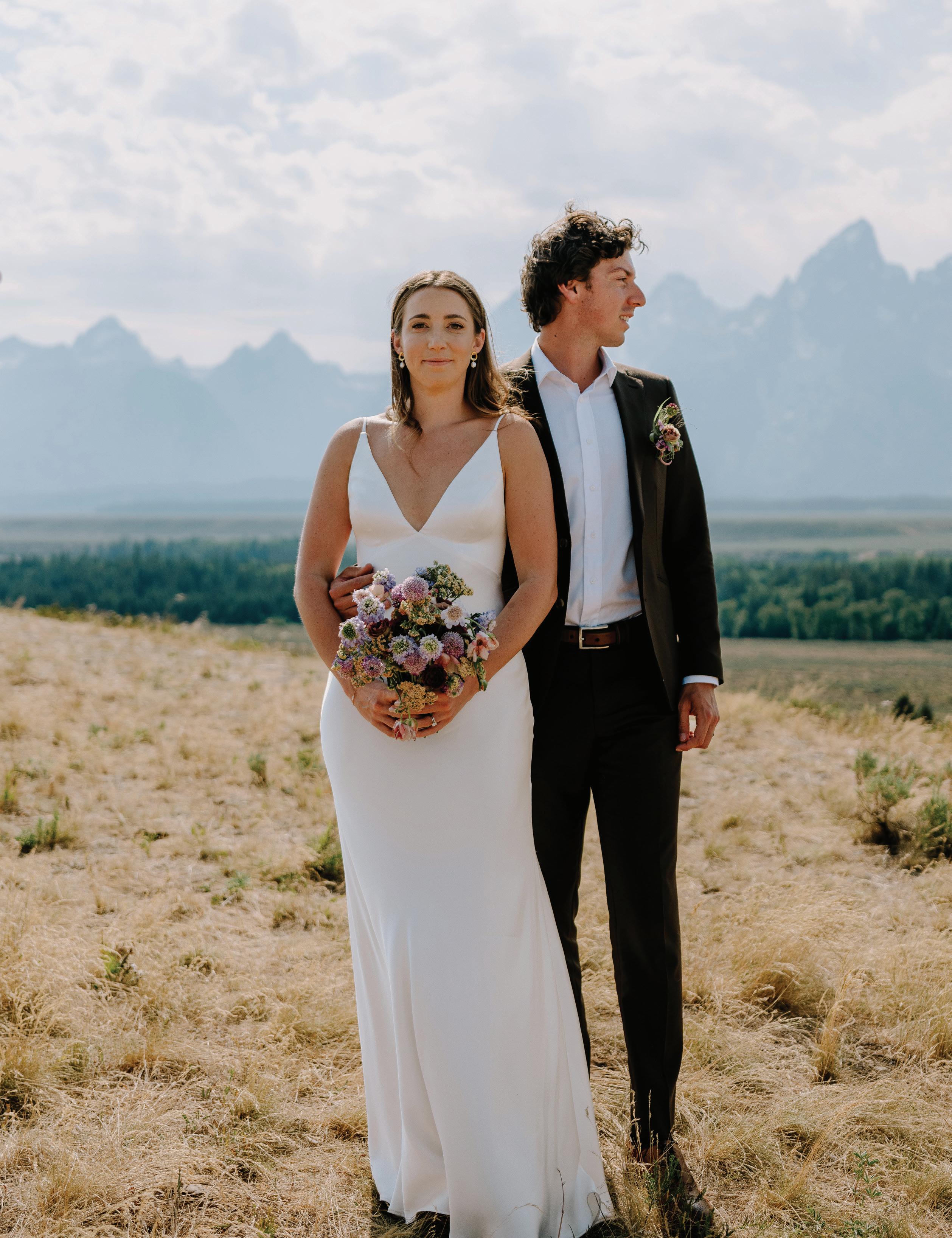 During a cross-country road trip through 22 national parks, the Tetons quickly became one of Katie and Austin’s favorite places, making it the perfect backdrop for their summer cowboy-chic wedding. Katie stunned in a feminine tulle gown from Casablanca Bridal, paired with silver rhinestone cowboy boots that made a statement as she walked down the aisle. Meanwhile, Austin looked dapper in his tan suit from Friar Tux and blue ostrichleg leather boots. For the ceremony, the couple kept the setting intentionally bare, letting the sweeping valley views create an immersive and breathtaking scene for their vows. Afterward, the newlyweds joined their guests for a reception featuring acoustic guitar melodies, a buffet-style dinner, an open bar and an unforgettable sendoff at the iconic Million Dollar Cowboy Bar, where live music and dancing carried the party well into the night.