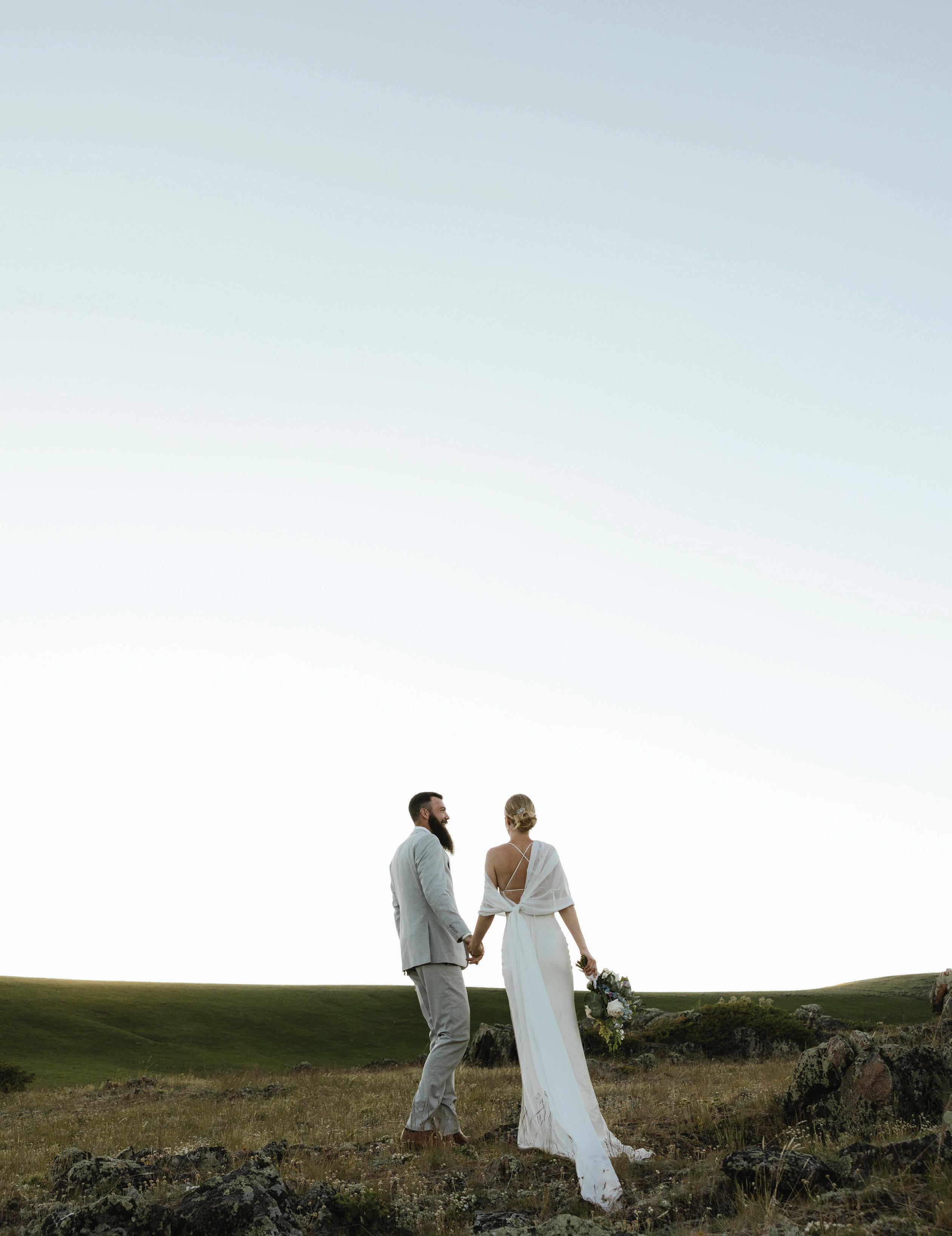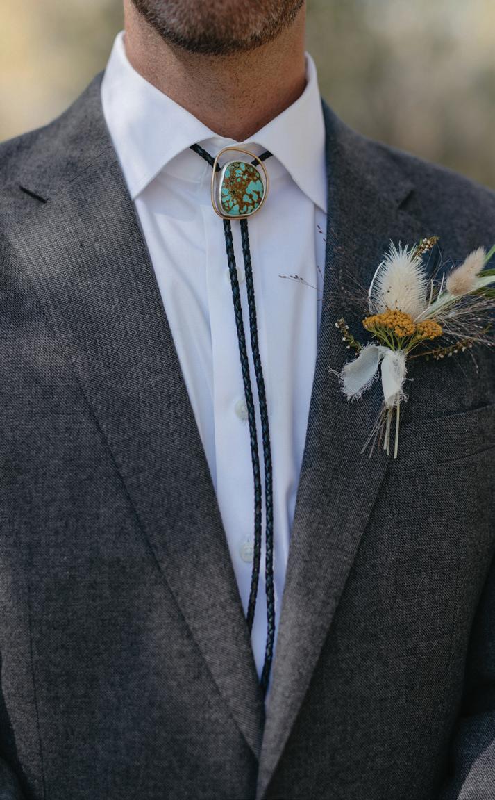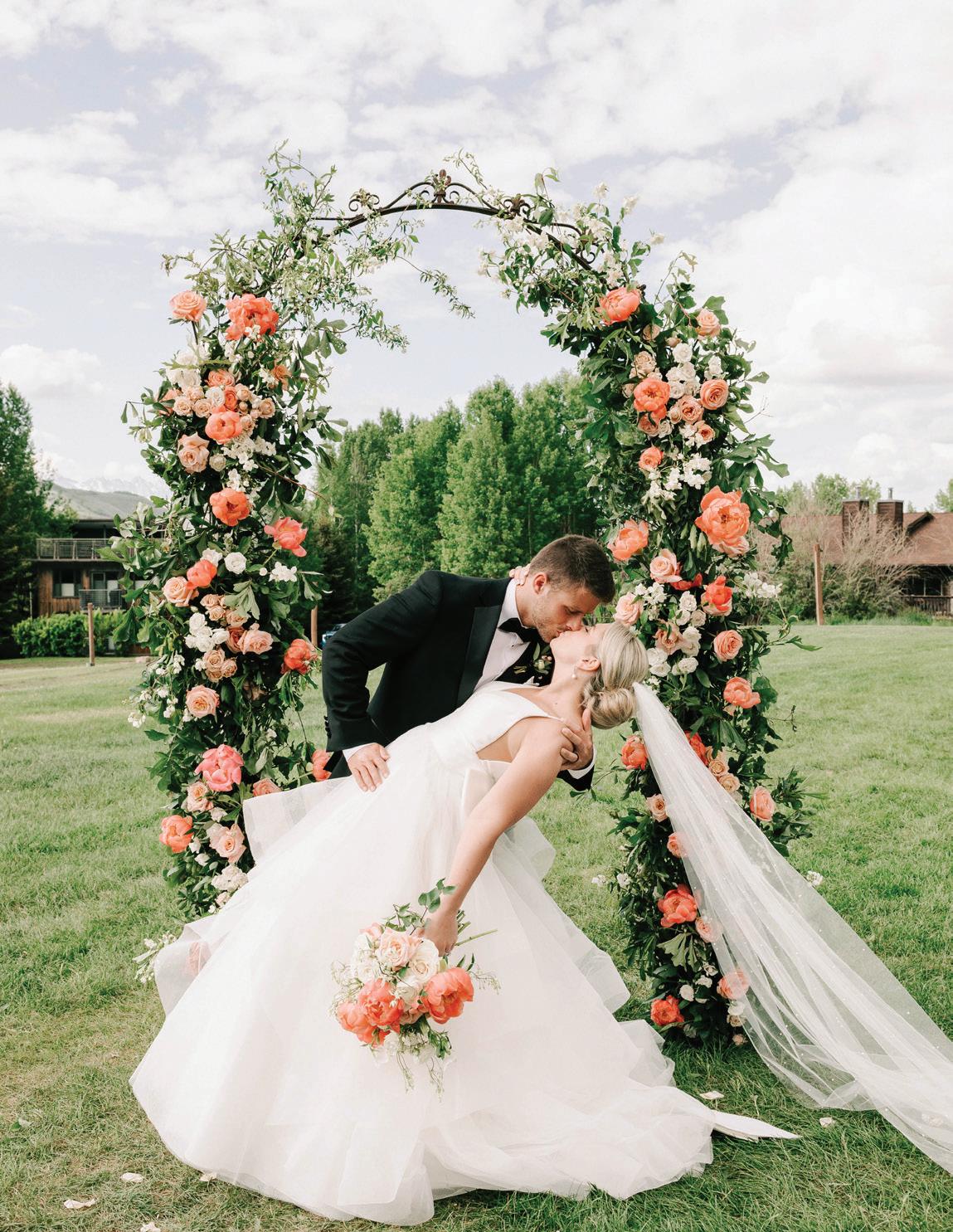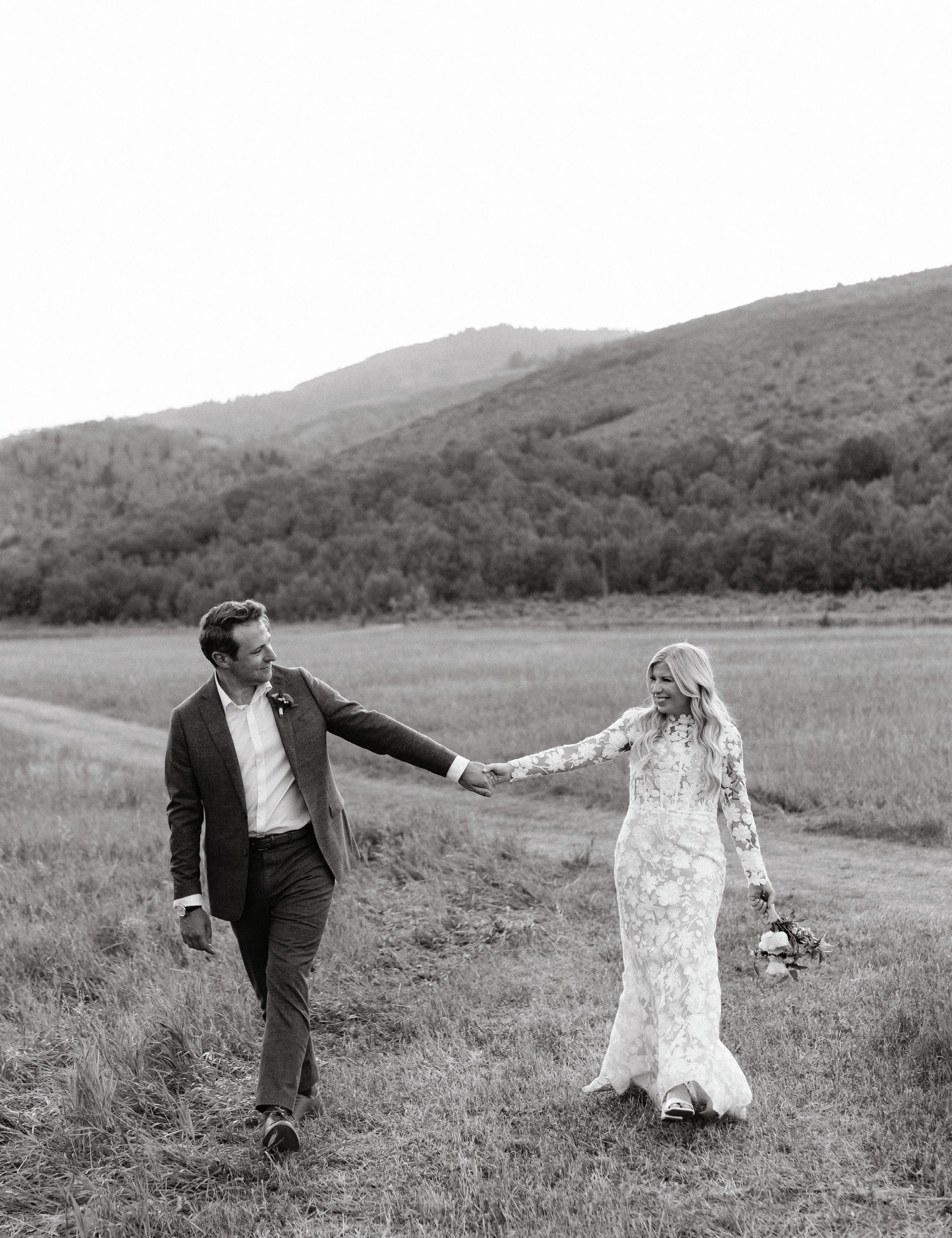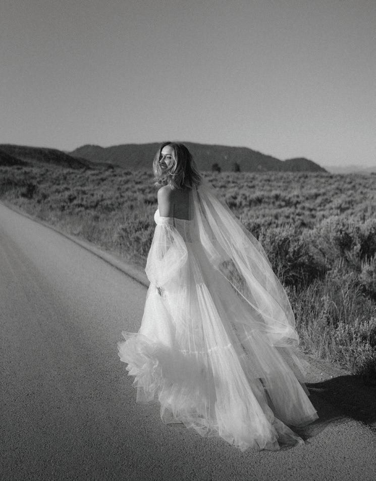 During a cross-country road trip through 22 national parks, the Tetons quickly became one of Katie and Austin’s favorite places, making it the perfect backdrop for their summer cowboy-chic wedding. Katie stunned in a feminine tulle gown from Casablanca Bridal, paired with silver rhinestone cowboy boots that made a statement as she walked down the aisle. Meanwhile, Austin looked dapper in his tan suit from Friar Tux and blue ostrichleg leather boots. For the ceremony, the couple kept the setting intentionally bare, letting the sweeping valley views create an immersive and breathtaking scene for their vows. Afterward, the newlyweds joined their guests for a reception featuring acoustic guitar melodies, a buffet-style dinner, an open bar and an unforgettable sendoff at the iconic Million Dollar Cowboy Bar, where live music and dancing carried the party well into the night.