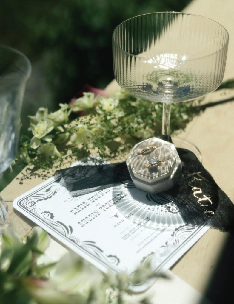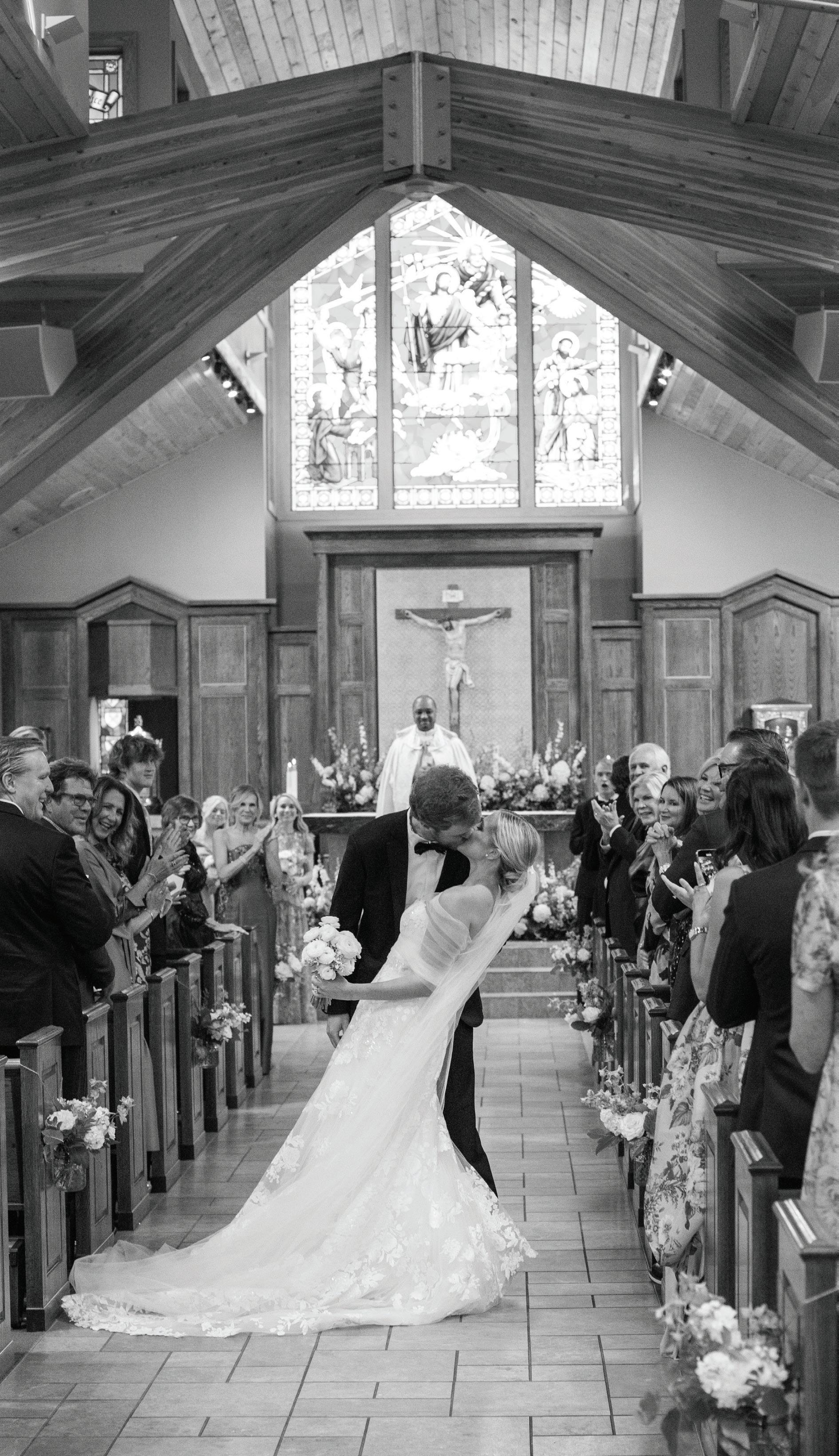 Megan and Tyler’s story kicked off in the most modern way possible, an Instagram DM. After months of building a friendship online, Tyler made the ultimate first move, driving four and a half hours just to take her to dinner. A month later, they were officially a couple. Fast forward two years, Megan had a hunch a proposal might be coming when Tyler planned a surprise during their trip to Punta Cana, Mexico. “He said, ‘I know how important it is to you that we have good photos from our vacation, so I hired a photographer to take some on the beach,’” Megan shared. Suspicious, she texted her best friends, who played it cool. The next day, mid-photoshoot, Tyler handed her a small red leather book, the same one he had used years before to ask her to be his girlfriend. Through tears, she read his letter, then followed him down the beach, where he stood surrounded by a circle of rose petals in the sand. “He dropped to one knee, I said ‘yes,’ and we popped champagne!”