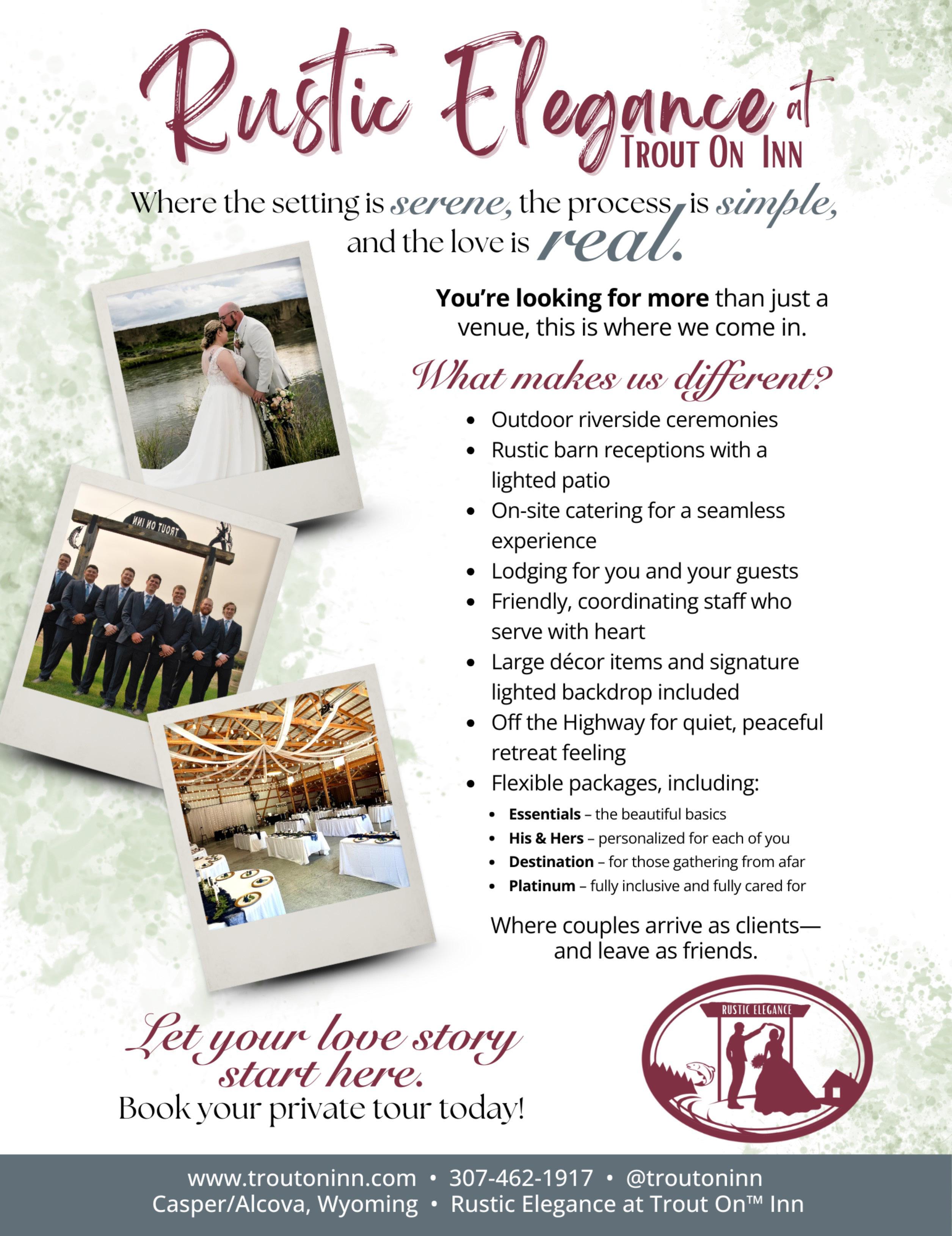Wyoming may be wild and wide open, but it’s the kind of place that wraps you in its charm. Whether you’re just dreaming of a destination wedding out west or deep in the planning process, I hope these pages fill you with inspiration, awe and a few good ideas along the way. Here’s to finding your own moment in Wyoming.