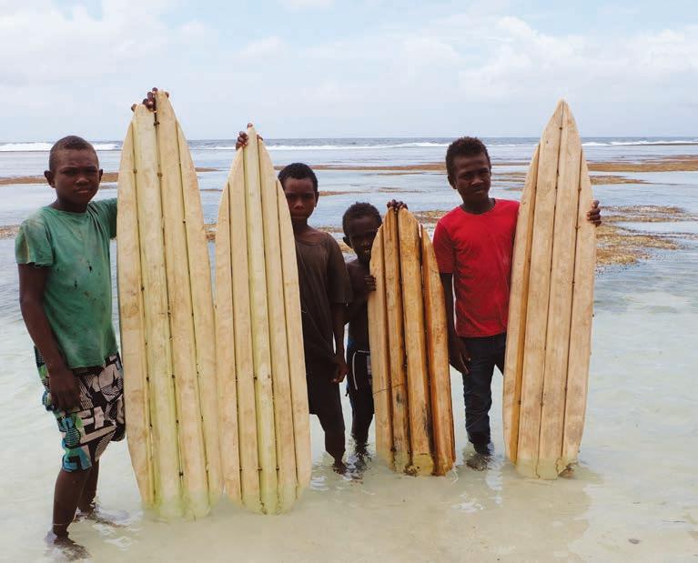 unusual spectacle of clumsy white Europeans trudging through their village. The discovery here is the mysterious jungle surf cult enjoyed by the young boys who fashion rudimentary surfboards from slats of sago palm pinned together with bamboo spikes. The technique is mainly to catch the shore breaks in boogie board style, but a few are keen to show us they can stand on their little boards too. When the soft wood gets messy around the edges from contact with the sharp volcanic rocks, a quick trim with a machete brings the board back into shape.