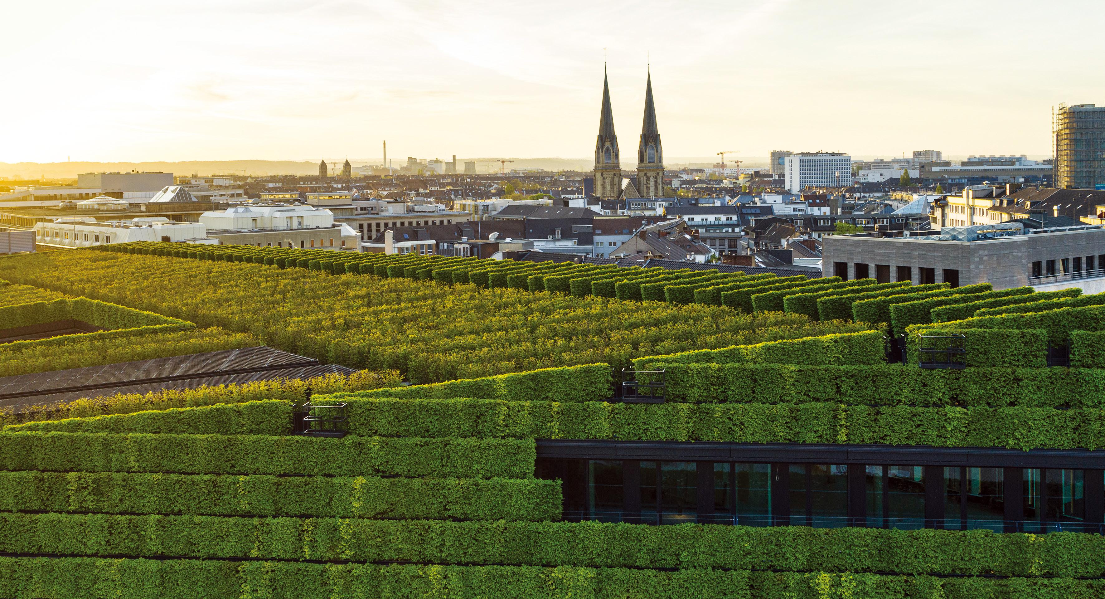 Alreadyproudly a green city, in 2021 Düsseldorf turned even greener with the completion of Kö-Bogen II (KII). Designed and led by ingenhoven architects in an area of more than 42,000 m², KII was the cherry on top of an extensive urban renewal project in the centre of Düsseldorf, Germany. The commercial and office complex became Europe’s largest green façade when it opened, creating a verdant pyramid with 8 kilometres of hornbeam tree hedges comprising more than 30,000 plants.