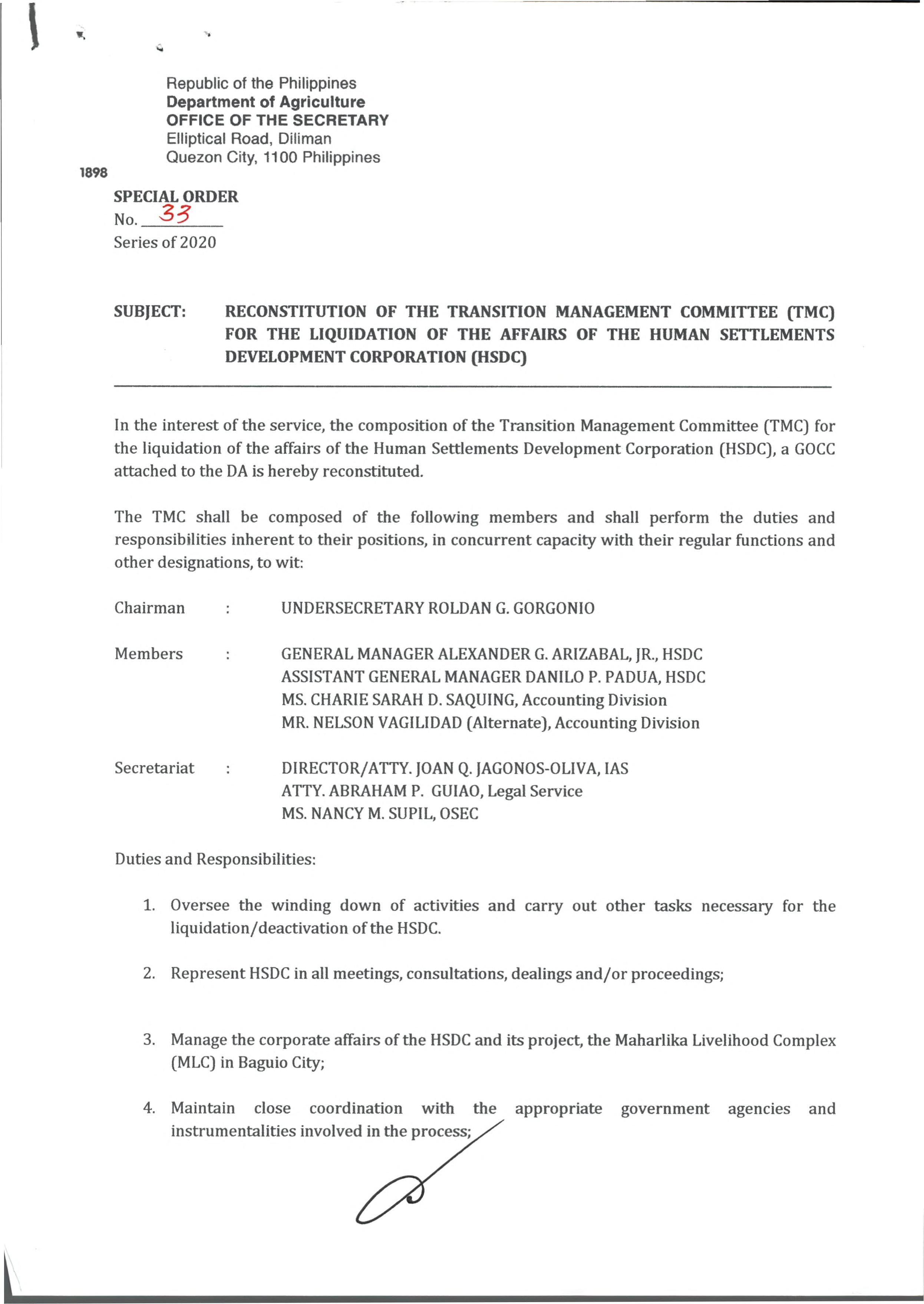 SO#33,s.2020_Reconstitution of the TMC for the Liquidation of the Affairs of the HSDC