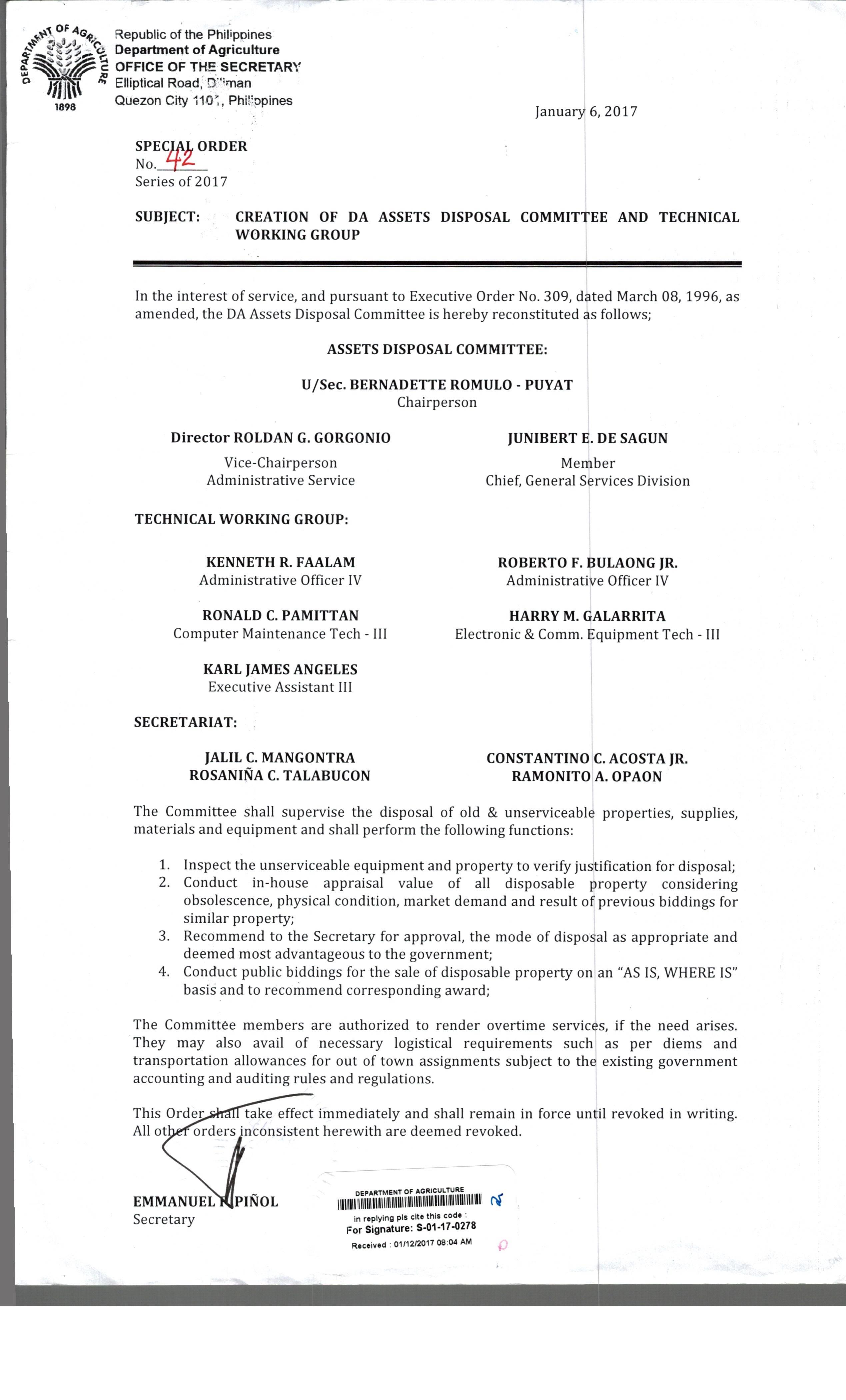 SO#42,s2017_Creation of DA Assets Proposal Committee and Technical Working Group