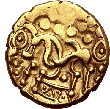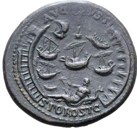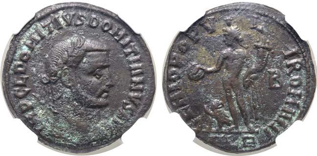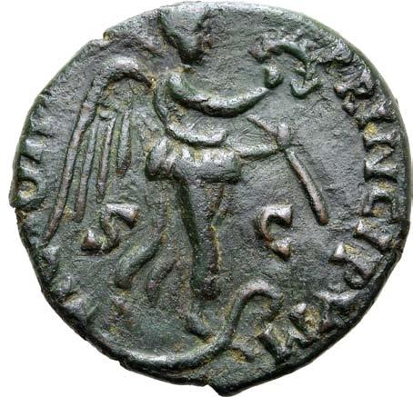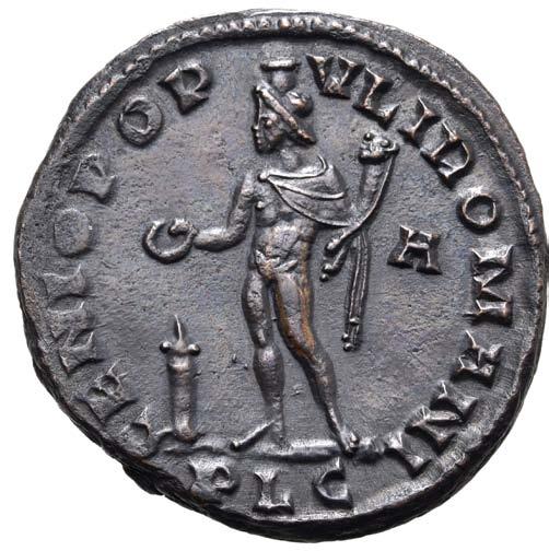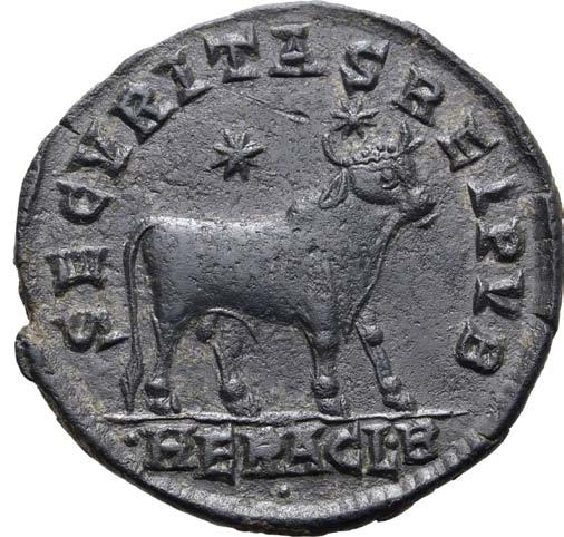 The reserve of the medallion represents Constantius I’s campaign in Britain as recorded in the panegyric for Constantius in which Constantius invades Britain and defeats Allectus, and his soldiers later save the city of London from Frankish mercenaries (see Panegyrici Latini (VIII): Panegyric of Constantius).
