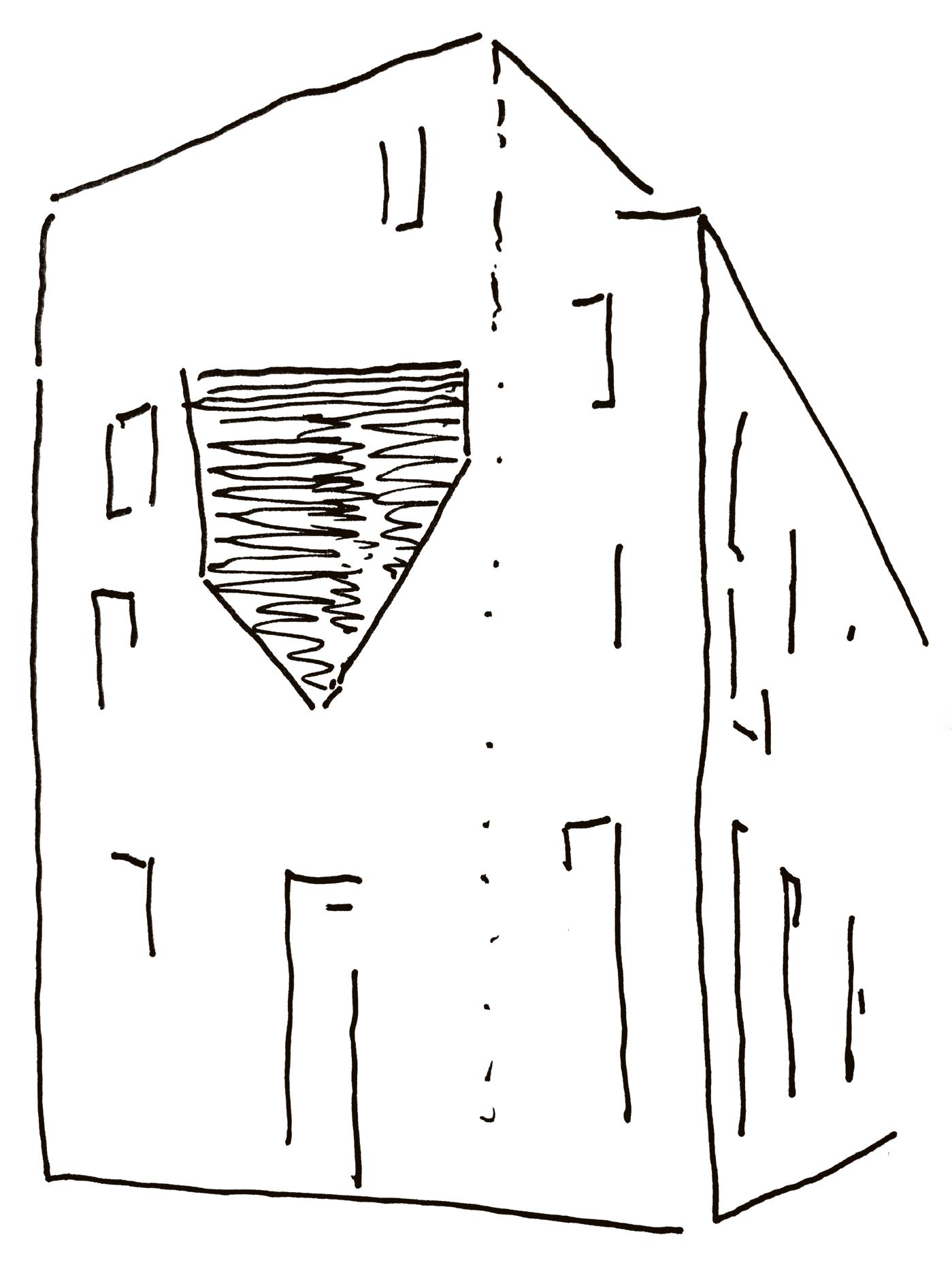 De gevel is een zeventien meter hoge wand van rode, grof getrommelde bakstenen en diepliggend voegwerk. De groeven in de stenen komen overeen met mijn denkrimpels.