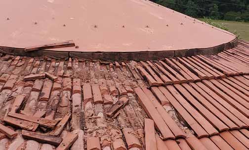 St. Rose of Lima Catholic Church was a unique project due to the configuration of the buildings and the application of the tile installation. This roof presented numerous challenges throughout the duration of the project. Services, functions and masses continued throughout the project, which required work stoppages daily and delay of work due to unforeseen activities such as funerals and weddings. The turret sanctuary roof was an extremely dirty and timeconsuming tear-off due to existing tile breakage. The turret is surrounded by a flat single-ply PVC membrane that had to be fully covered with protective plywood sheathing to prevent damage to the membrane. The turret tile for this project was produced specifically for the dimensions of this building. The taper of each pan and cap tile was based on a circumference of 203 feet and a radius of 33 feet. Each tile was hand set along string lines from the apex of the roof to ensure straight courses were installed.