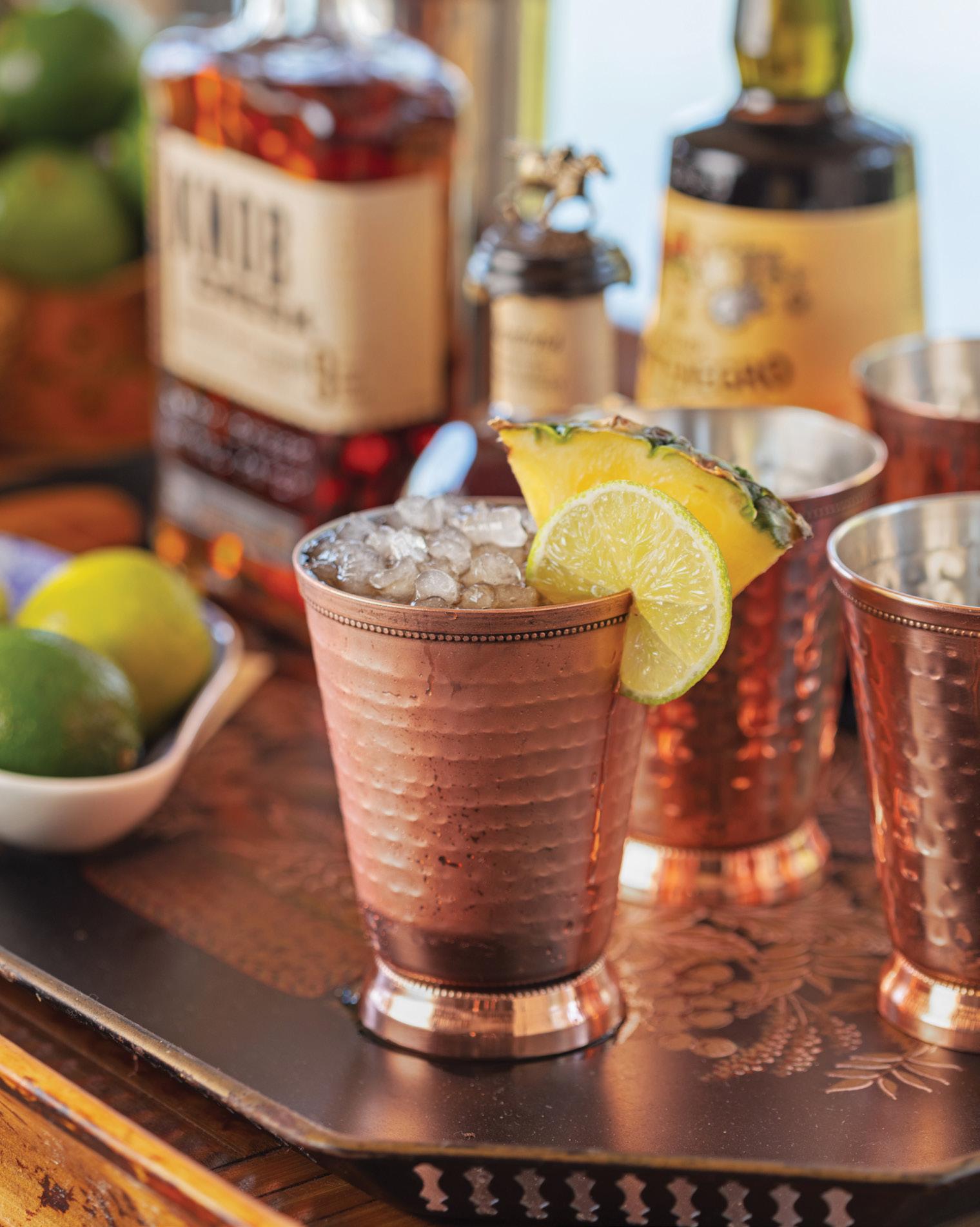 For the floral arrangements, Tipton & Hurst filled JoBeth’s containers with roses, ‘Fall Sunset’ chrysanthemums, antique hydrangeas, and ‘After Dark’ peppermint willow, which gives the shape an organic feel befitting the setting. The result is a thoughtful gathering that’s easy to replicate, whether you’re hosting a girls night in or a holiday meal when the kids come home. “It’s important to find these little milestone moments to cheer for each other,” she says, “no matter the occasion.” Turn the page for JoBeth’s empty-nester take on the Jungle Bird cocktail.