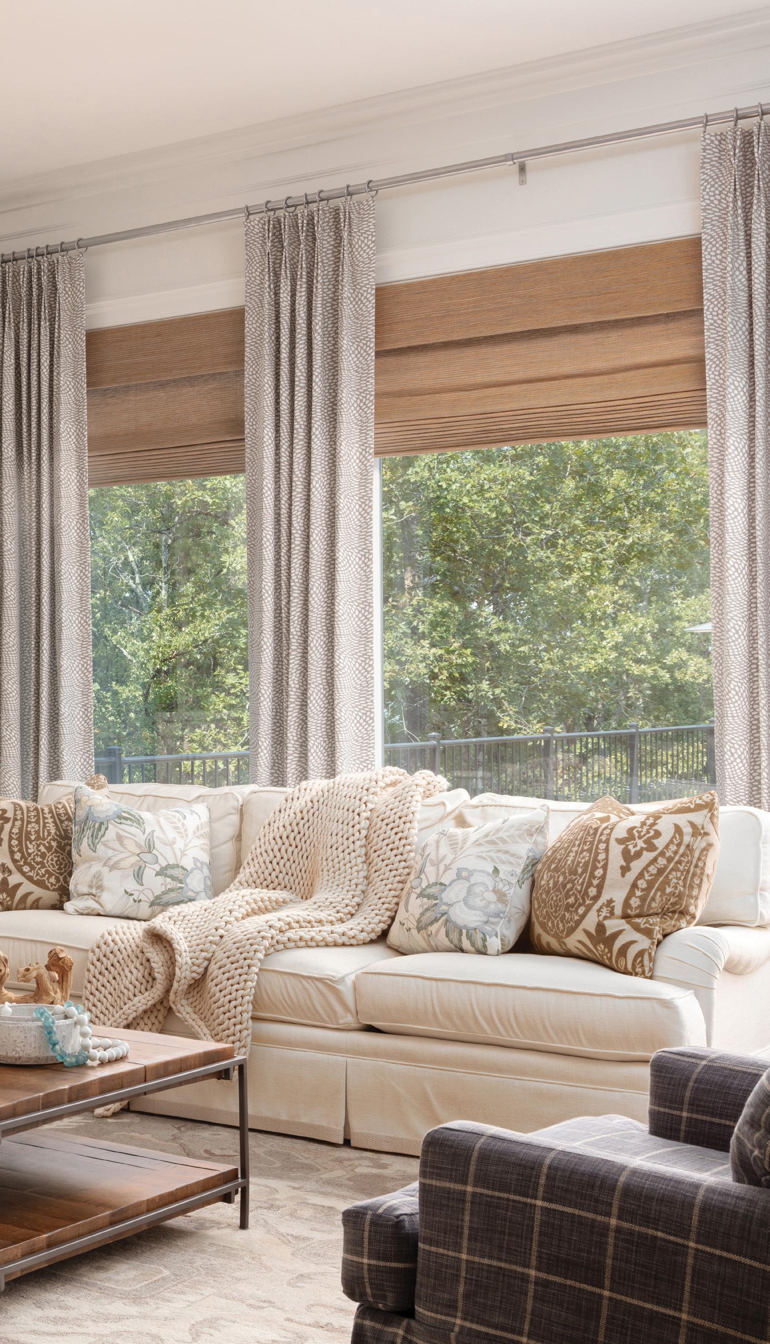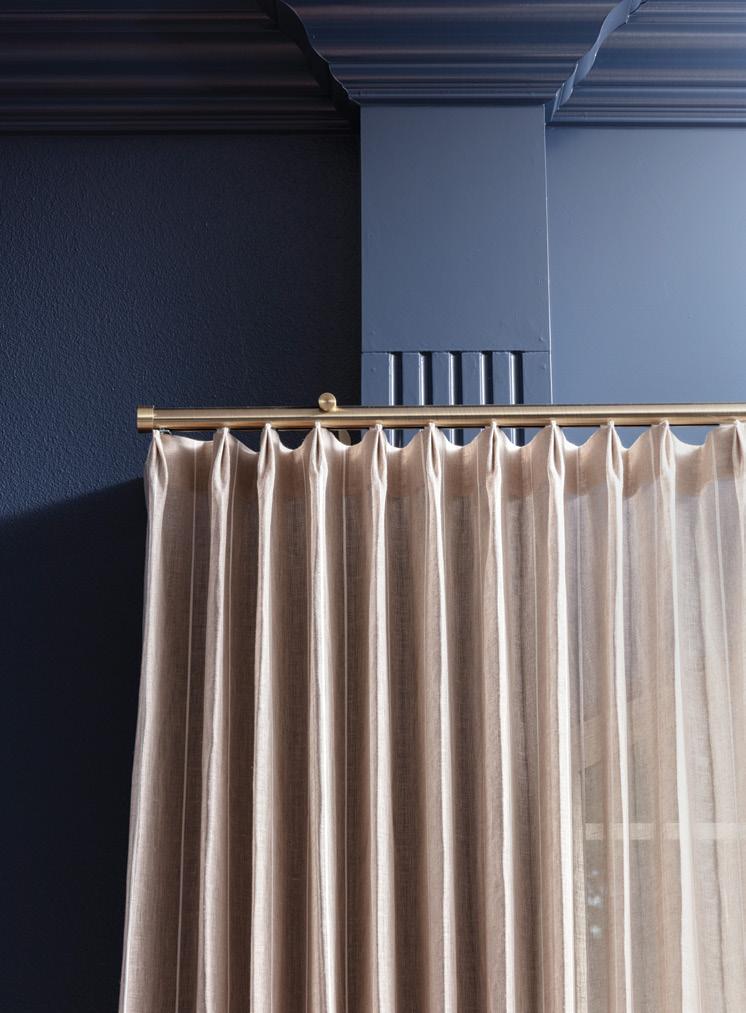 Custom, sheer curtains from Bentonville’s M Grace at Home contrast with the dark navy walls and allow light to flow into the room. A subtle plaid stripe runs through the fabric, tying it to the runner on the table.