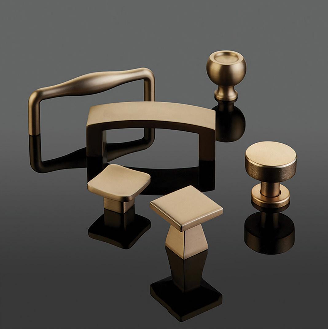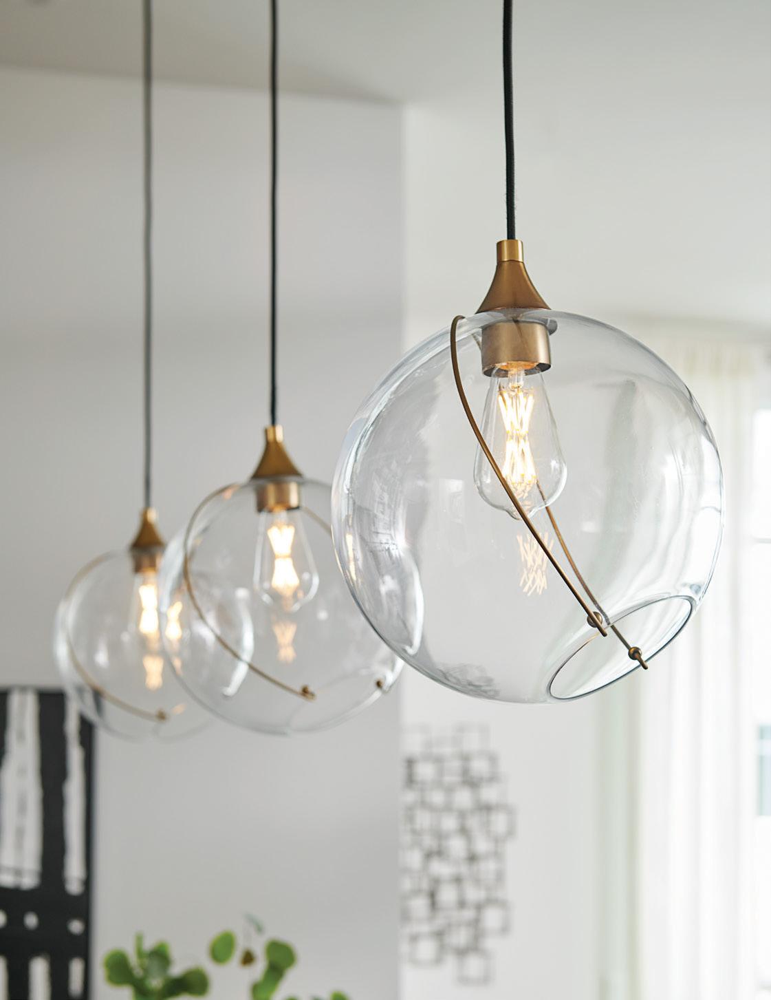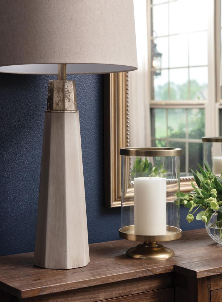The sideboard holds a mix of accessories that are united by their brass and gold finishes. The pair of stone-base lamps have a gold leaf band that plays off the mirror and hurricane candleholders.