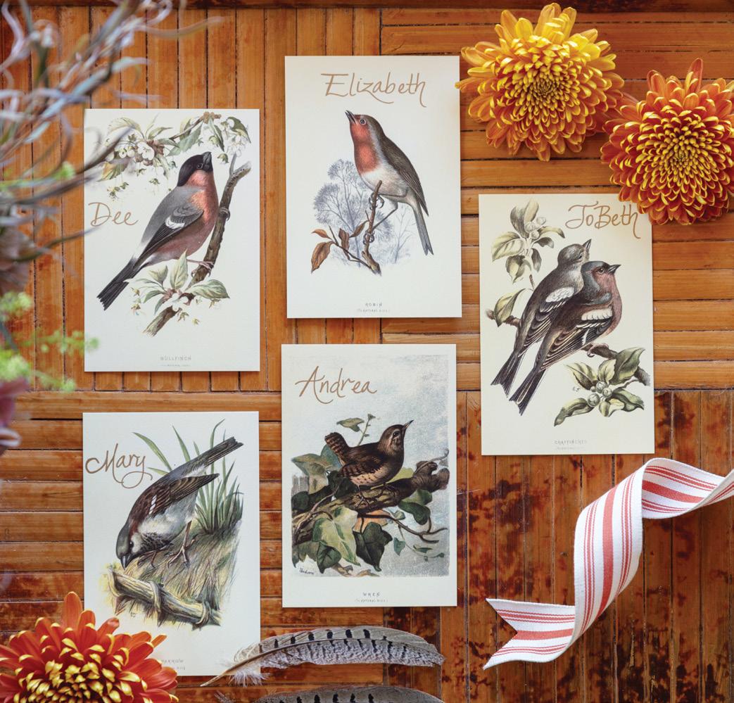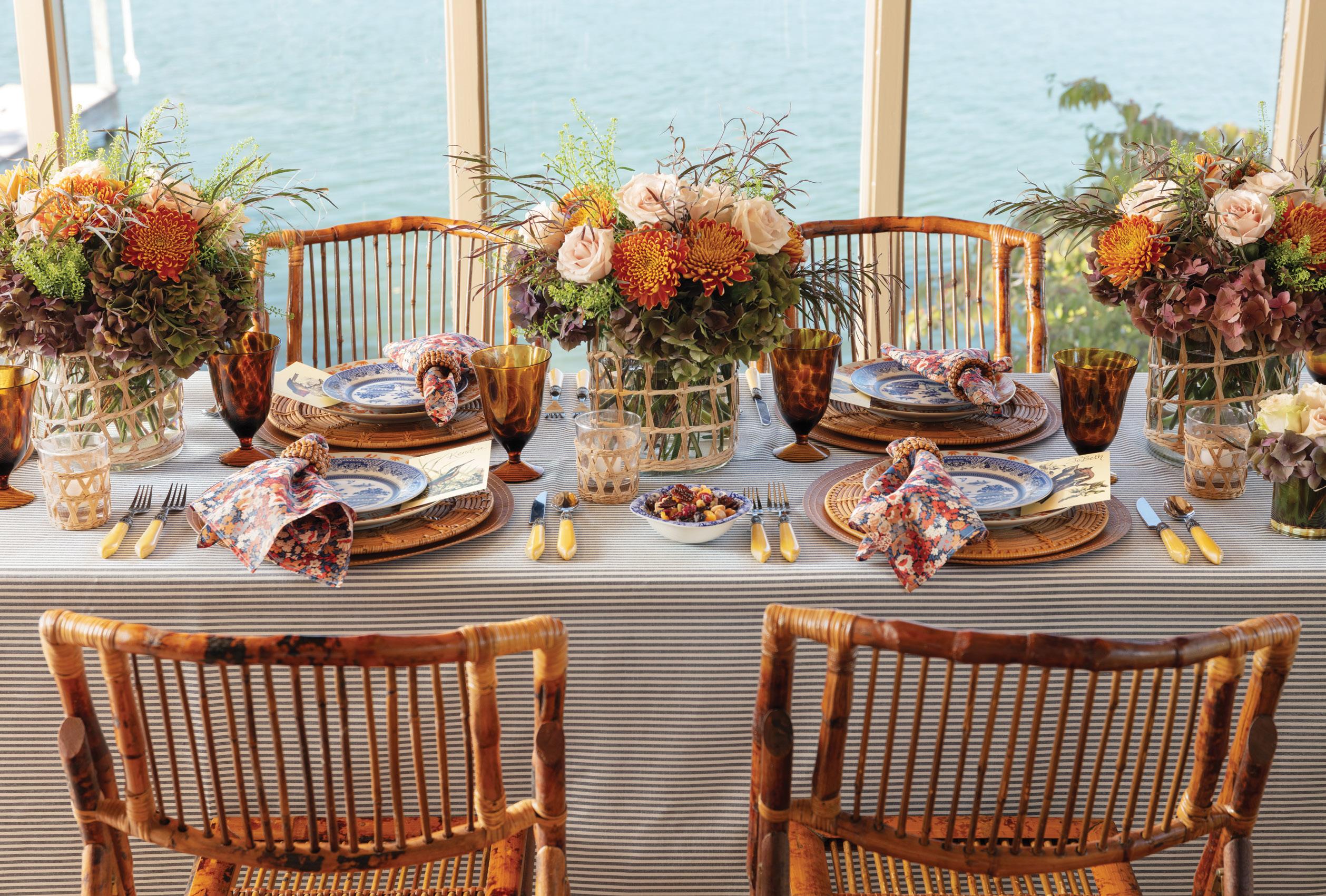 into the design, all tied to the empty-nest concept. Vintage-inspired bird prints serving as place cards position this imagery at the forefront, and earthy textures such as rattan, leather, and bamboo bring the outdoors in. “I kept the colors soft, muted, and fallish with a touch of blue tied in,” the designer says, noting the hue is Kendra’s favorite. “I just love the idea of that blue-and-white stripe for the tablecloth because it’s perfect for the lake, but it’s an unexpected fall color.”