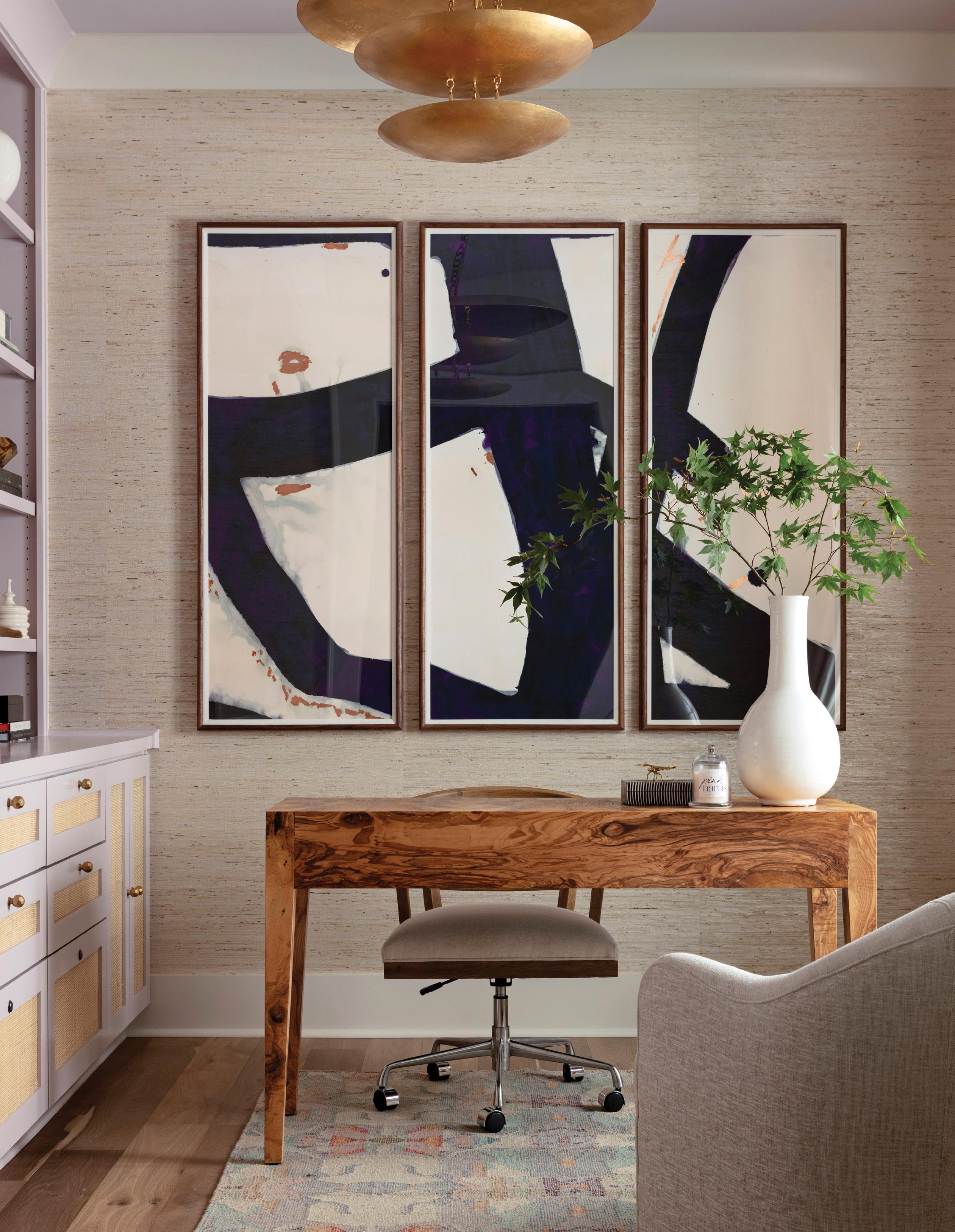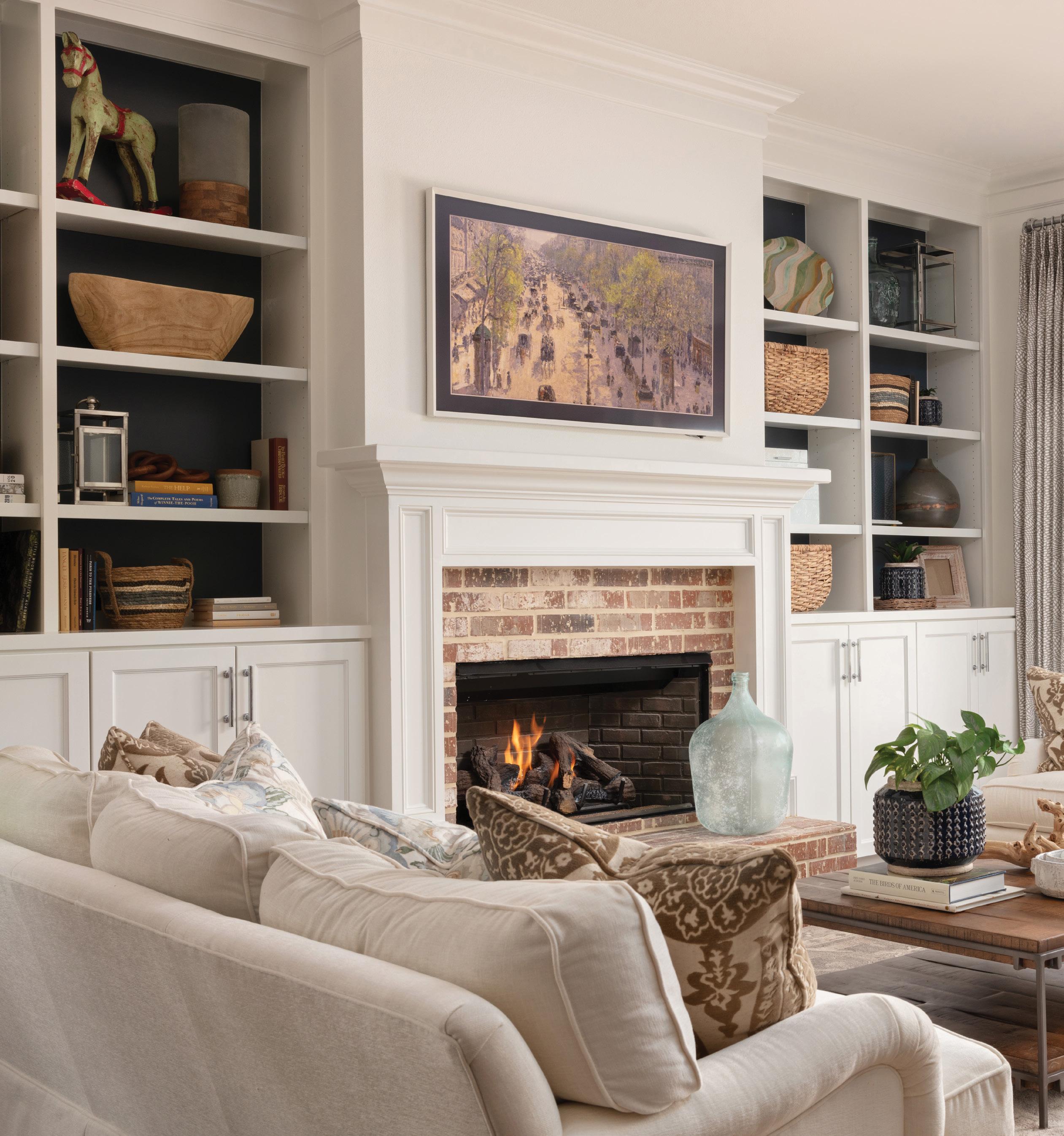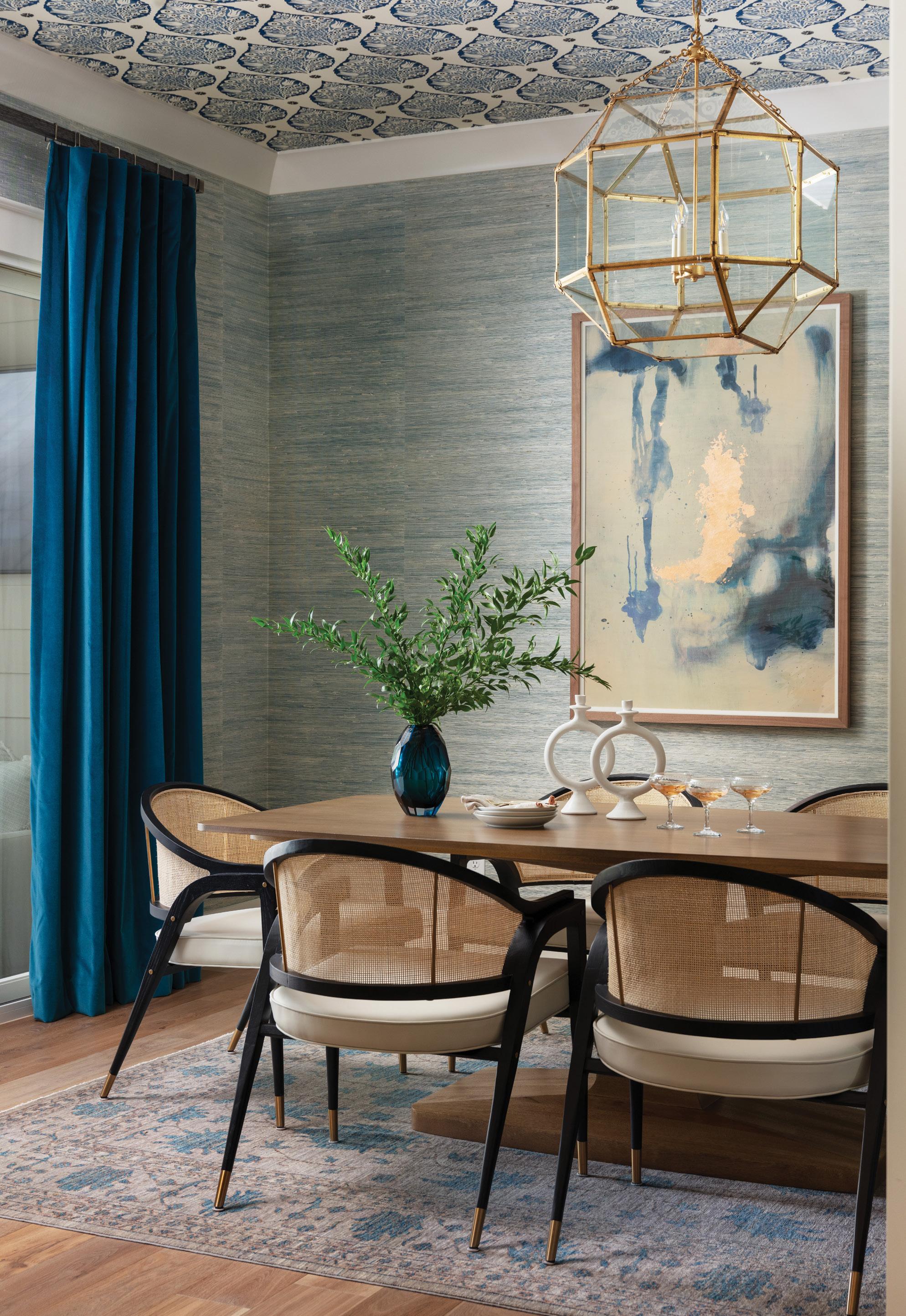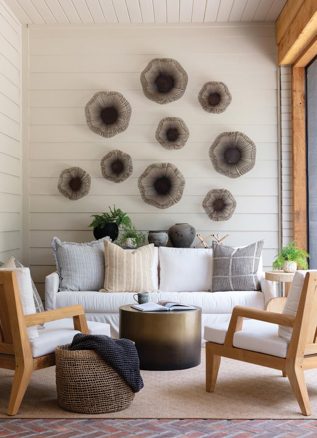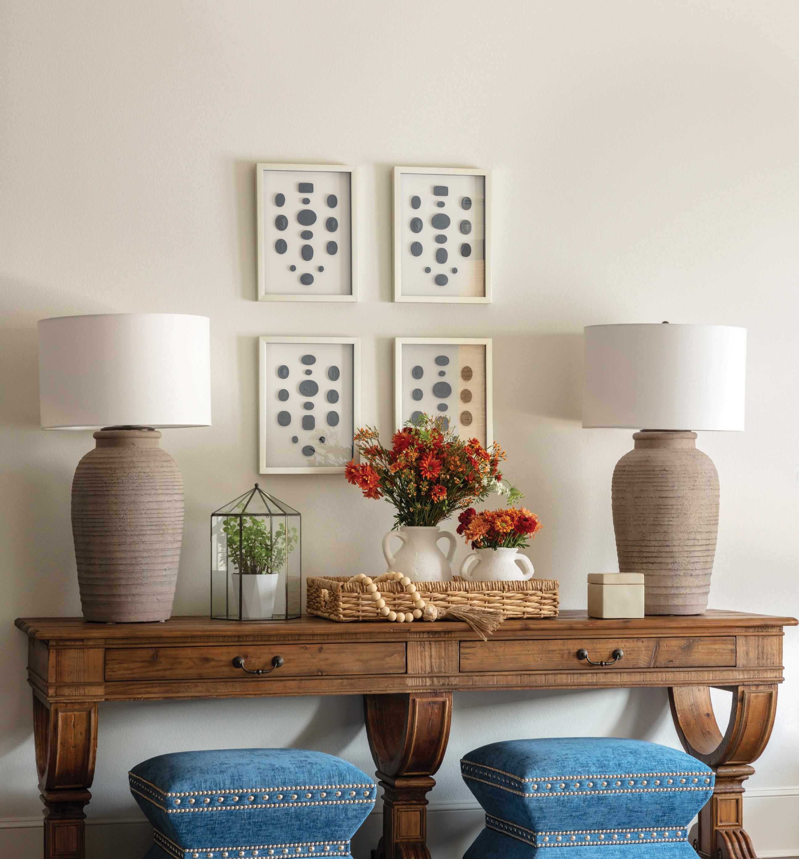 Tasked with creating a cozy space reflective of the couple’s style, Corey took cues from a hue in the nearby living room. “I’m drawn to a Southern blue-andwhite look,” Jo Ann says, noting that she likes numerous collectibles while her husband’s taste is more streamlined. The couple looked to Corey to balance the two styles. “I host Thanksgiving every year, and while I do use china to serve, we still want it to feel comfortable,” Jo Ann adds. Corey traded beige for a rich navy on the walls to create depth and visual interest. Slipcovered host chairs and upholstered side chairs surround the table to encourage long meals as well as conversation, while brass accents add polish to the room. “It was a full-circle moment of healing to have this makeover complete,” Jo Ann says.