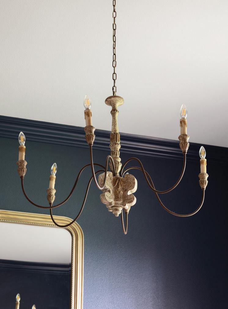With distressed accents of antique brass and oil-rubbed bronze as well as candelabra-style bulbs, the chandelier sets a traditional tone for the space.