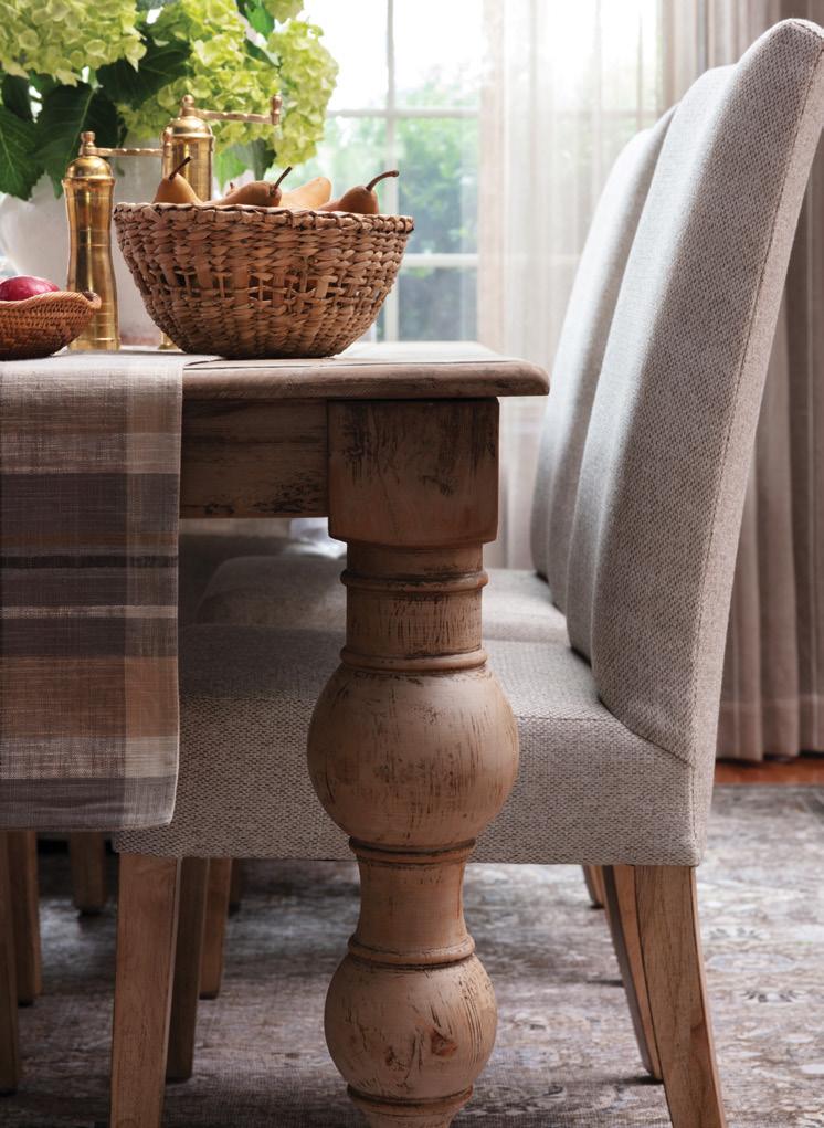 To accommodate the family and guests, Corey chose a traditional turned-leg table with a weathered finish. Comfortable chairs invite guests to linger after meals are finished.