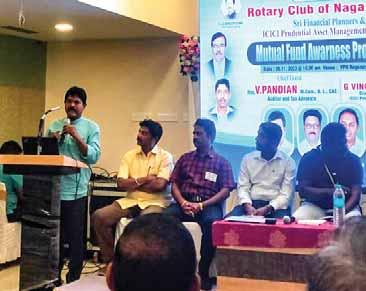 An awareness event on mutual funds was hosted jointly with Sri Financial Planners and ICICI Pru Asset Management Company. Tax consultant V Pandian gave a talk, while trainer G Vinoth Kumar provided valuable tips to the audience. AGs Avarani T Ananthan and K Sasikumar were present. Club president Karthikesan chaired the event.