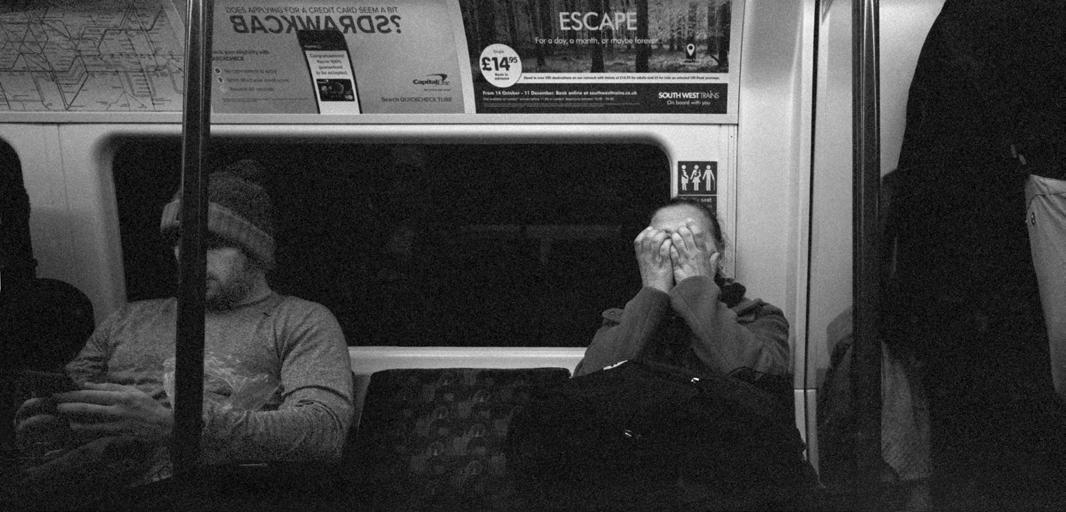The project title is a deliberate echo of Walker Evans’ ‘Many are Called’. As the founding father of public transport photography, Evans documented passengers on the New York subway between 1938 and 1941. There are similarities in the method employed by these respective projects. Both were shot on film (the XPan is a unique panoramic camera, with no digital equivalent), in monochrome (for aesthetic and practical reasons), and the portraits were not staged, catching the subjects unaware.