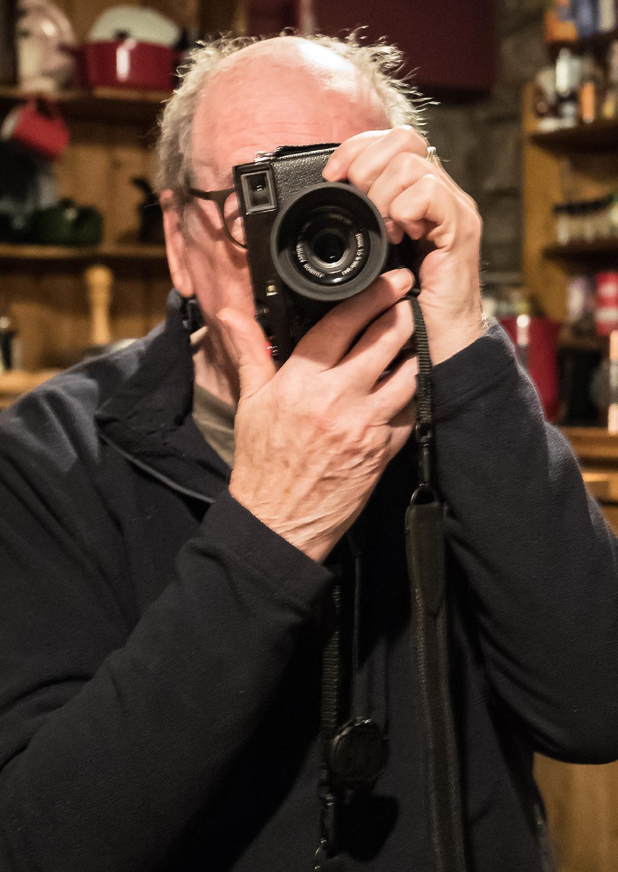 Our conversation turns to the practicalities of photography and as we take “dear diary” snaps (his words) of each other in his kitchen (his of me being infinitely superior to mine of him: pictured) he explains that he has always carried two cameras. In his film days they were Leicas. Now he shoots with the Fuji X Pro 2. One has a 28mm lens and the other a 50mm lens, so he can quickly swap between cameras without having to change lenses. Each camera has a coloured sticker on top (yellow and red) so that he can discretely glance down and select the right lens. He doesn’t shoot using the rear screen, preferring to place the viewfinder to his eye to compose. He has also customised each camera, adding a raised bump on the rear function button, again colour coded, so that he can easily fix the focus in advance of pressing the shutter. He chuckles at how “Fuji had a heart attack” when he showed them his handiwork!