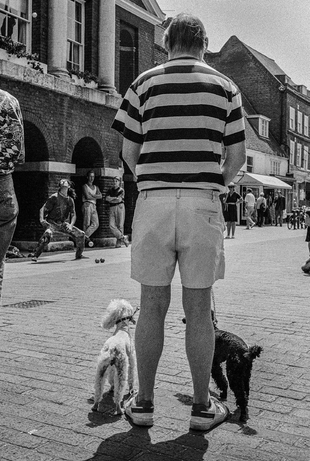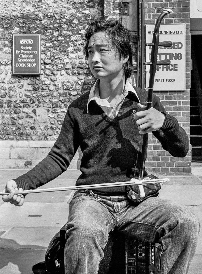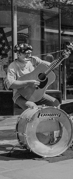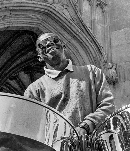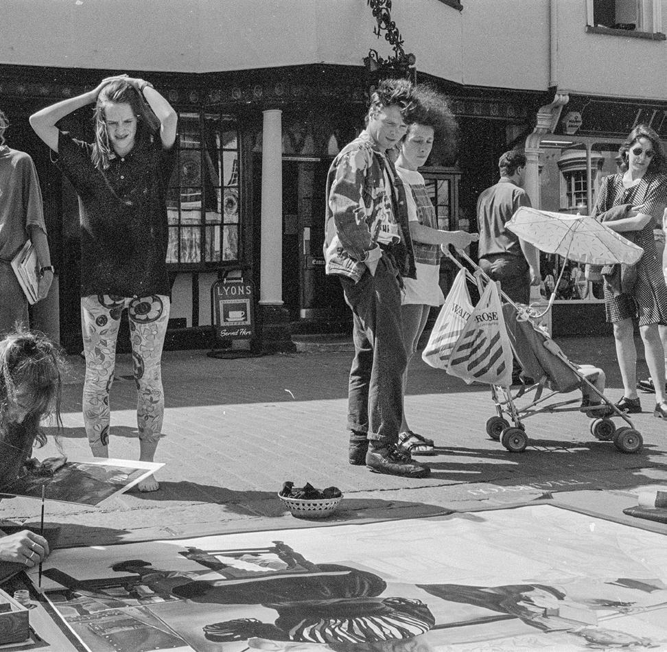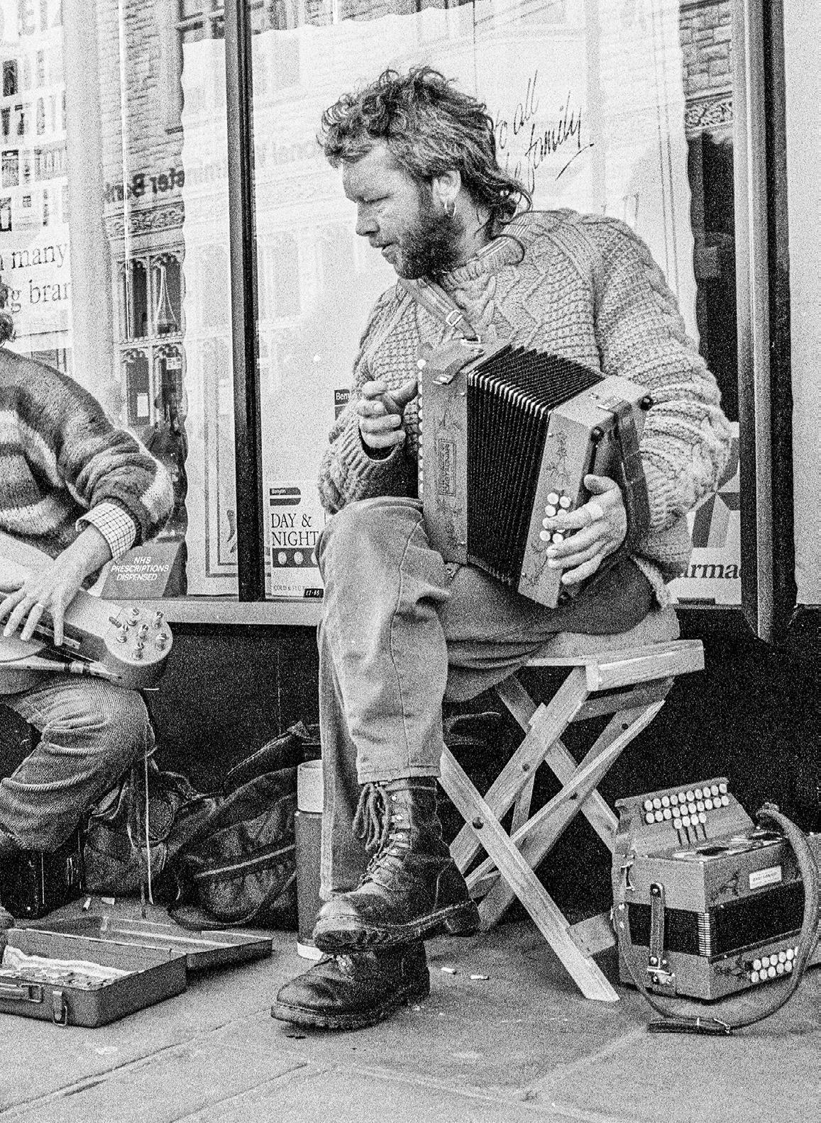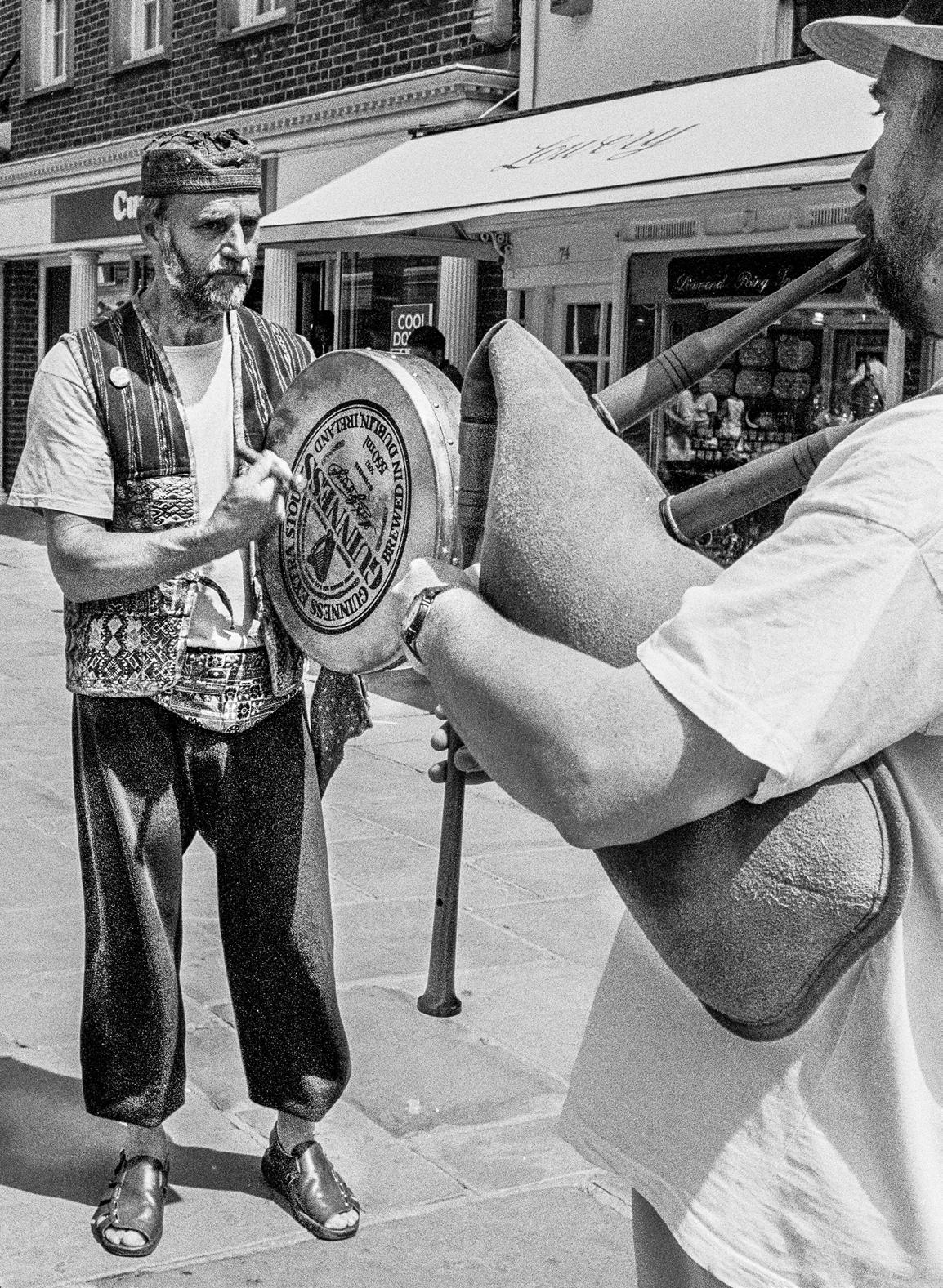 In the mid- to late-1990s, I was doing a course with the BFP (Bureau of Freelance Photographers) in which one of the assignments was “To present a photo essay suitable for submission to your local county magazine.” Sussex Life covers Chichester, where I live, and for a subject I chose ‘Street entertainment in Chichester.’ I opted to shoot in monochrome and use a Minox, this is a small, aperture-priority, semi-automatic, 35mm film camera with a fixed f2.8, 35mm manualfocus lens. Normally I would preset the lens to around f8 and focus to 10 feet which gives a reasonable depth of field. The beauty of this camera, despite its many drawbacks, is that when folded it is small and light enough to live in my shirt pocket, and more importantly, it is not conspicuous or intimidating. Ilford HP5 400ASA film was used throughout the project.