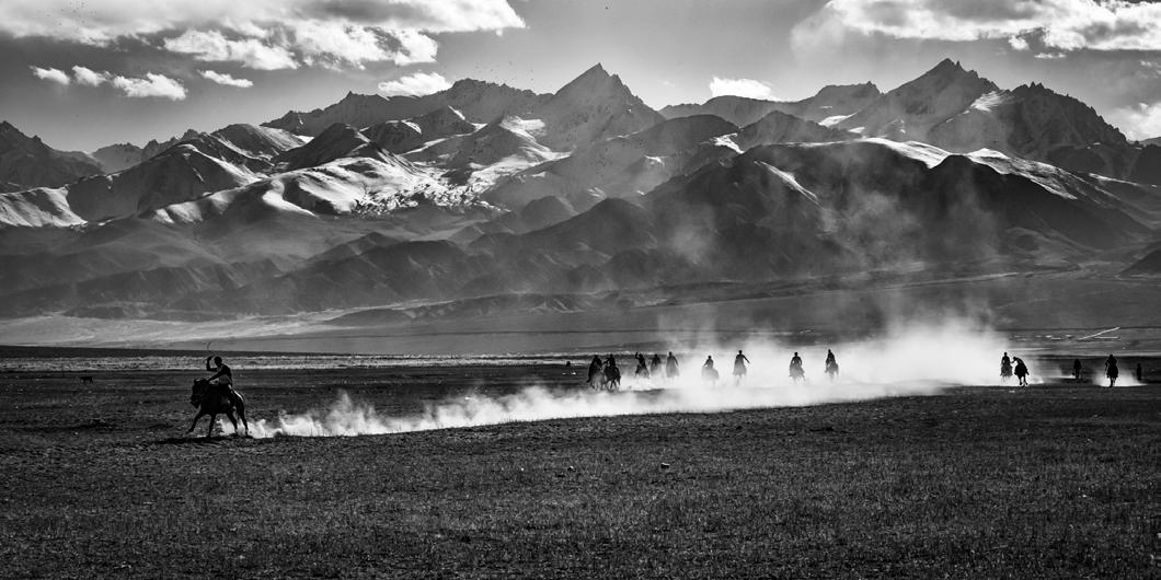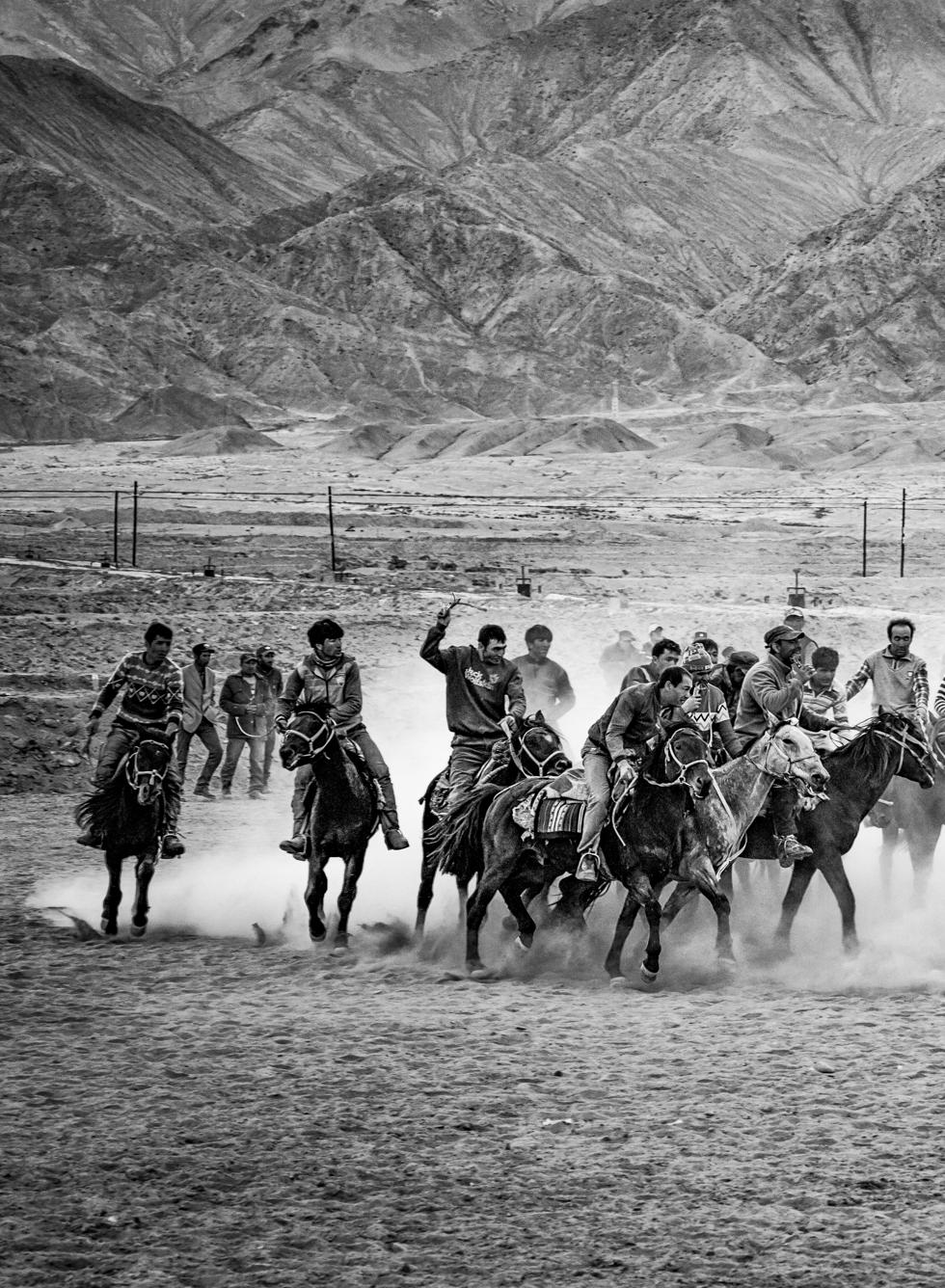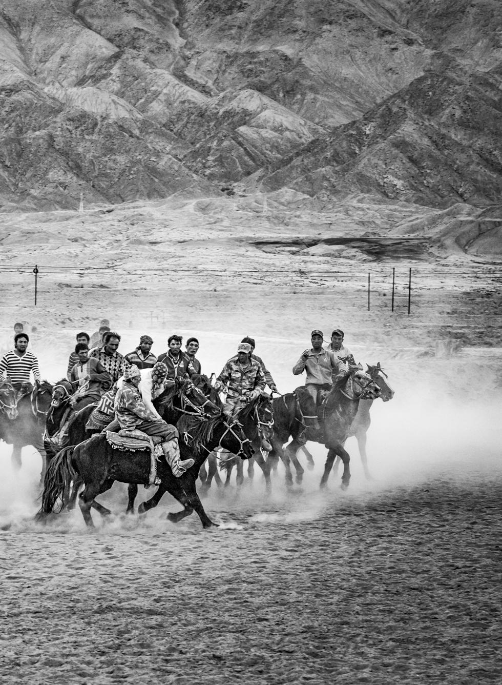 This unexpected photographic opportunity occurred on a trip along the ancient Silk Road across China. We were on the final leg of the trip travelling in the late afternoon at over 11000 ft along the Karakoram Highway from Kashgar to Taxgorgan. Taxgorgan is the last town of any size before the summit of the Karakoram Pass and the border between China and Pakistan. Our guide spotted a game of Buzkashi being played on the plateau in the distance, so we quickly changed our itinerary. Buzkashi is primarily an Afghan game; often referred to as the national game of Afghanistan. However, variations of it are played by all of the ethnic tribes of Central Asia. This particular game was being played by Tajik tribesmen.