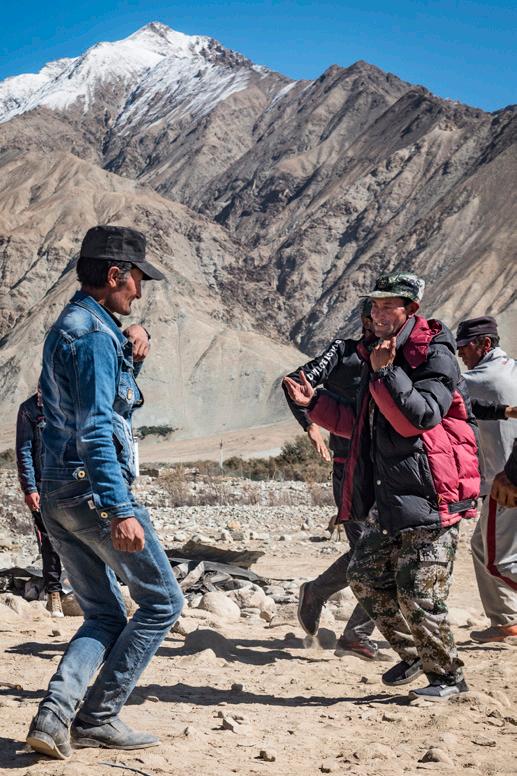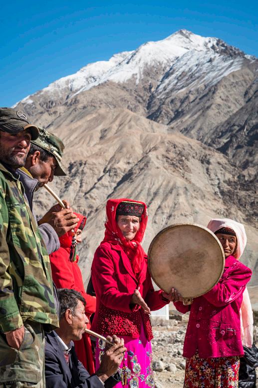 The next day, we again changed our plans to spend a couple of hours at the wedding. This was a very informal affair, held outdoors around the new home of the bride and groom, with anyone and everyone invited and lasting all day (unfortunately we had to leave before the actual ceremony). It was a big social occasion for the entire neighbourhood – people arrived on foot, horseback or motor-bike; music was provided by women on tambourines and men on flutes; the women dressed up a bit, the men less so; there was traditional dancing (men with men, women with women); and one group of men immediately engaged in a long-running card-game – to which the majestic Karakoram and Pamir ranges provided an impressive backdrop!