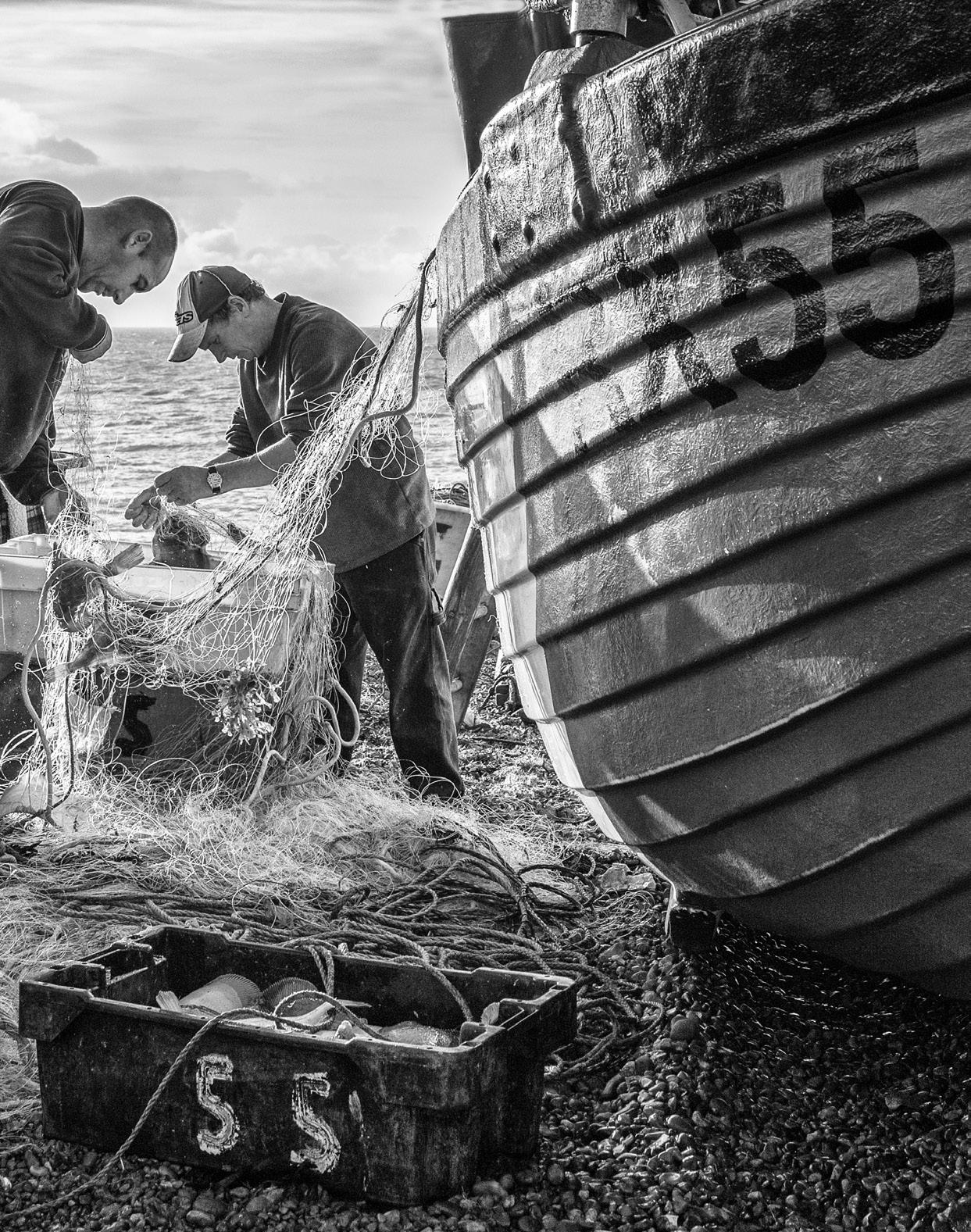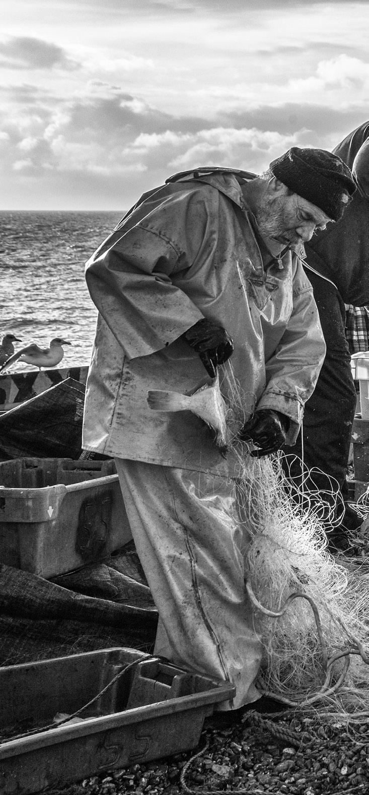I started photographing the fishermen on The Stade in Hastings in 2013, initially candidly. They got used to me popping up every now and then and as they got to know me were happy to spend time chatting about their latest trip out to sea, the size of the catch, a grumble or two about the dreaded quotas imposed and the EU. I enjoyed talking to them and seeing the world from their perspectiveand it is this aspect of my photography which is really important to me.