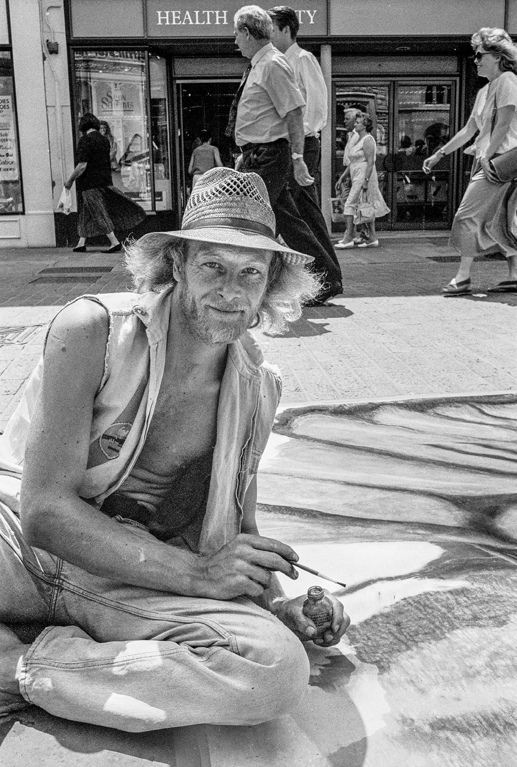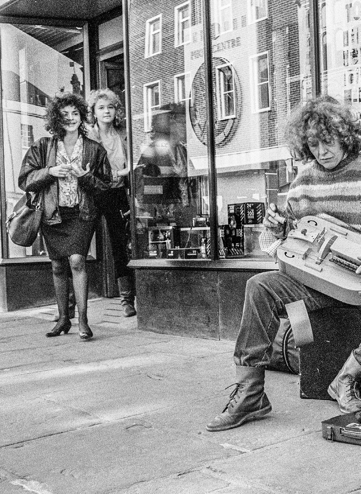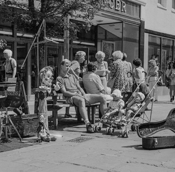 people. It probably took about 18 months before there was enough material for a draught submission but, ironically, when I approached ‘Sussex Life’ I was told that they liked the concept and pictures, but unfortunately were about to become a full colour publication. The picture that gave me the most satisfaction, although rather cluttered, is ‘The likely lads’; two unconventional characters from Liverpool with their grotesque puppets dangling from coat hangers. With the camera resting on the pavement this was the only shot where their pose echoed the mannequins in the window, it was pure luck that they were just in the frame. My most embarrassing moment was after talking to two children’s entertainers and, as usual explaining what I wanted to do, they waited until I had crouched down and taken the camera from my pocket before announcing over the megaphone “Ladies and gents, boys and girls, we are very fortunate today that this gentleman has travelled all the way from Fleet Street in London to take your photographs for the Daily Telegraph!”