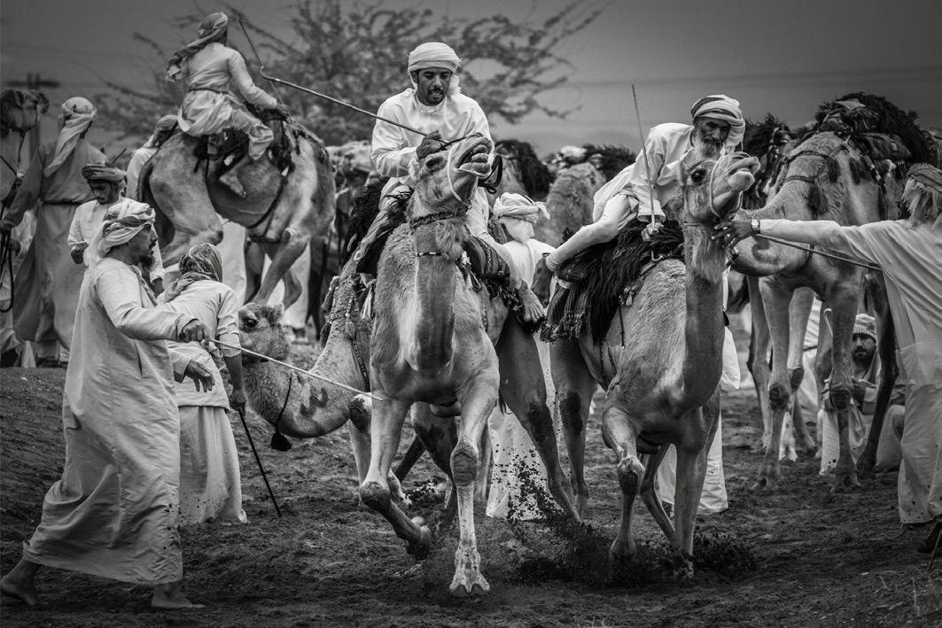 For this project, on the tradition of Camel Ardha, I decided to show the story in a rich black and white, just to be able to focus better on the essence of the image. It helped that the white dishdashes worn by the men form a nice contrast in these black and white images.